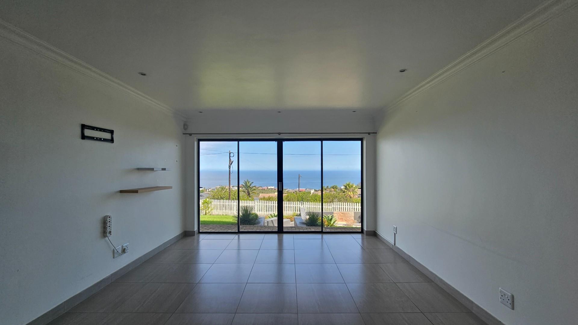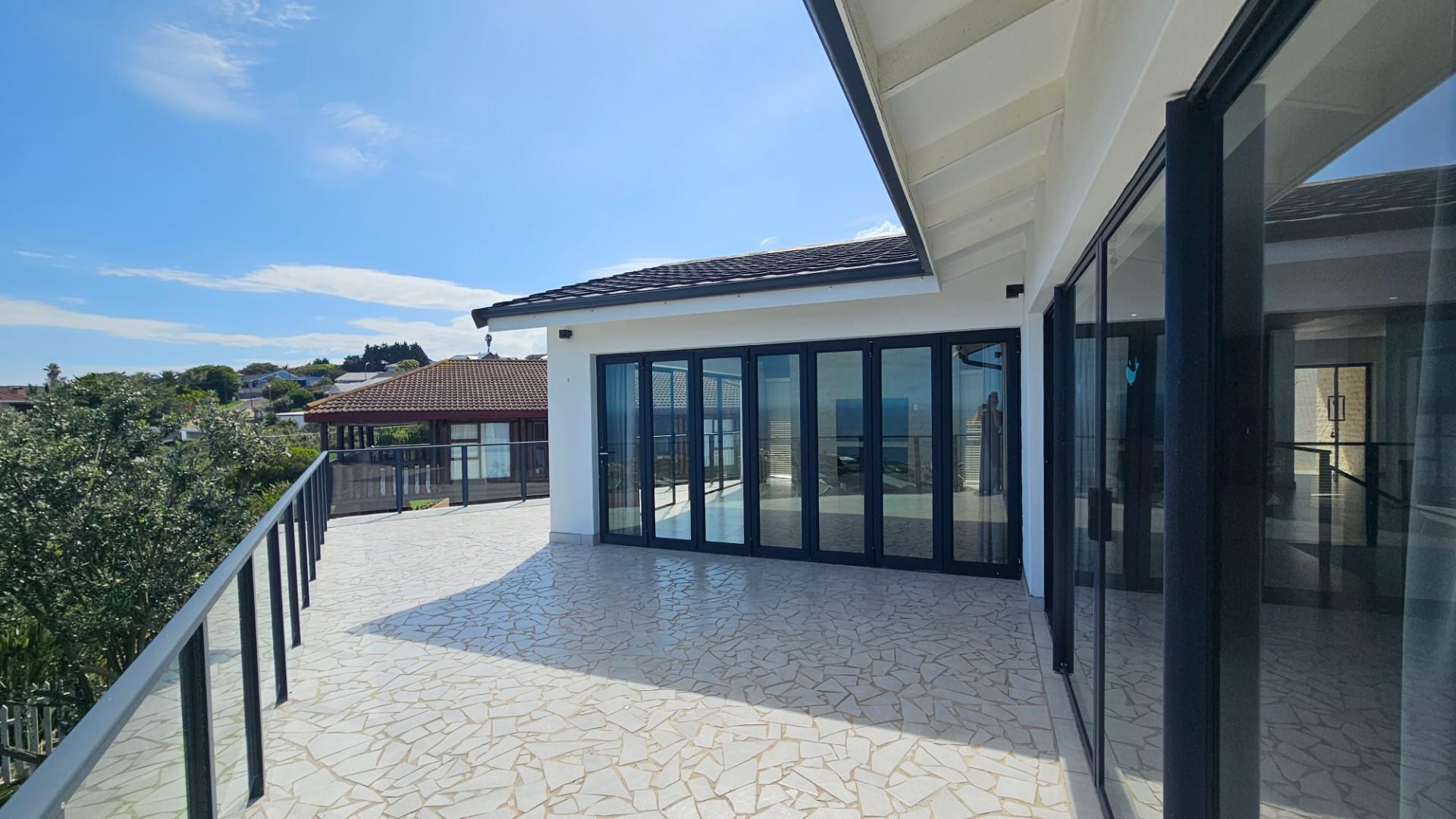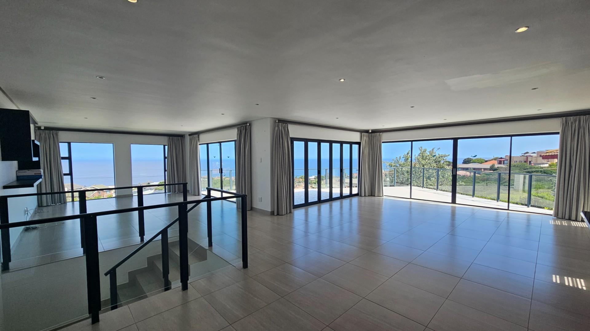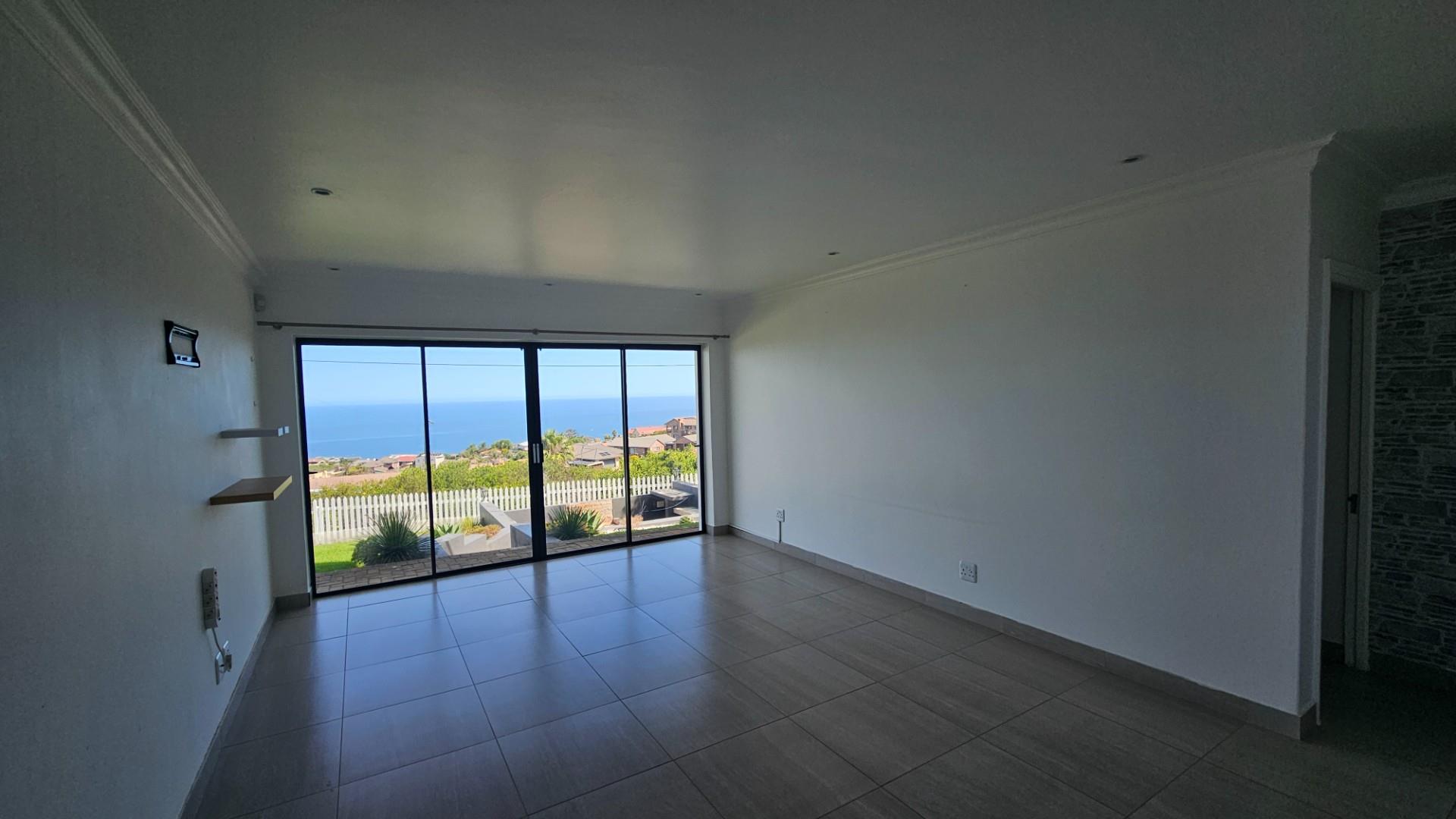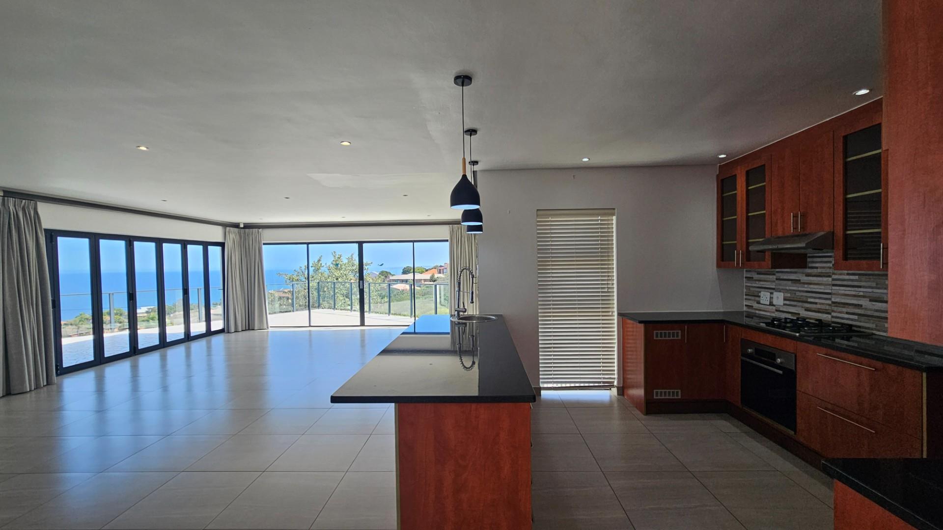 Upon entering the home through an elegant swivel glass door, you are welcomed into a light-filled open-plan living and dining area. This inviting space features a built-in braai and seamlessly extends onto a balcony, where uninterrupted 180-degree ocean views create the perfect setting for both relaxation and entertaining. The modern kitchen forms the heart of the home, offering a functional and stylish layout, complemented by a separate scullery and laundry area to ensure convenience and practicality.