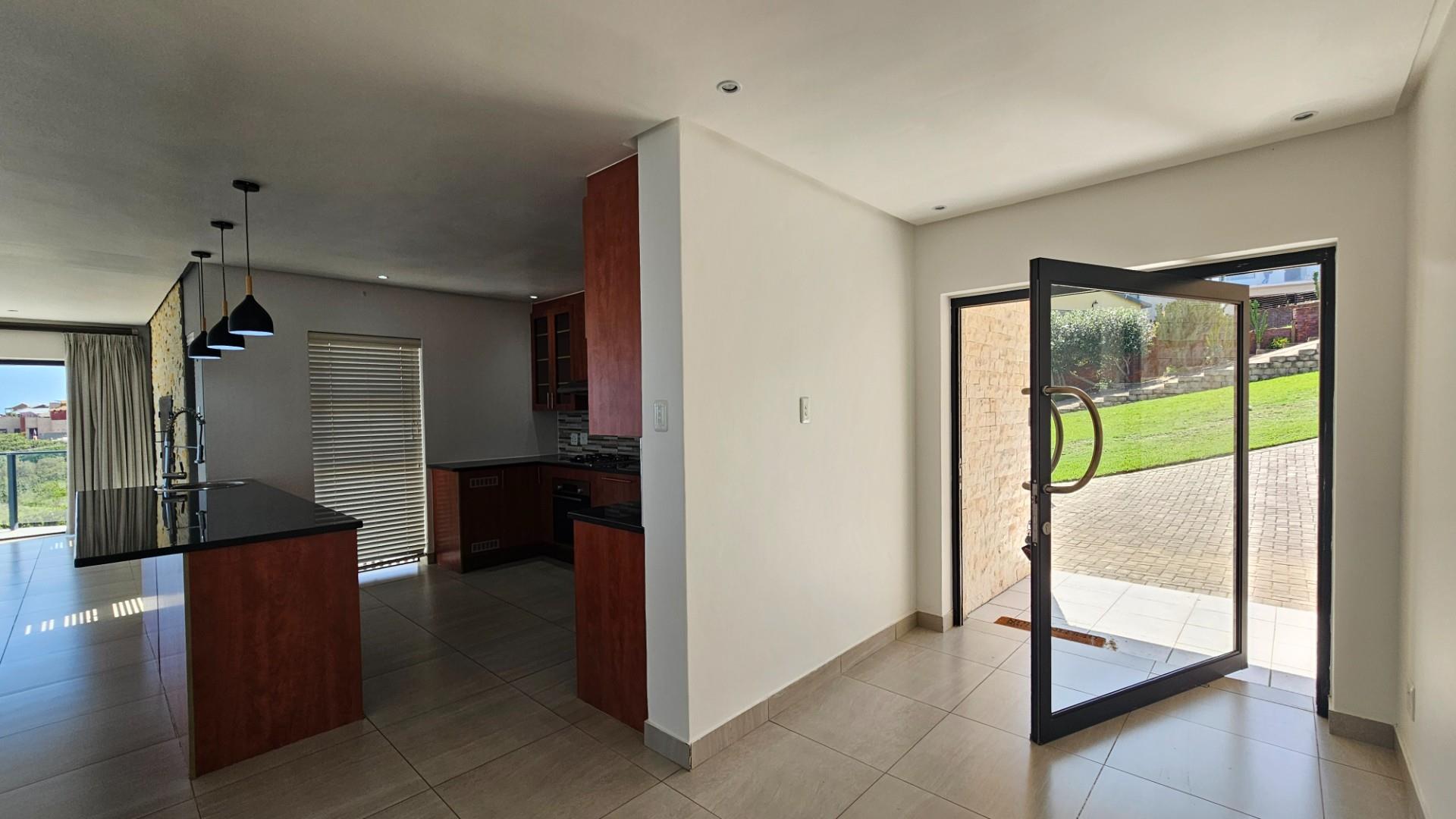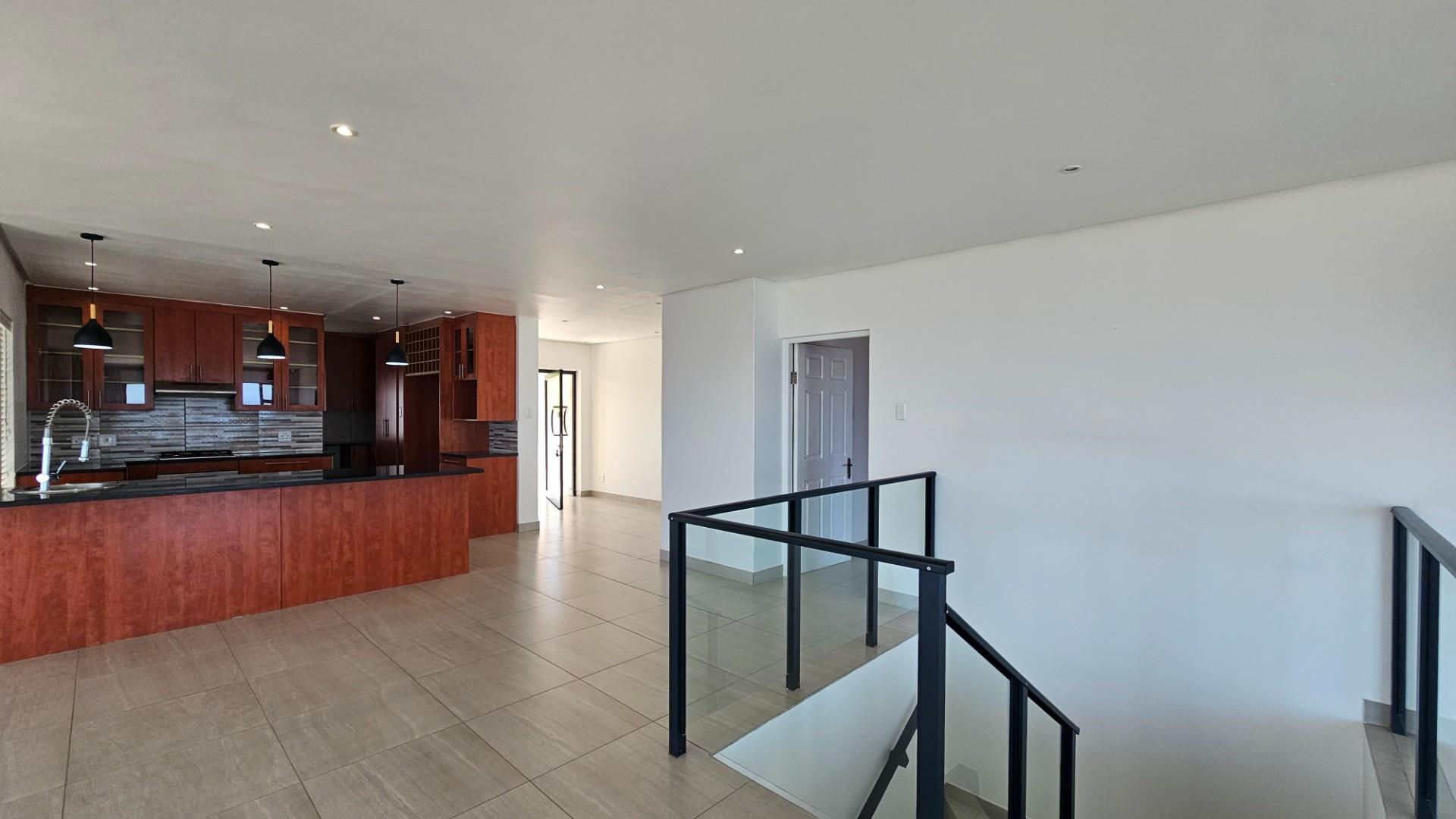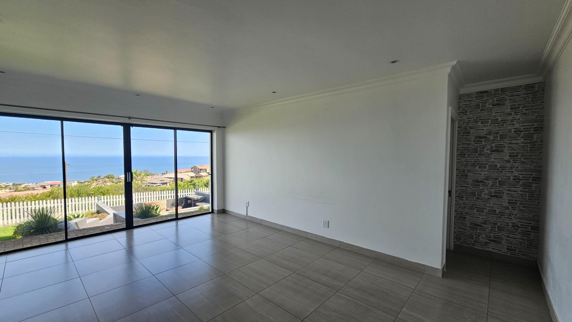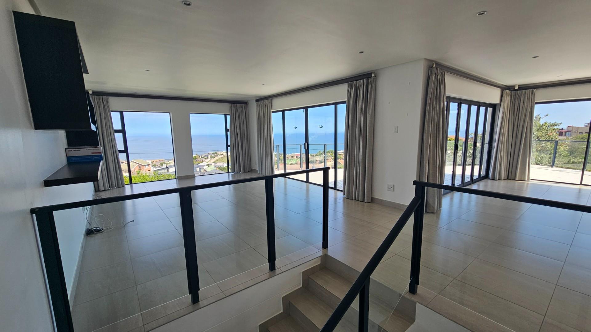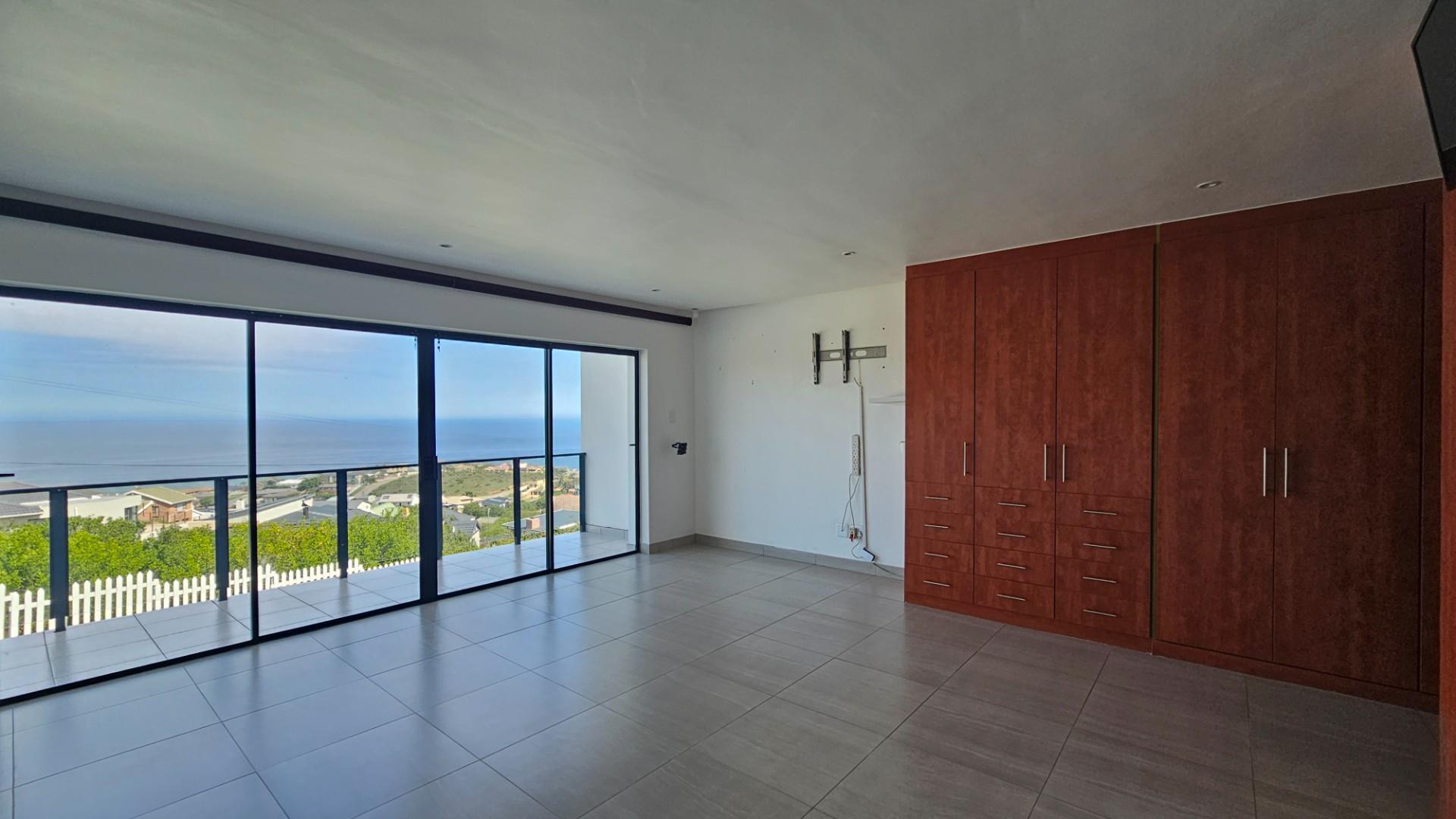 Upon entering the home through an elegant swivel glass door, you are welcomed into a light-filled open-plan living and dining area. This inviting space features a built-in braai and seamlessly extends onto a balcony, where uninterrupted 180-degree ocean views create the perfect setting for both relaxation and entertaining. The modern kitchen forms the heart of the home, offering a functional and stylish layout, complemented by a separate scullery and laundry area to ensure convenience and practicality.