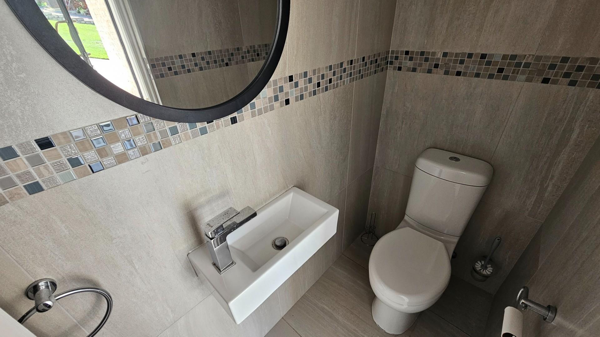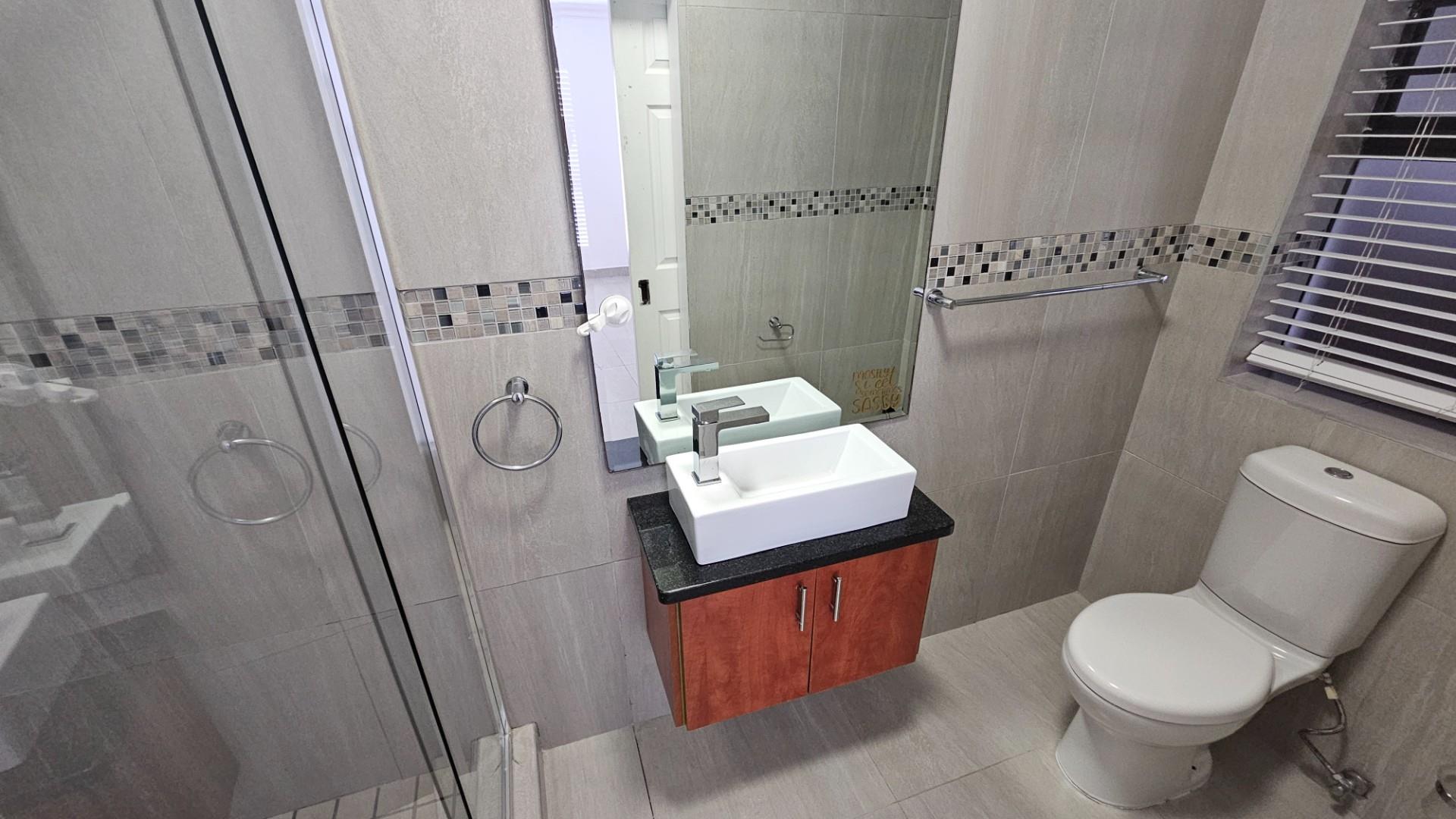 The lower level of the home offers additional versatility, featuring a spacious area that can be utilised as a gym or second living room. On either side of this space are two well-sized bedrooms, each with its own en-suite bathroom. Both bedrooms open out onto the front garden, where a lush green lawn and a boma area create an ideal outdoor space for entertaining or enjoying quiet evenings.