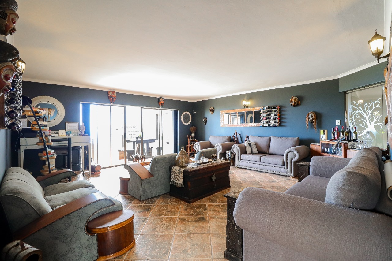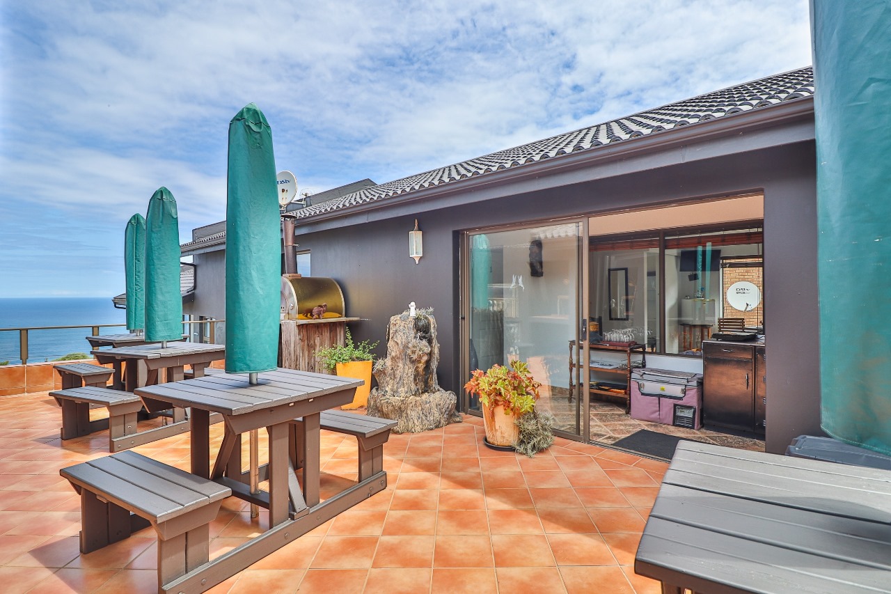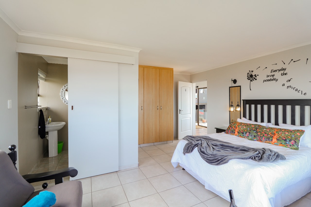 The upper level of the home offers a modern kitchen and dining area, which leads to a balcony complete with a built-in braai and sweeping views of the surrounding green belt and ocean. This level also houses four en-suite bedrooms, each designed for relaxation and comfort. The jewel of the upper floor is the honeymoon suite, which boasts a private balcony with a charming Romeo and Juliet feature, adding a romantic touch to the serene setting.