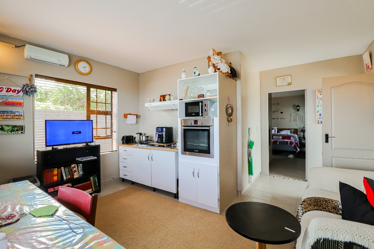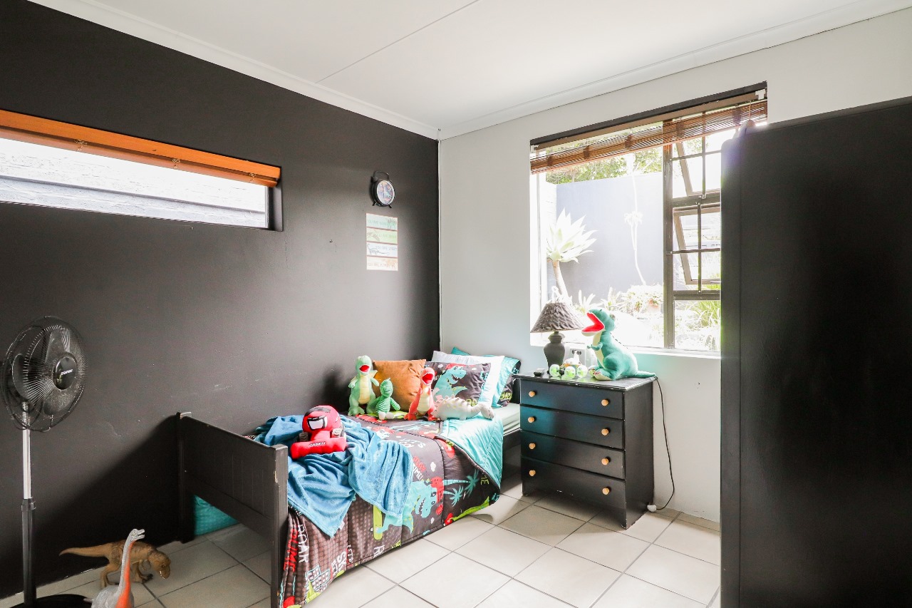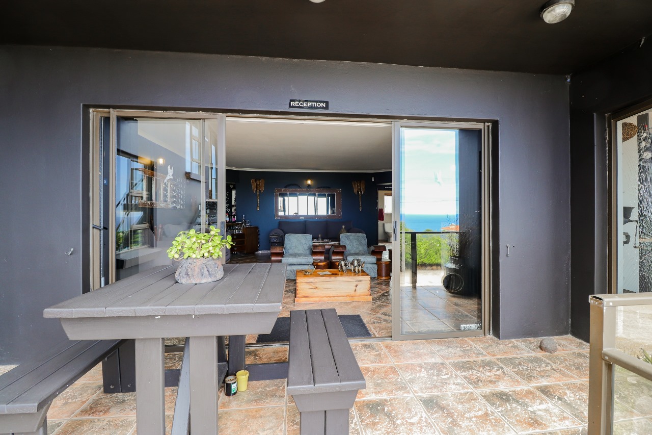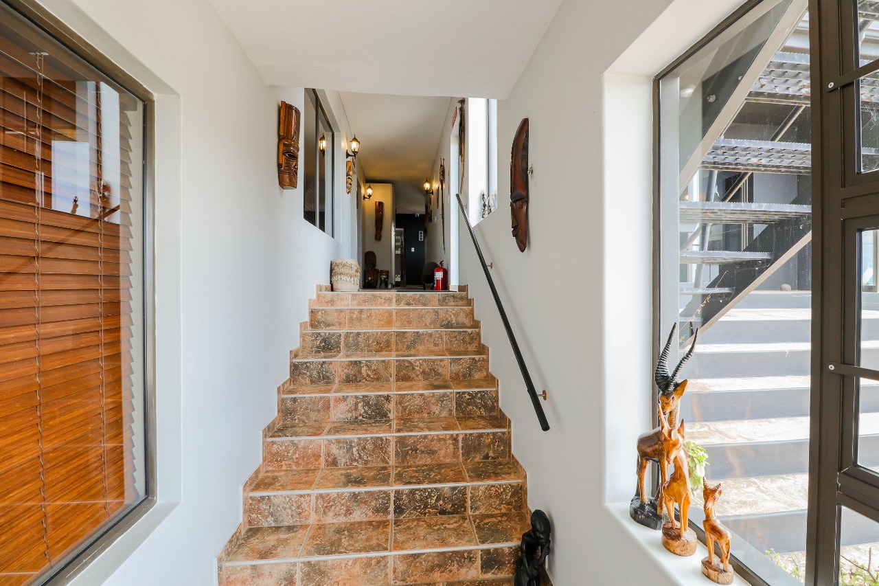 The upper level of the home offers a modern kitchen and dining area, which leads to a balcony complete with a built-in braai and sweeping views of the surrounding green belt and ocean. This level also houses four en-suite bedrooms, each designed for relaxation and comfort. The jewel of the upper floor is the honeymoon suite, which boasts a private balcony with a charming Romeo and Juliet feature, adding a romantic touch to the serene setting.