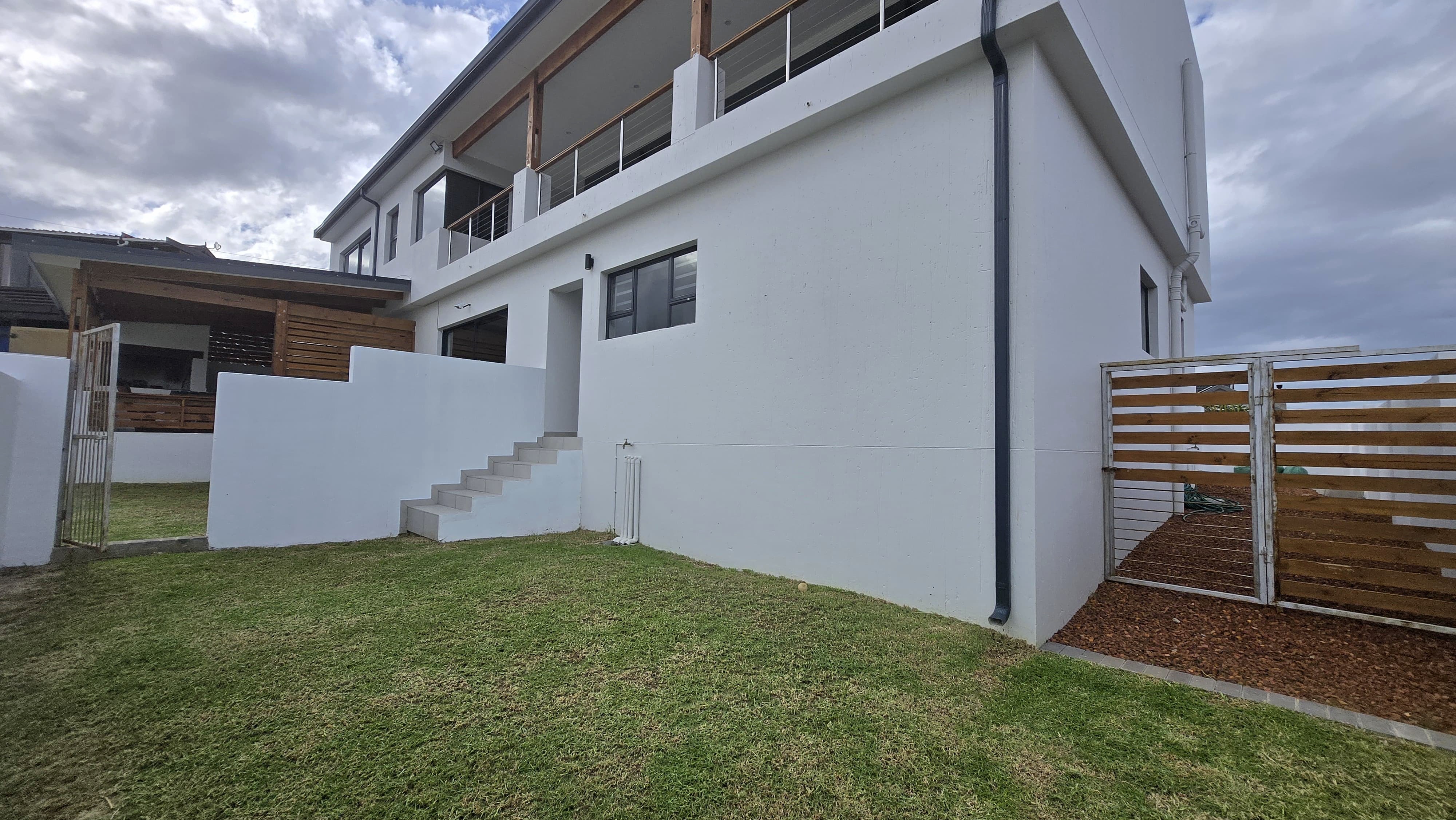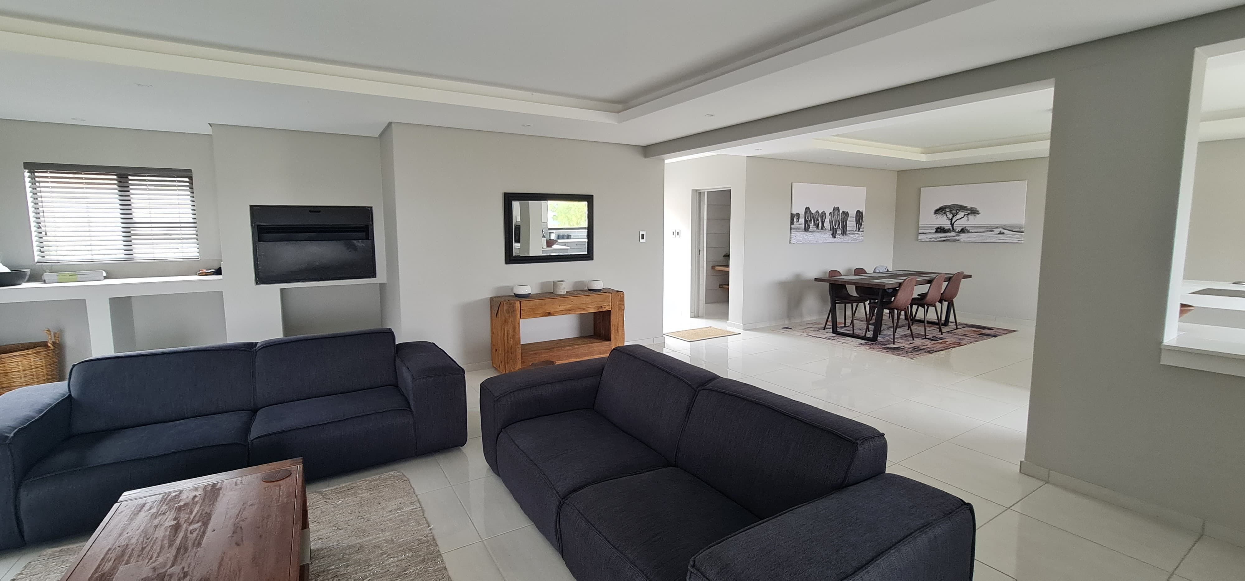 Downstairs, open-plan living takes centre stage — with a sleek kitchen, separate scullery and pantry, and seamless flow to the dining and lounge areas. A built-in braai/fireplace adds warmth and atmosphere, while stackable doors open to a covered patio with another built-in braai and panoramic sea views.