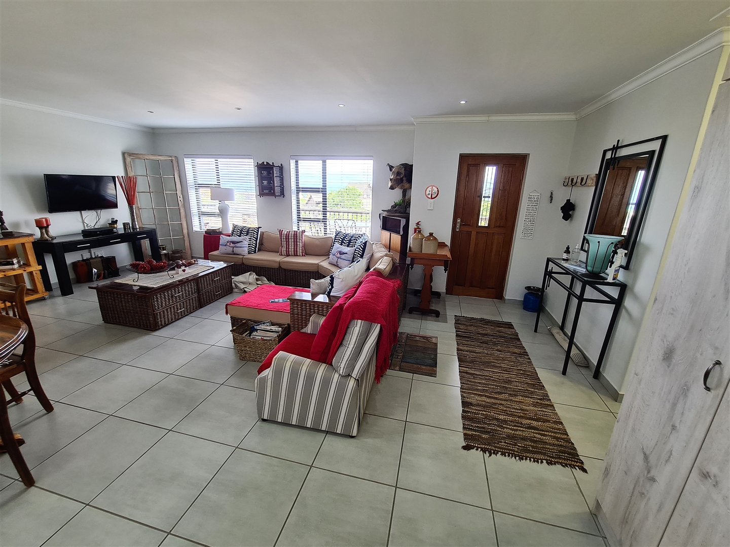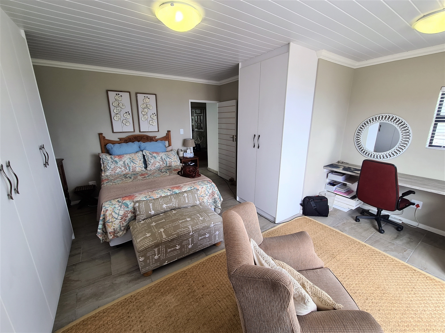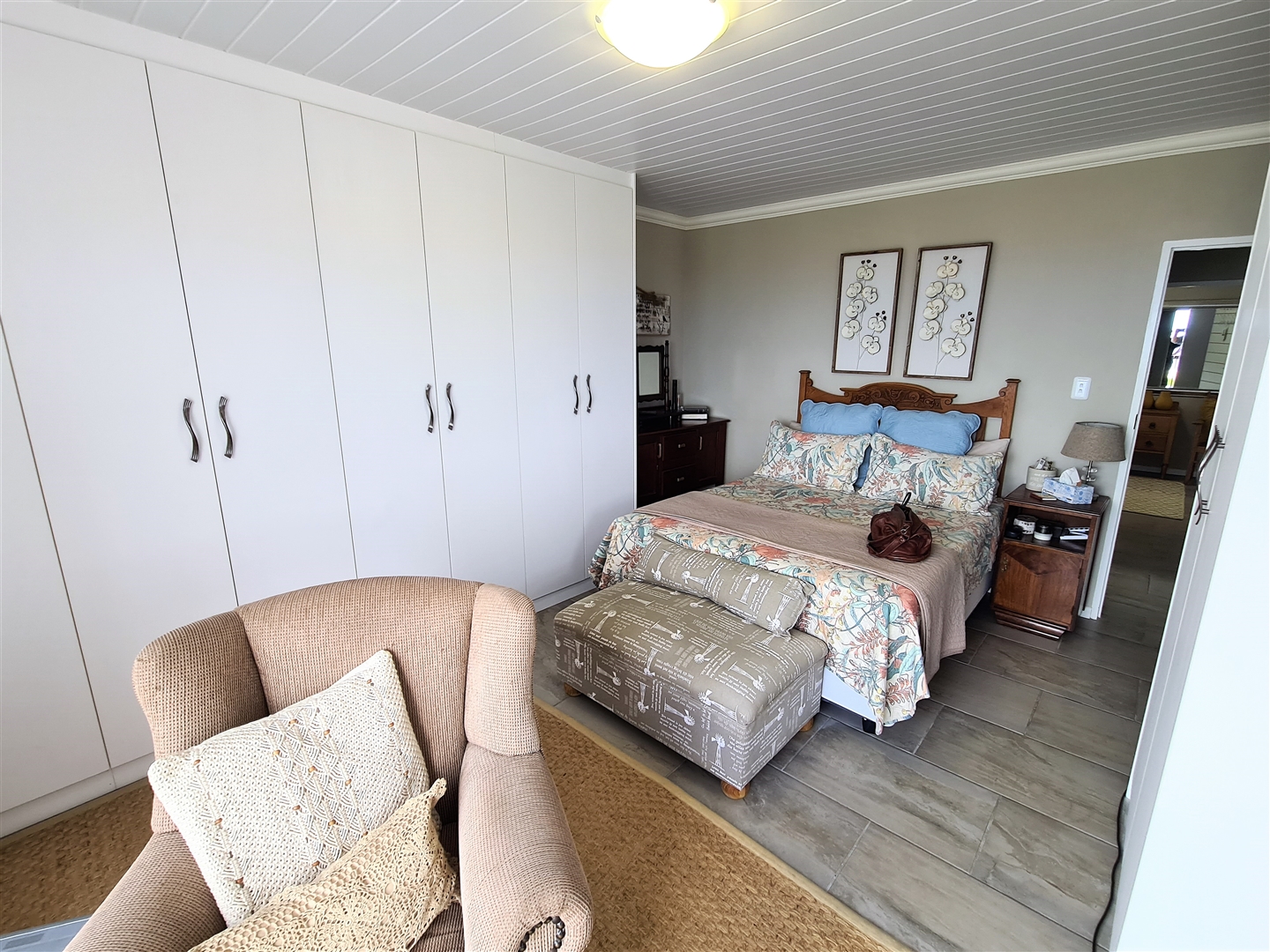 The open-plan lounge and dining area seamlessly flow onto a large deck with a built-in braai, perfect for entertaining while taking in breathtaking views of Boggoms Bay and Vlees Bay. The master bedroom also opens onto the patio through sliding doors, equipped with trellis doors for added security.