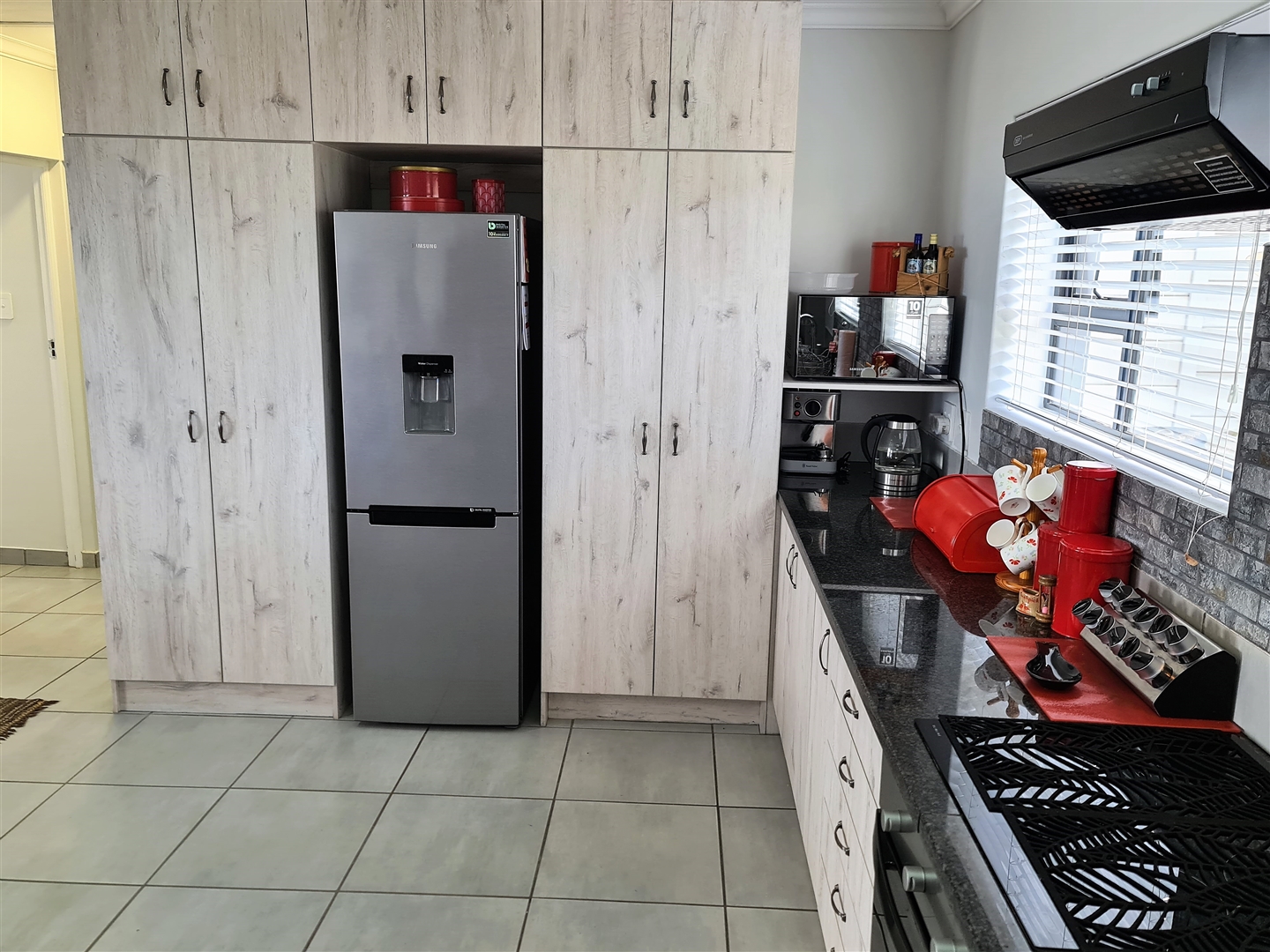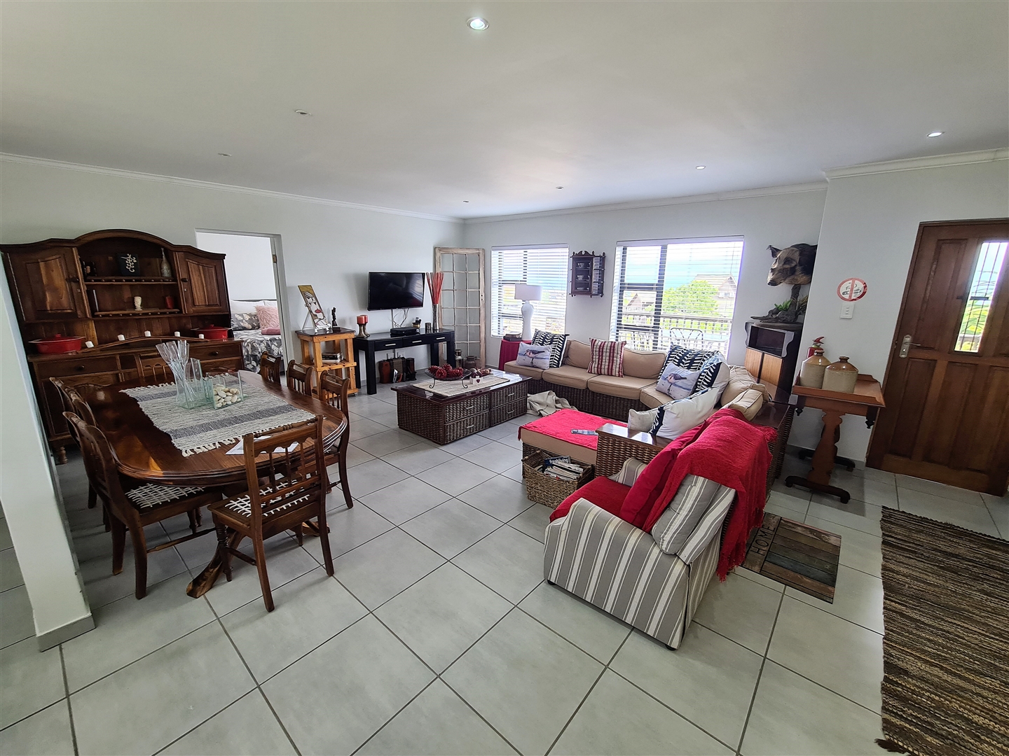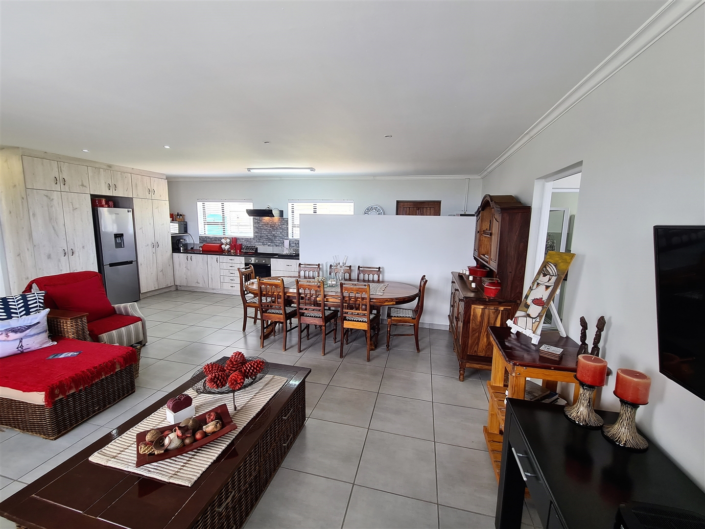 The open-plan lounge and dining area seamlessly flow onto a large deck with a built-in braai, perfect for entertaining while taking in breathtaking views of Boggoms Bay and Vlees Bay. The master bedroom also opens onto the patio through sliding doors, equipped with trellis doors for added security.