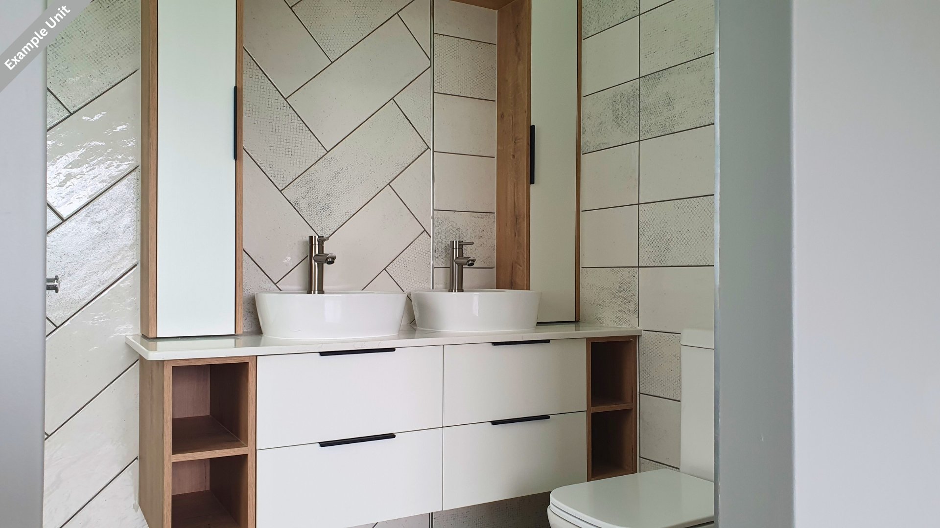Each unit includes three spacious bedrooms with built-in cupboards. The main bedroom offers an en-suite bathroom, while the other two bedrooms share a full family bathroom. Additional features include a double garage with laundry space, a 2,500L water storage tank, and pet-friendly policies (terms and conditions apply).