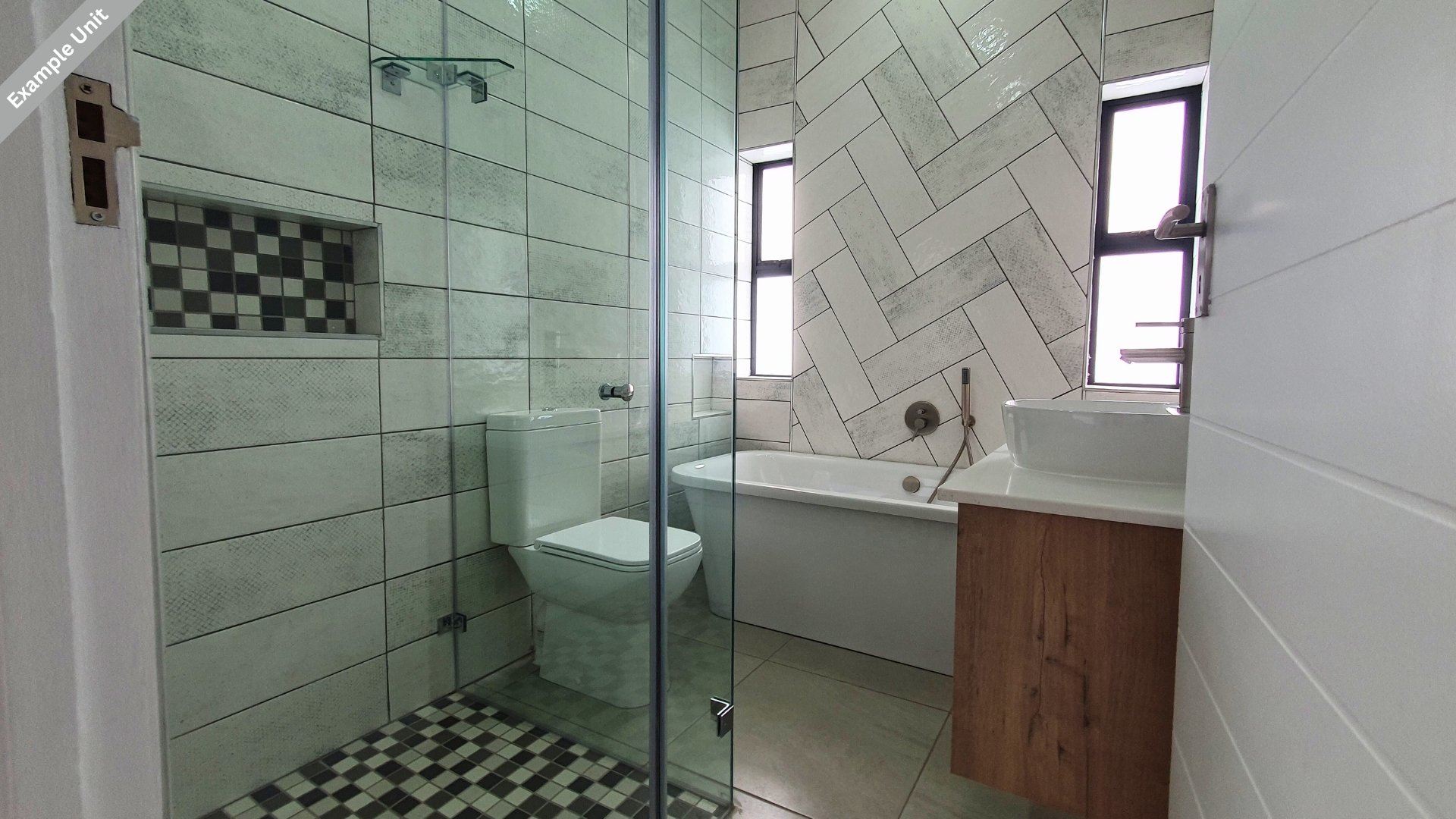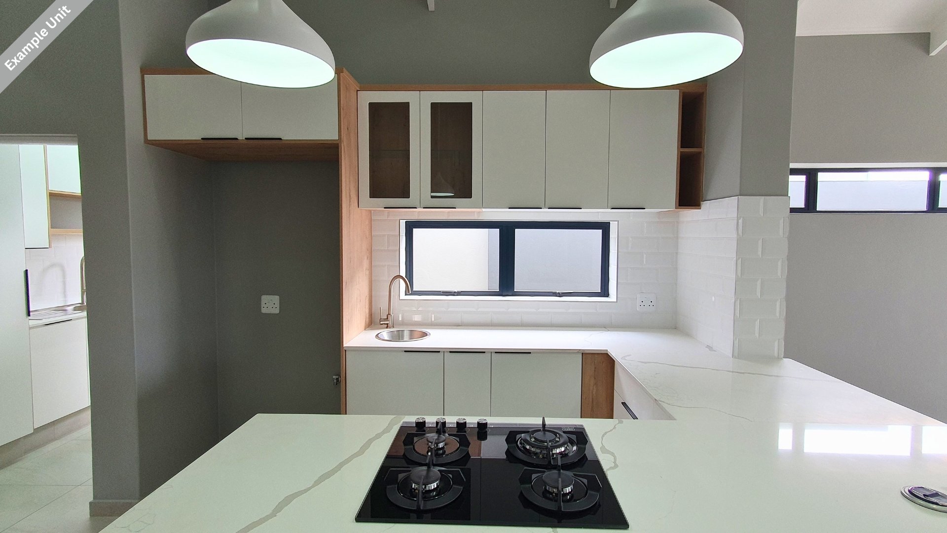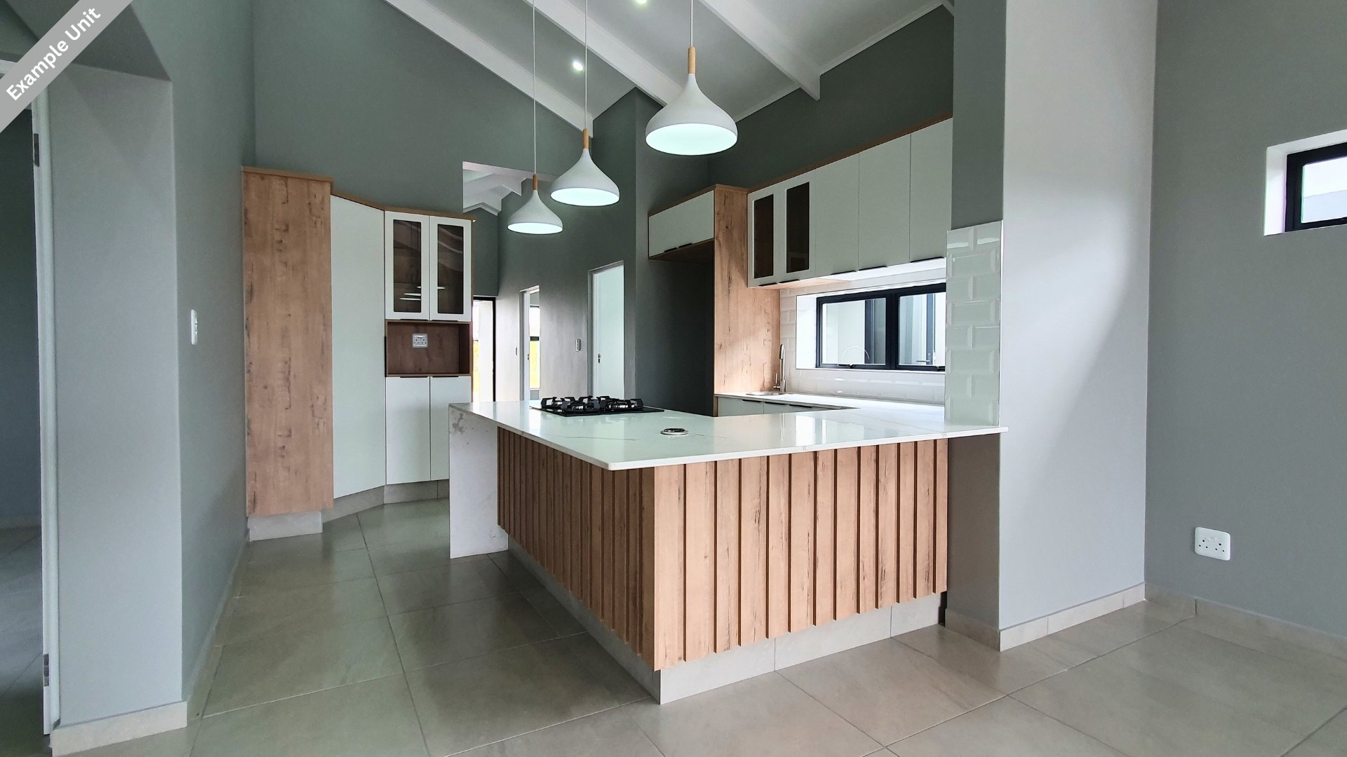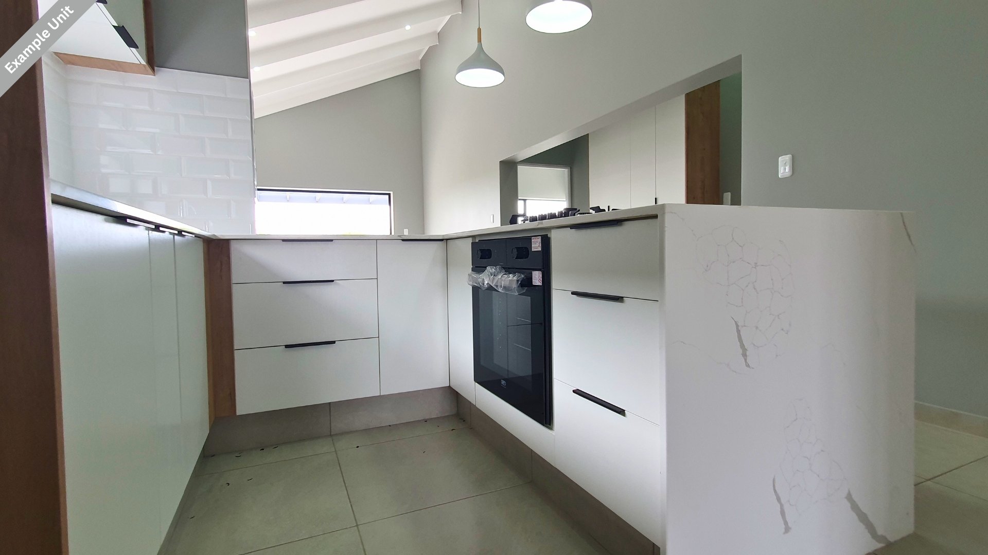 These modern homes, expected to be completed by June/July, will feature open-plan living and dining areas that extend through stackable doors onto a patio with built-in braai—perfect for relaxed outdoor living. The kitchen is designed with a breakfast counter, gas cooktop and oven, and space for a double-door fridge/freezer. An inner courtyard brings additional light and openness to the home.