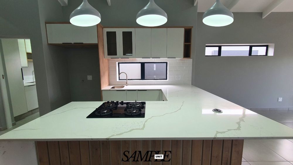 These beautifully designed homes feature an open-plan living area that flows effortlessly to a patio with an outdoor braai, perfect for relaxed entertaining. The kitchen is equipped with a breakfast counter, gas cooktop, oven, and ample space for a double fridge/freezer.