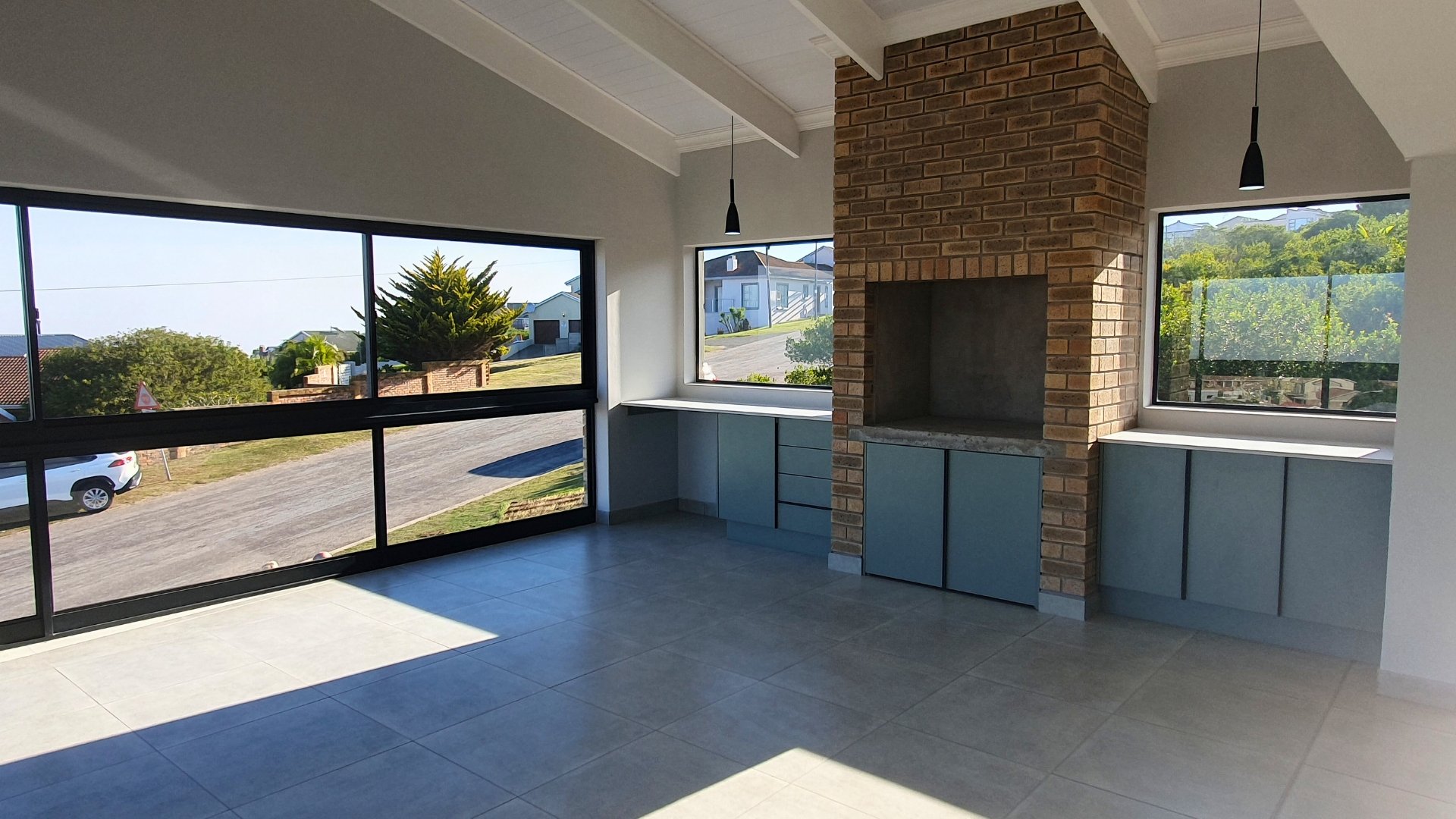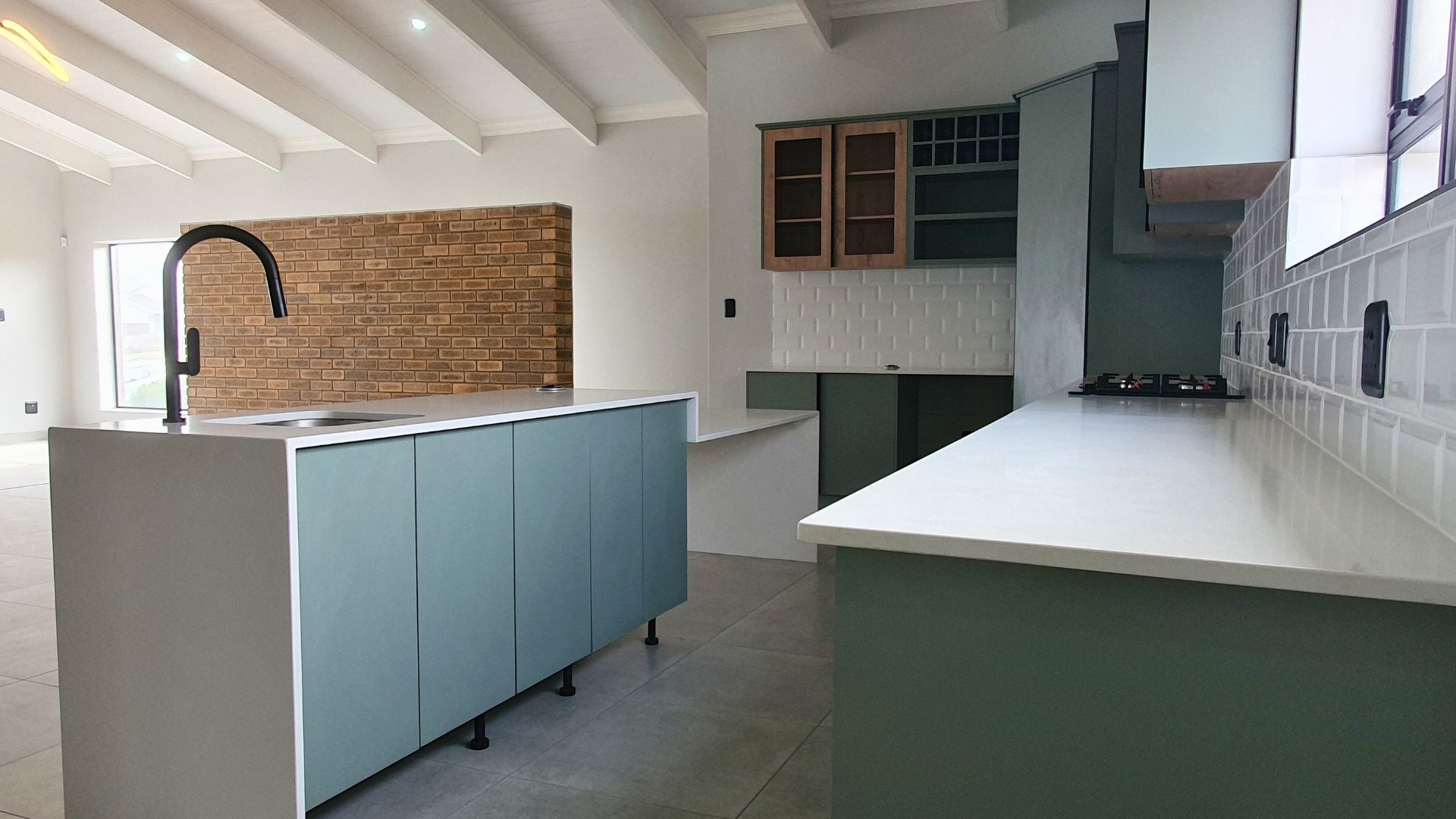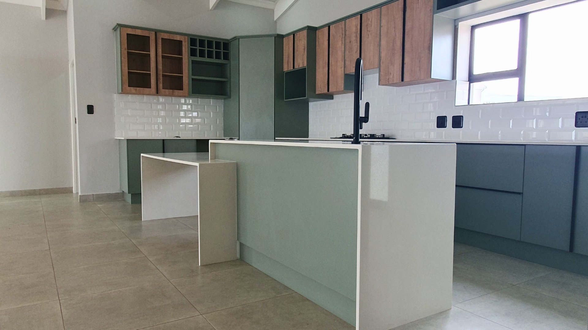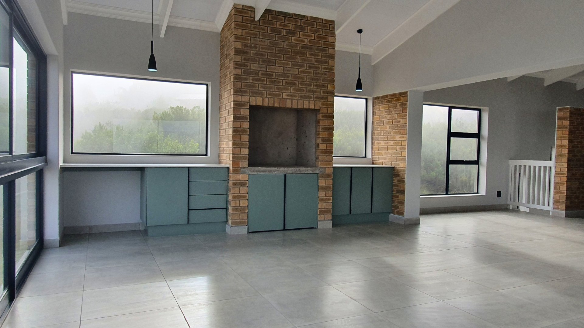 A staircase leads to the front door, where an open-plan layout welcomes you with a seamless flow between the braai room, lounge, dining area, and stylish kitchen. The kitchen is fitted with beautiful countertops, quality cabinetry, a gas hob, and an electric oven, along with a centre island that includes a prep bowl. A separate scullery provides all the necessary appliance connections.