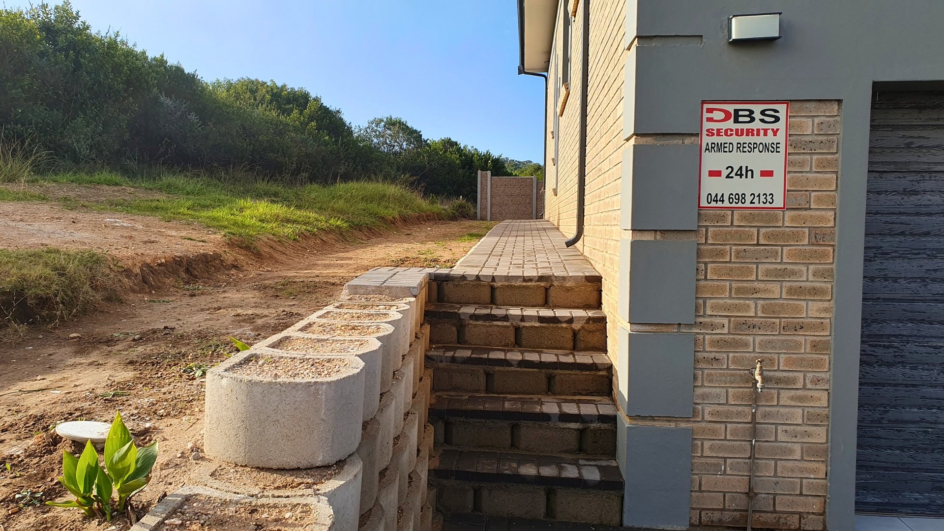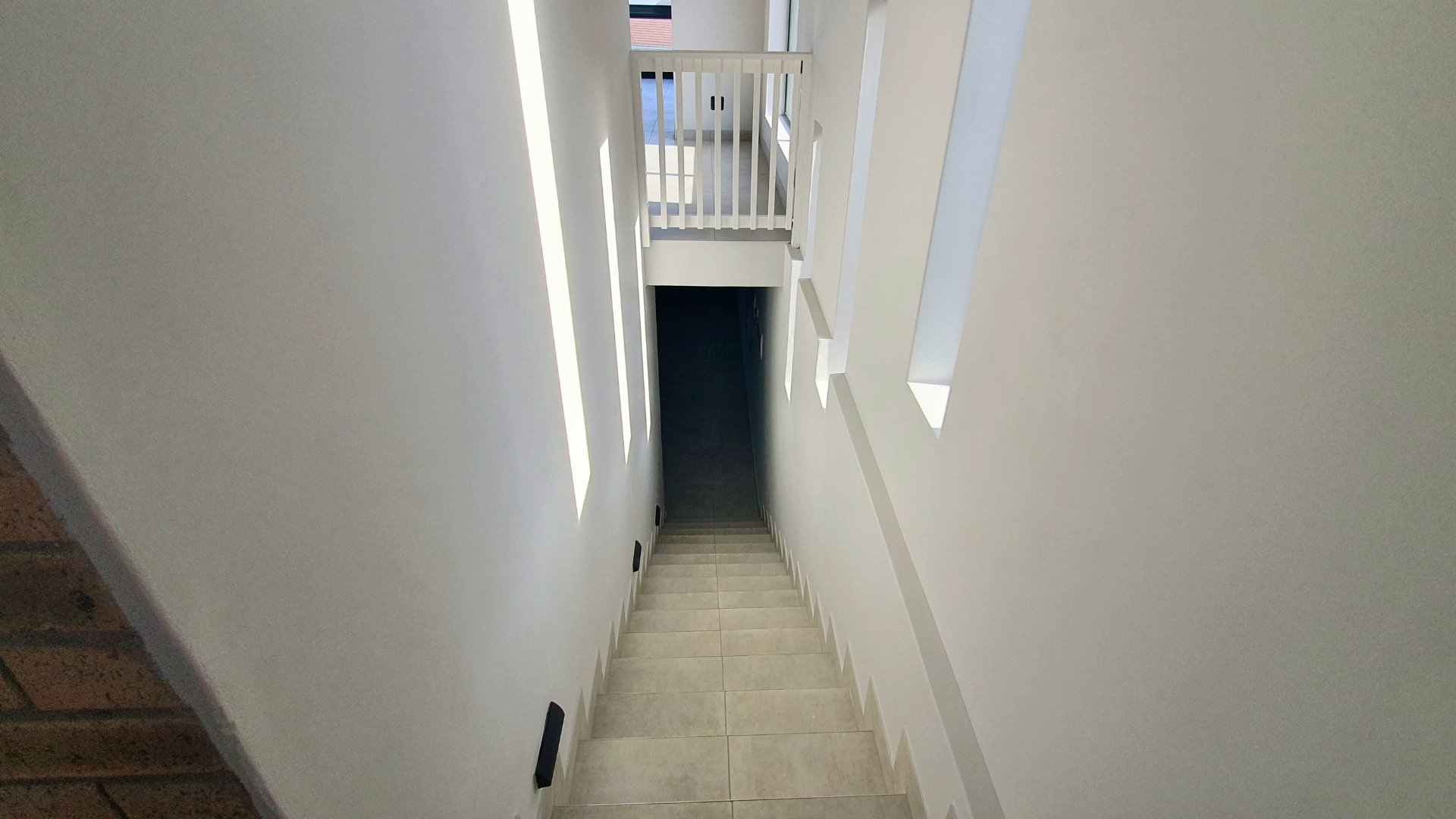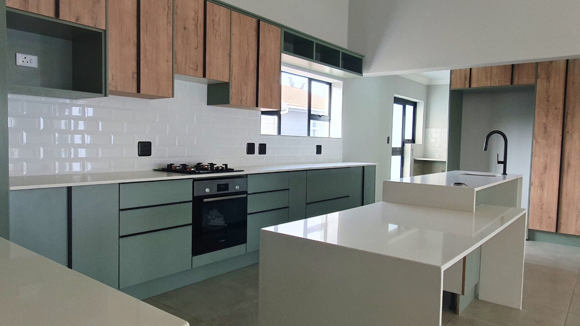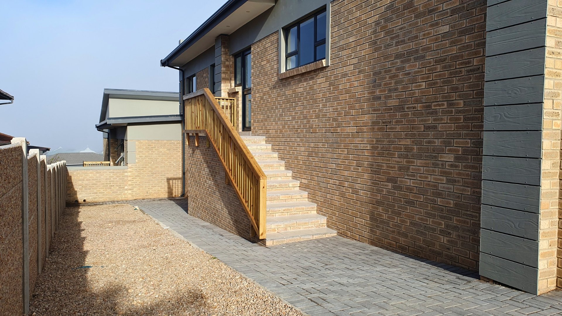 A staircase leads to the front door, where an open-plan layout welcomes you with a seamless flow between the braai room, lounge, dining area, and stylish kitchen. The kitchen is fitted with beautiful countertops, quality cabinetry, a gas hob, and an electric oven, along with a centre island that includes a prep bowl. A separate scullery provides all the necessary appliance connections.