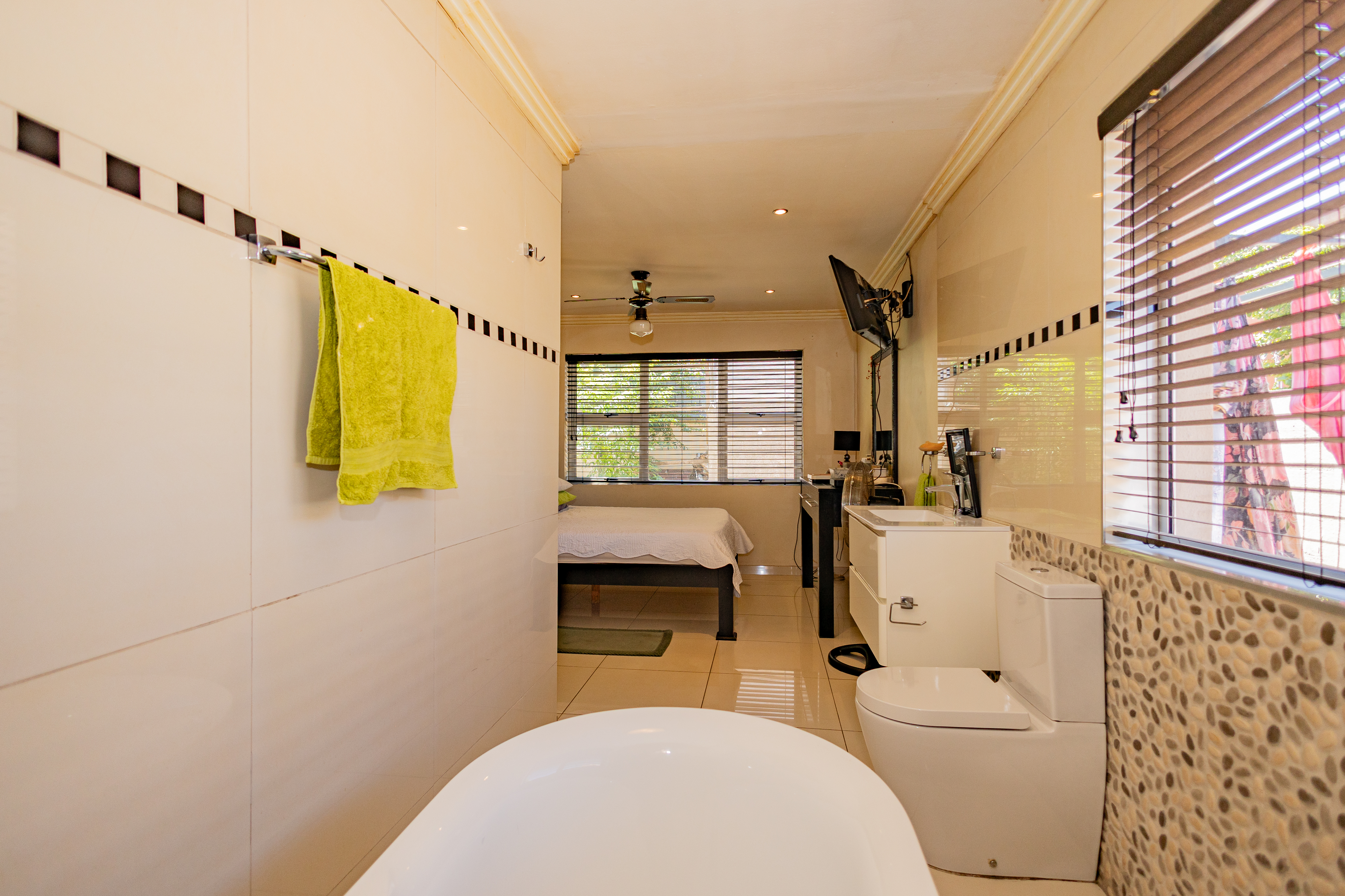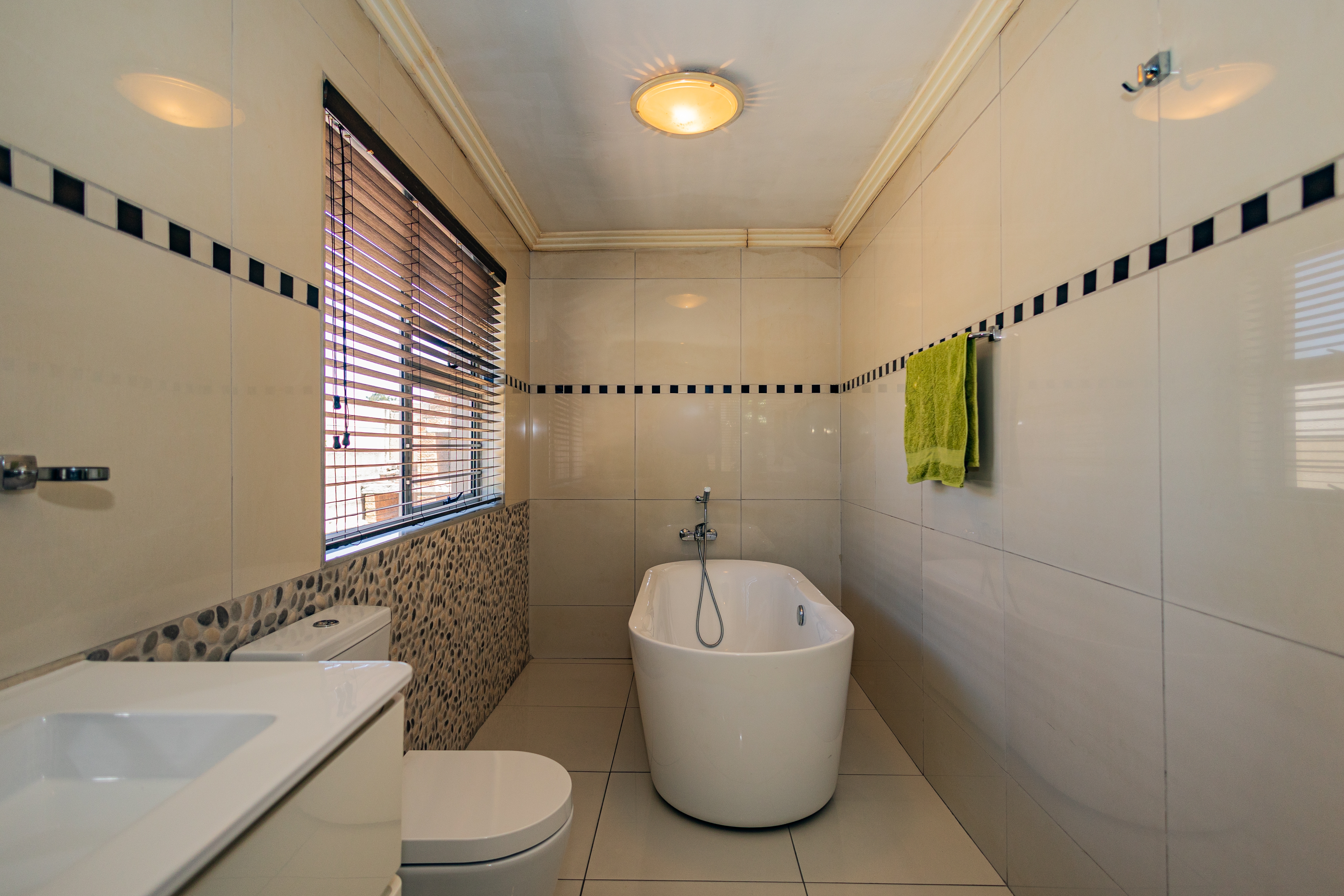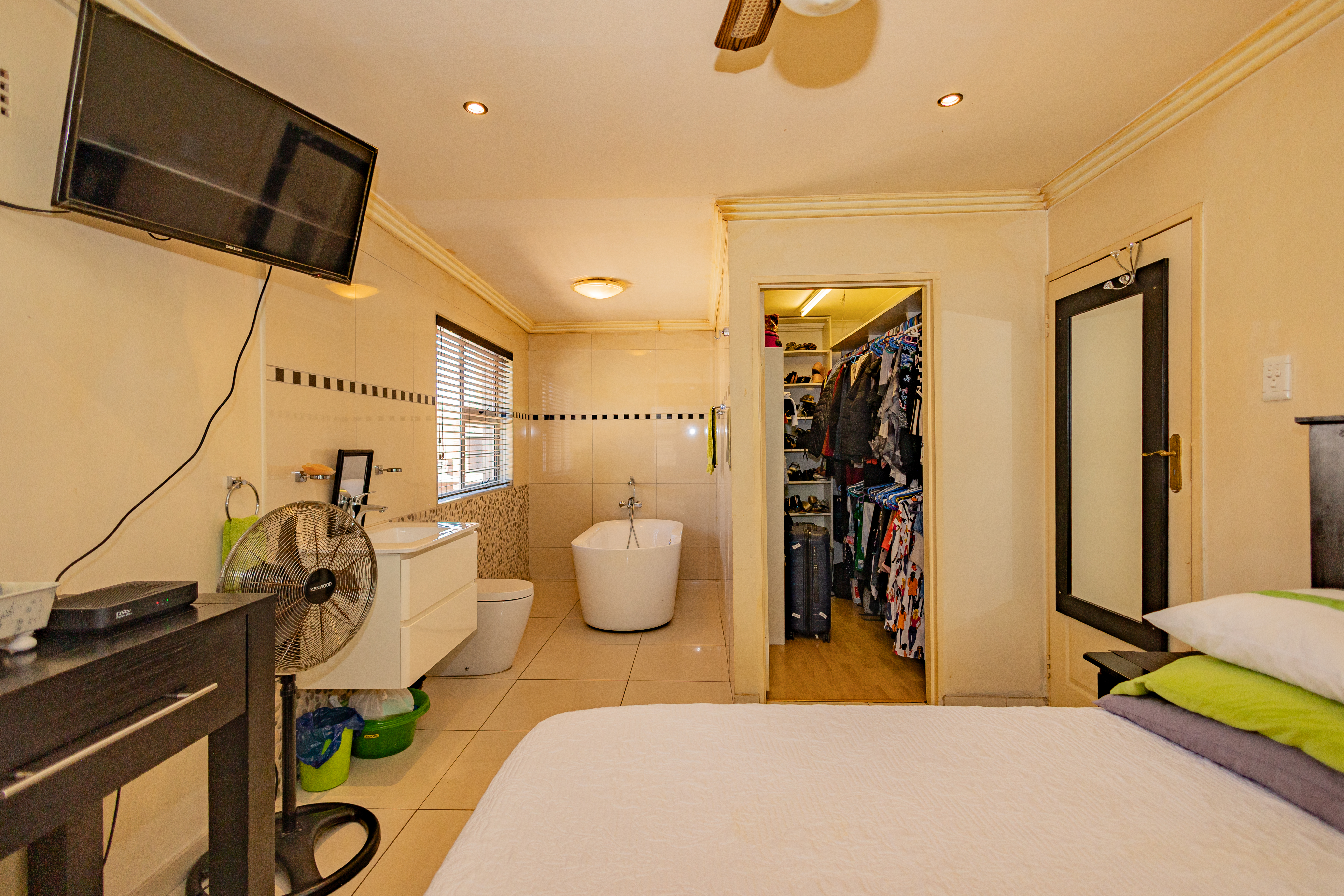 The main bedroom offers a luxurious bathtub, hand basin, and a walk-in closet.