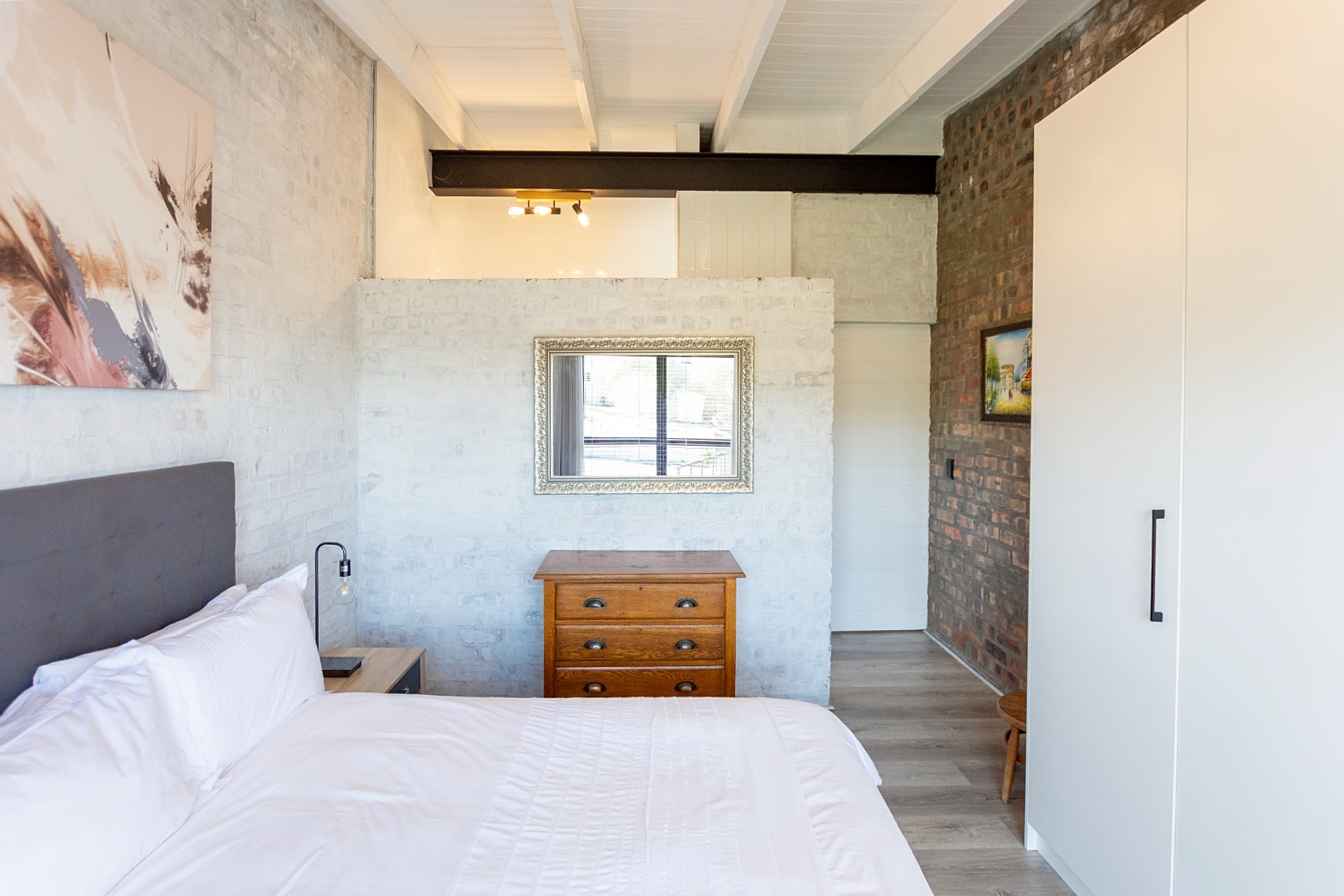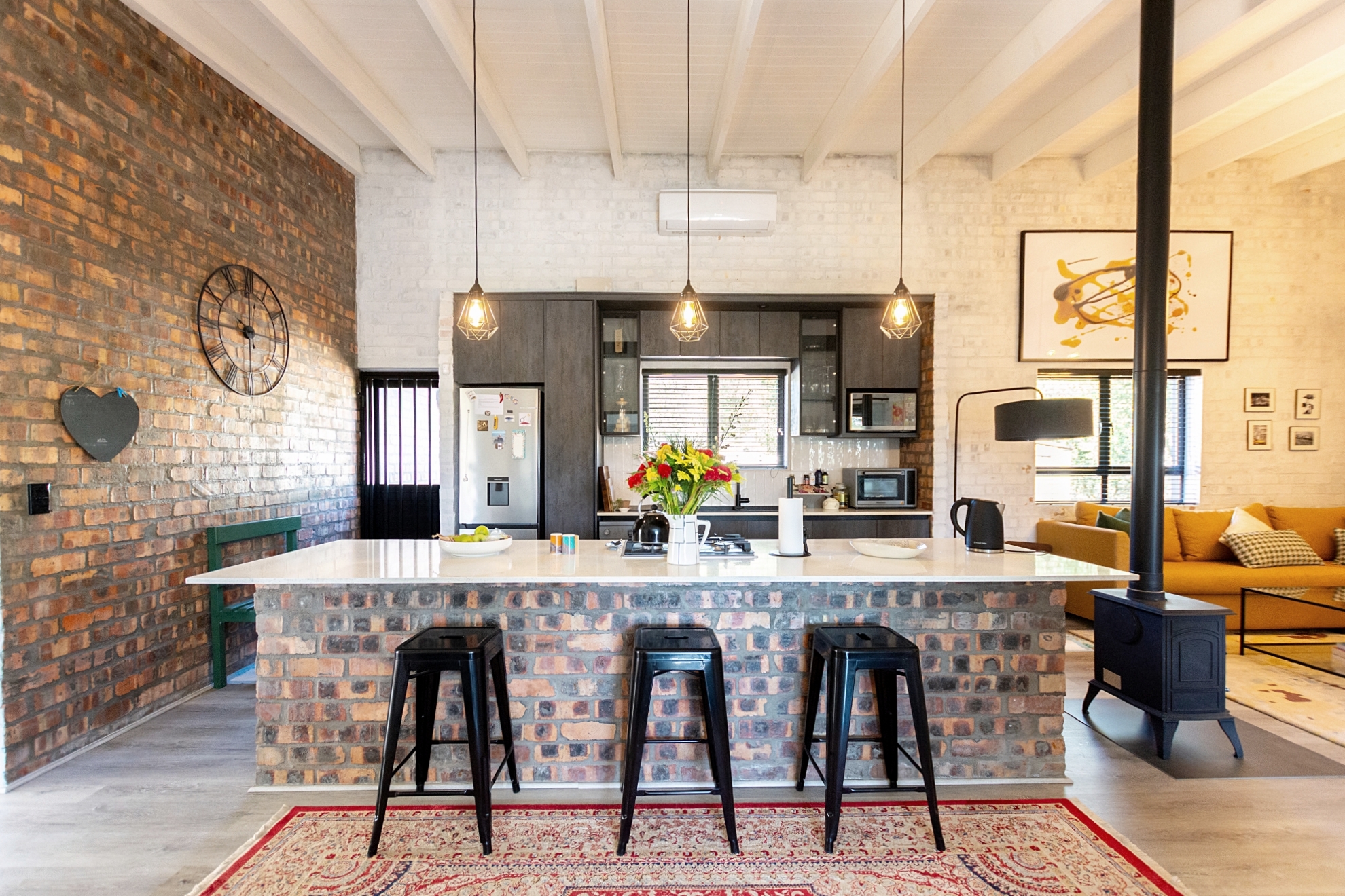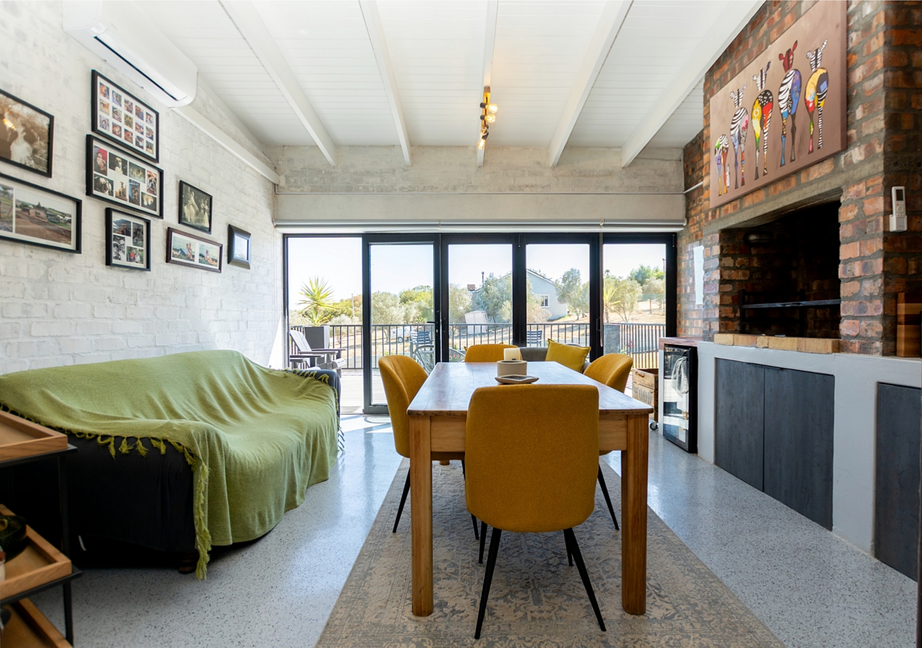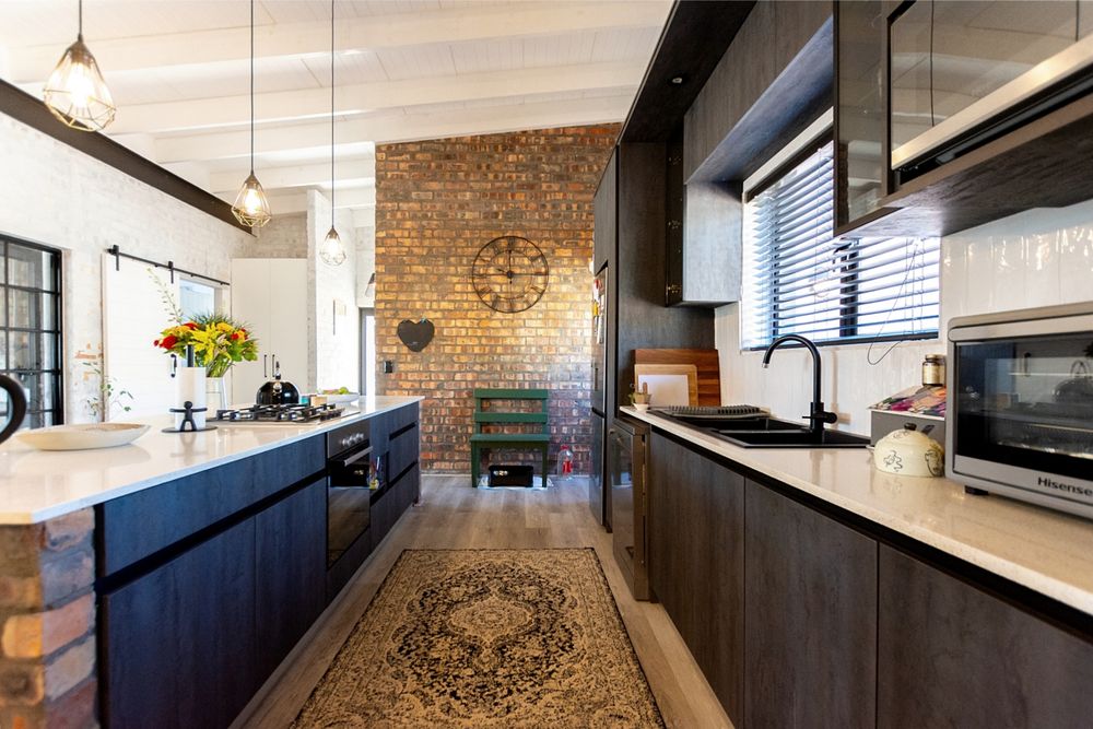 The Living space flows around a modern, practical kitchen, with a woodfire small stove/fireplace being the focus of a lounge area that invite thought provoking interaction and humor shared. Cleverly this area branched out in a dining/ braai room, fit for fine dining in front of a fire or a social casual braai, and board games around the table. For celebrations the interleading door reduce noise into the home while the flow to the large wooden deck compliments the indoor-out-door glass pain makes you feel part of the conversation.