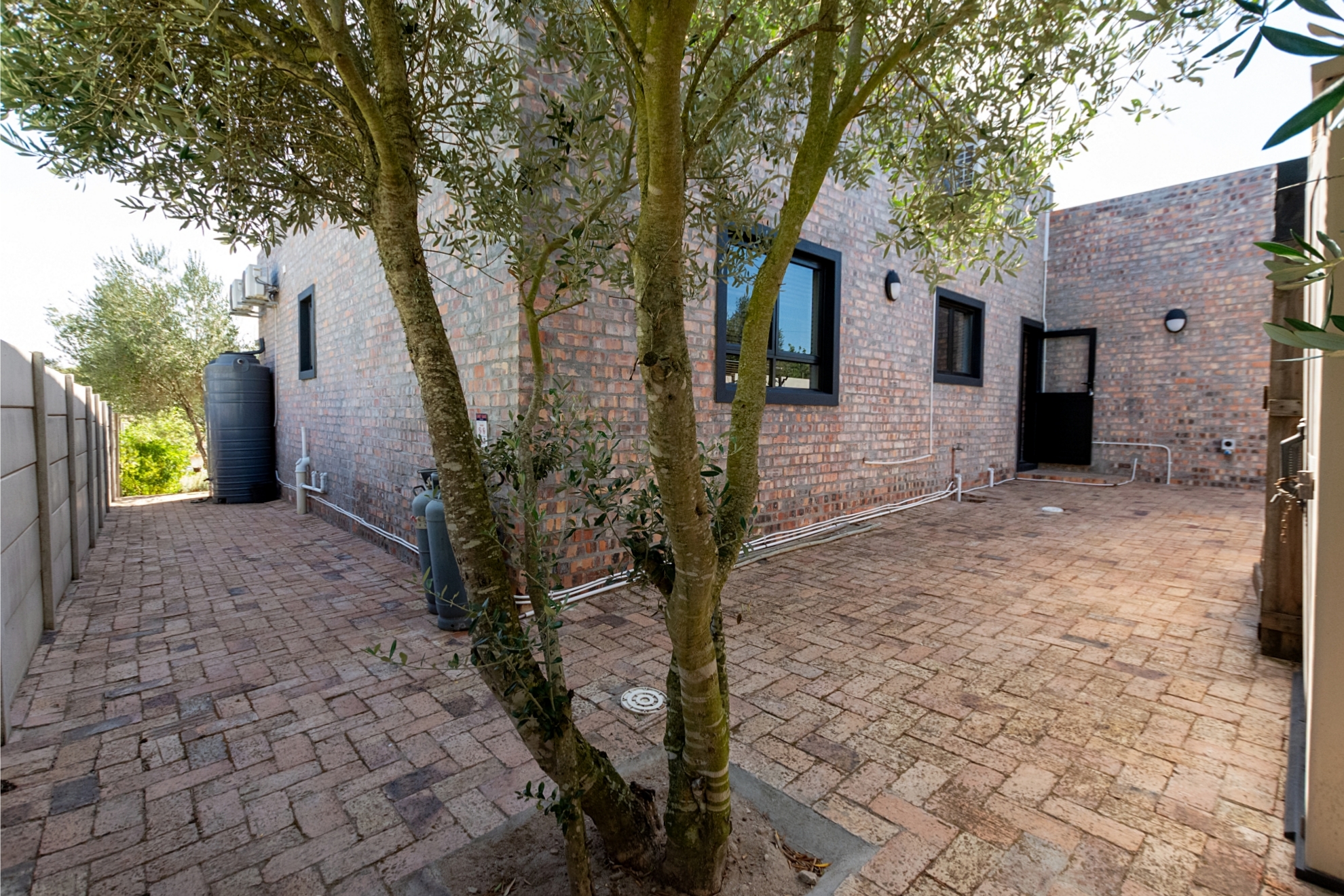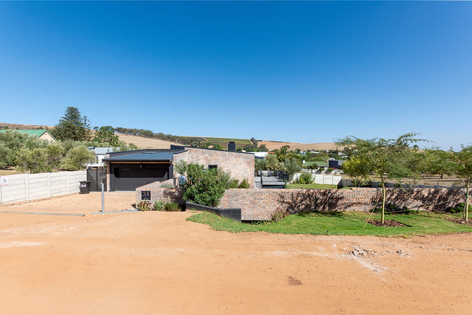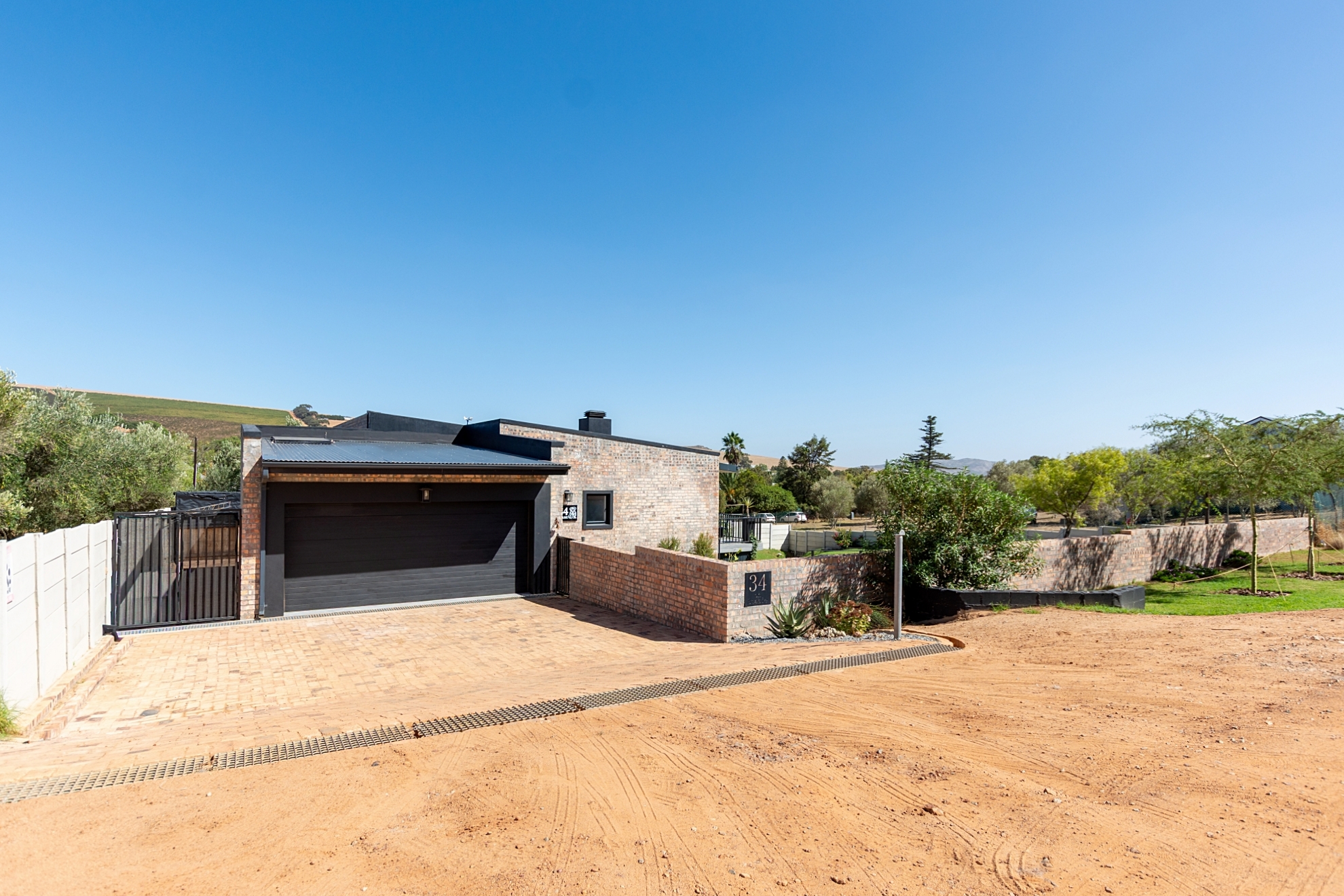 Yes... this house is also practical, with laundry and extra plugs in the double garage, 12 solar panels on the roof, batteries and 10 KVA output and a generator connection outside just for going big when need be. Wendy house for garden tools or kids to play in. Bick paving at the rear of the house keep the yard clean and dry.