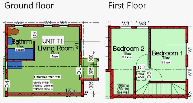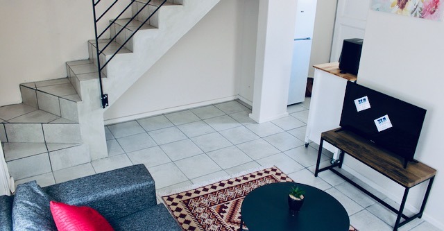 The units are tiled throughout, with a stylish open-plan living and kitchen area. The bathroom is fully equipped with modern fixtures, including a toilet, washbasin, and bath. The upstairs bedrooms provide a peaceful retreat, both fitted with built-in cupboards for ample storage.