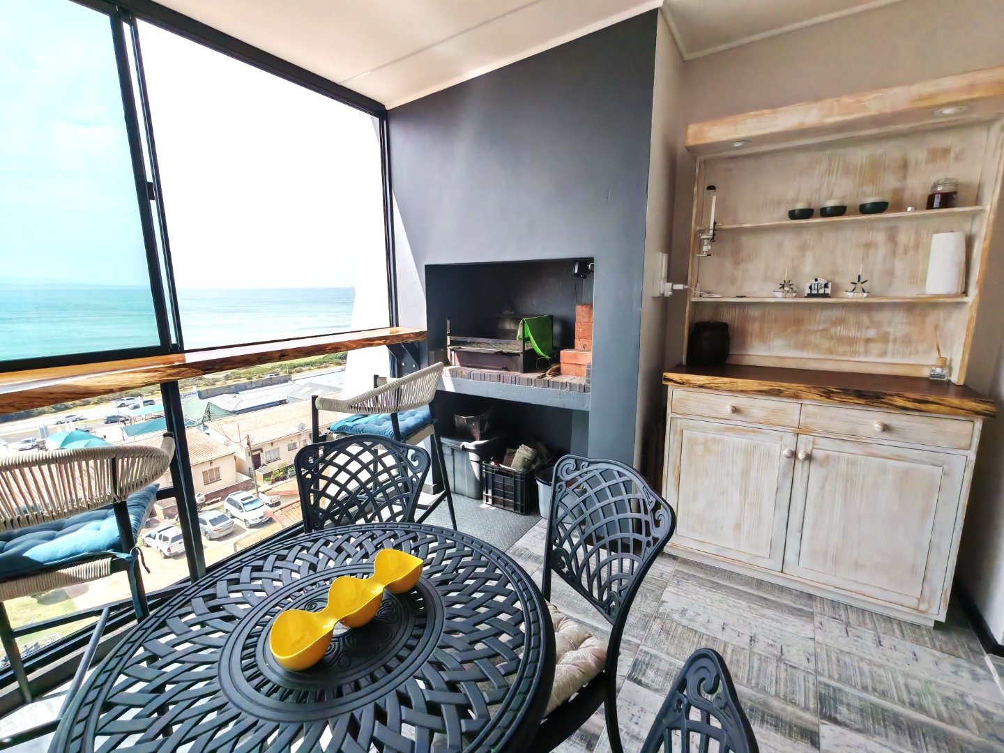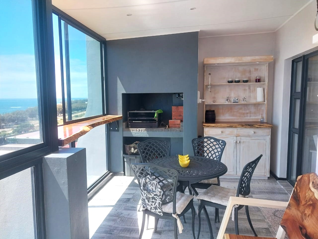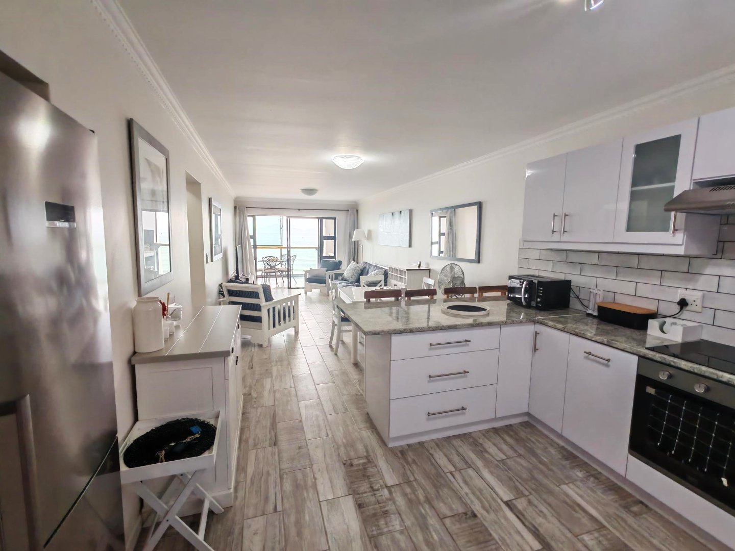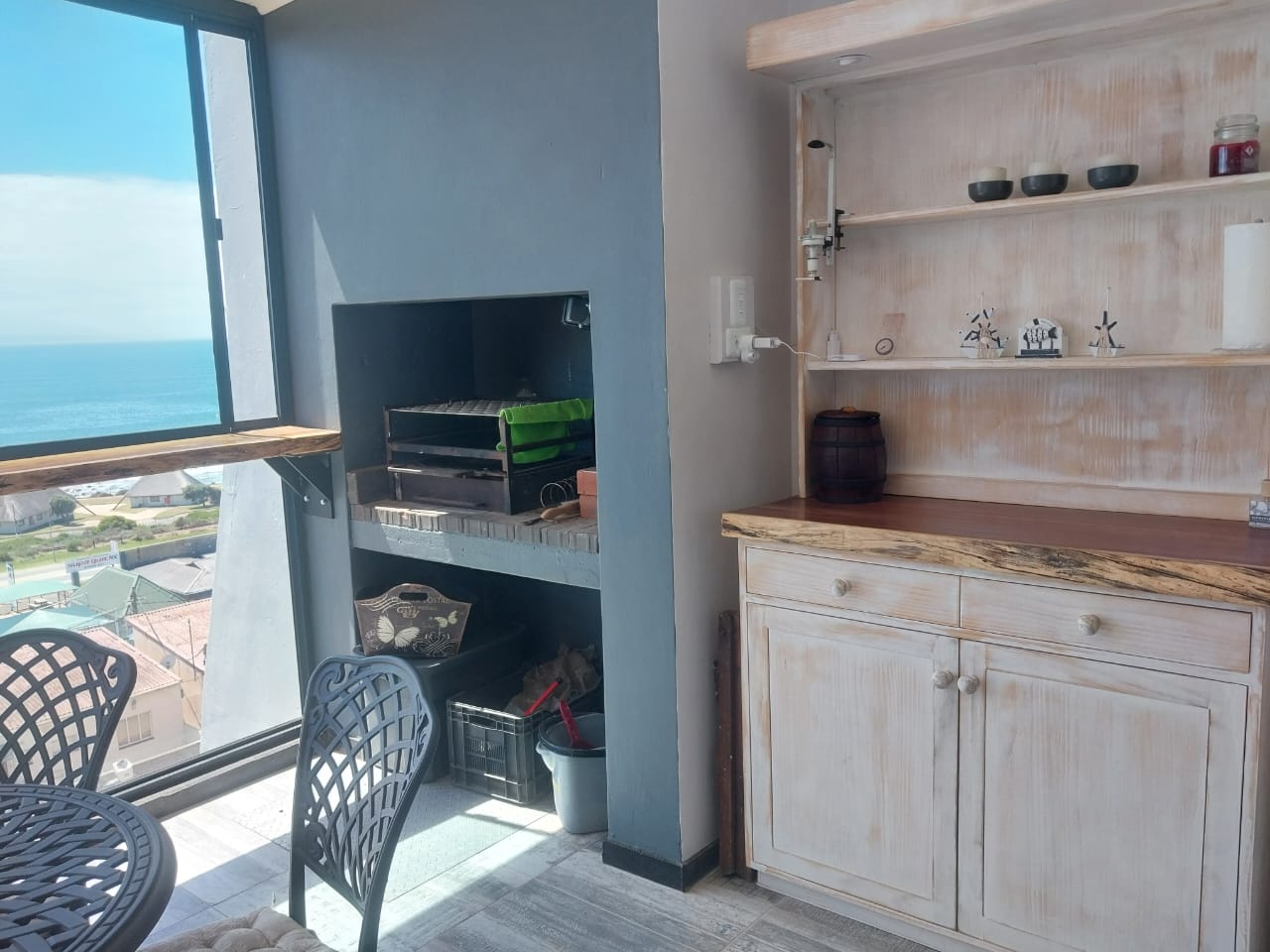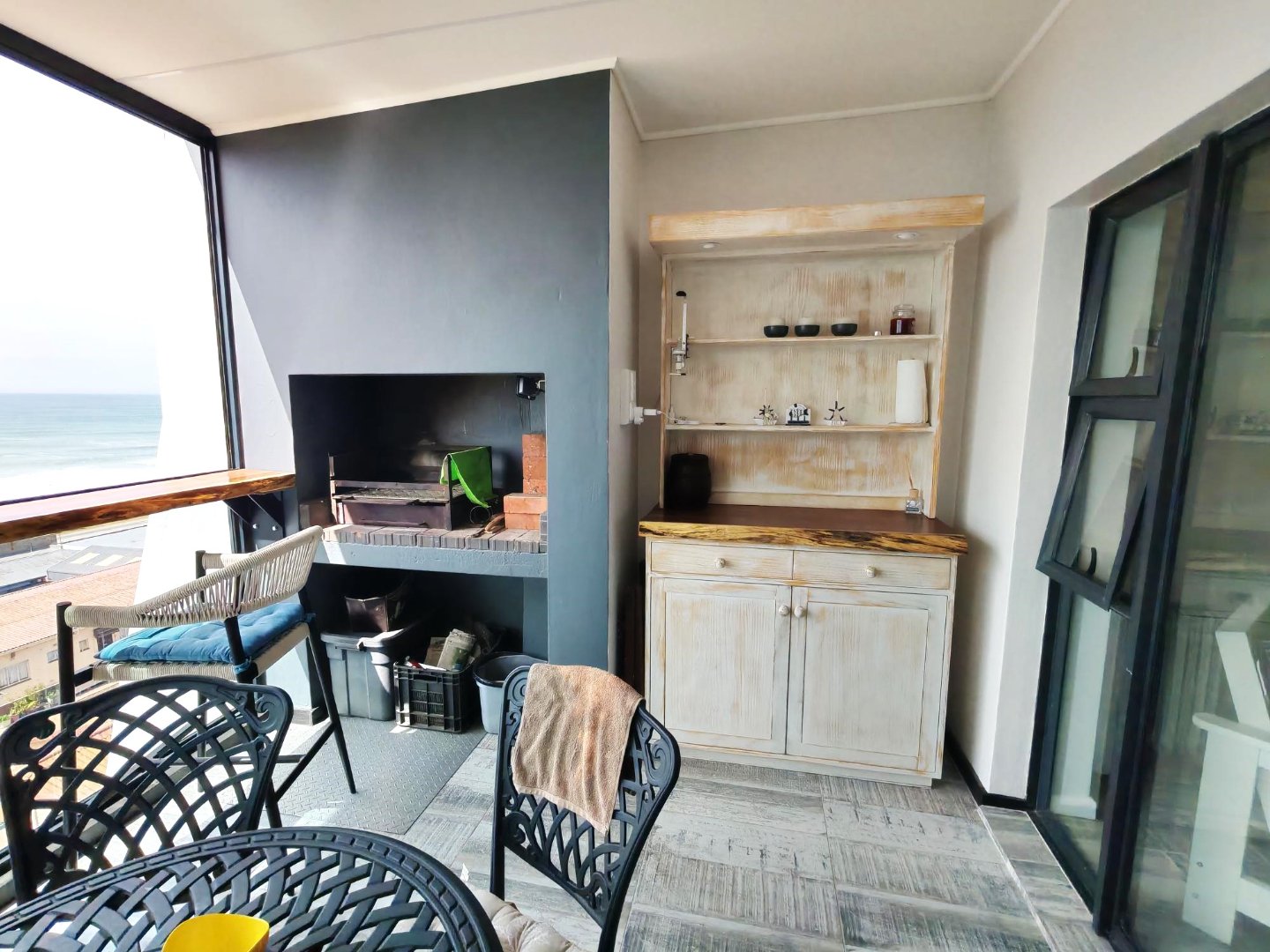 The open-plan living and dining area flows seamlessly onto a sea-facing balcony with a built-in braai and sliding windows, ideal for all-weather enjoyment. The modern kitchen features granite countertops, an electric oven with hob, and a washing machine.