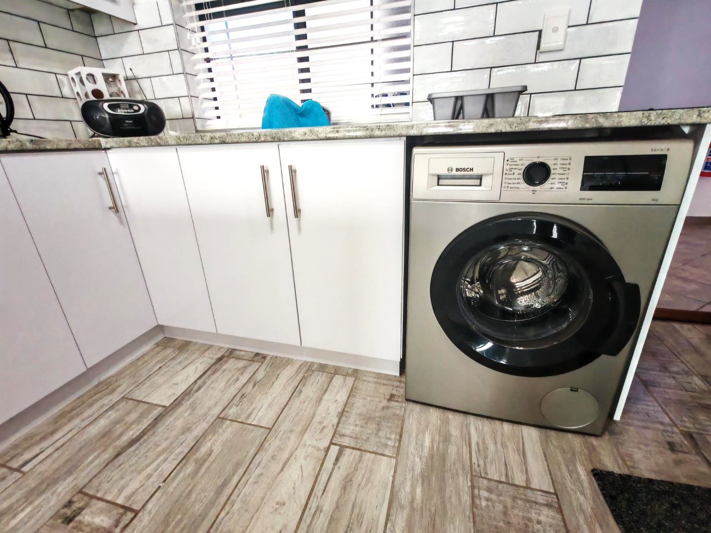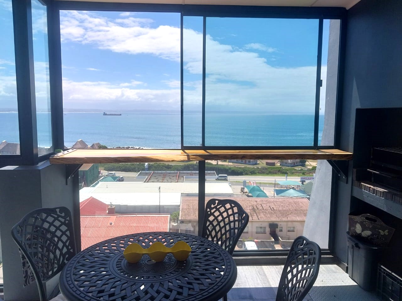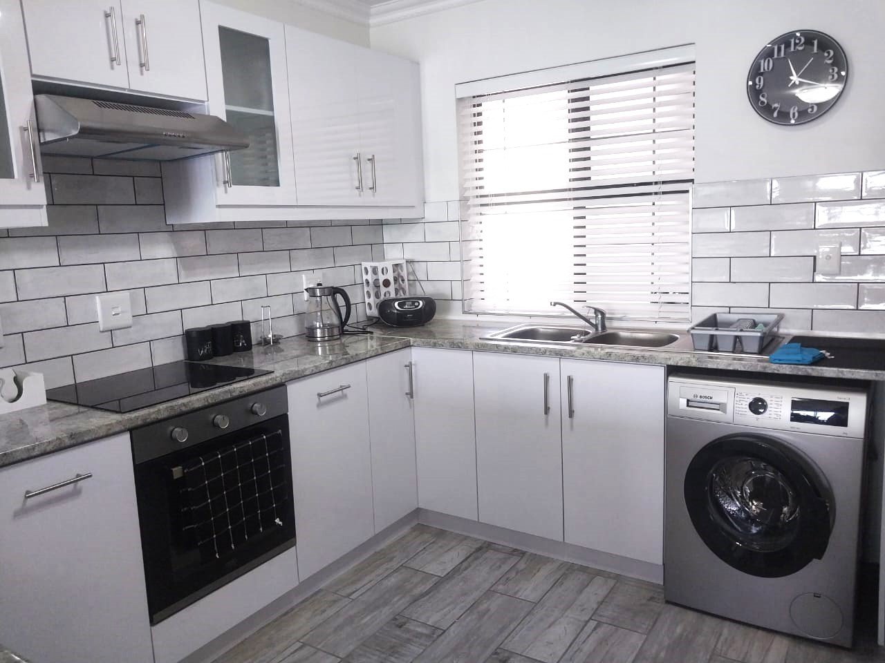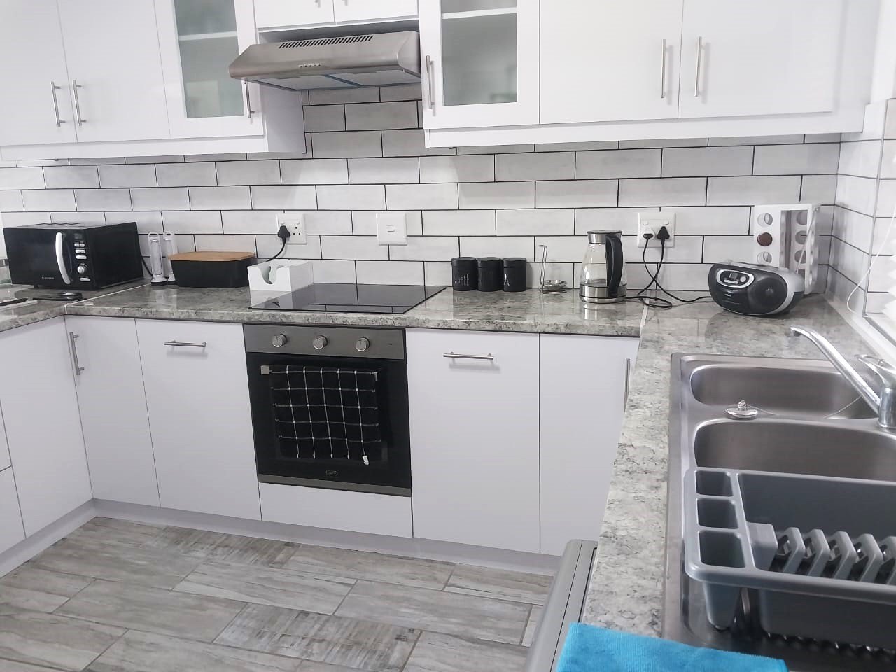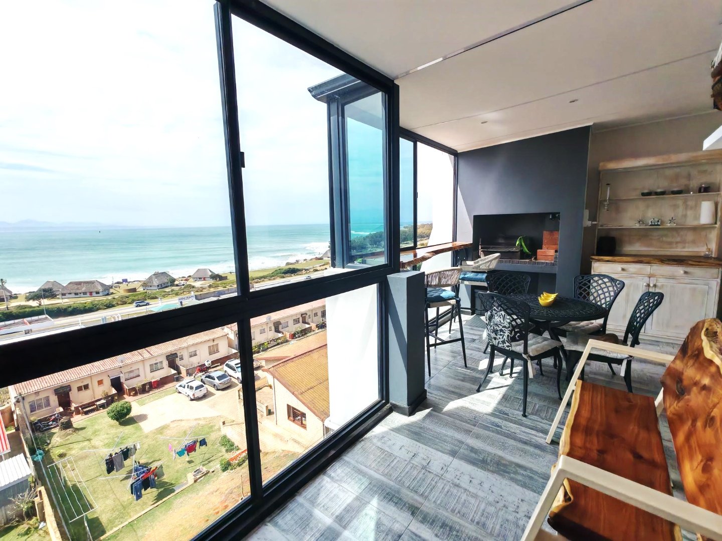The open-plan living and dining area flows seamlessly onto a sea-facing balcony with a built-in braai and sliding windows, ideal for all-weather enjoyment. The modern kitchen features granite countertops, an electric oven with hob, and a washing machine.