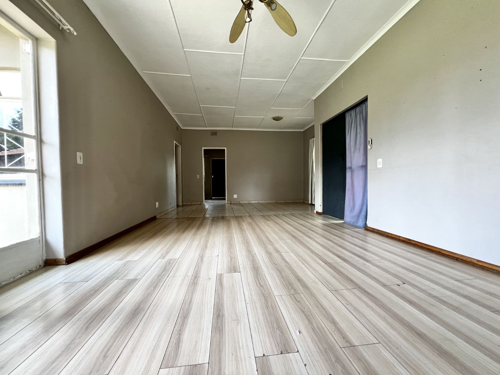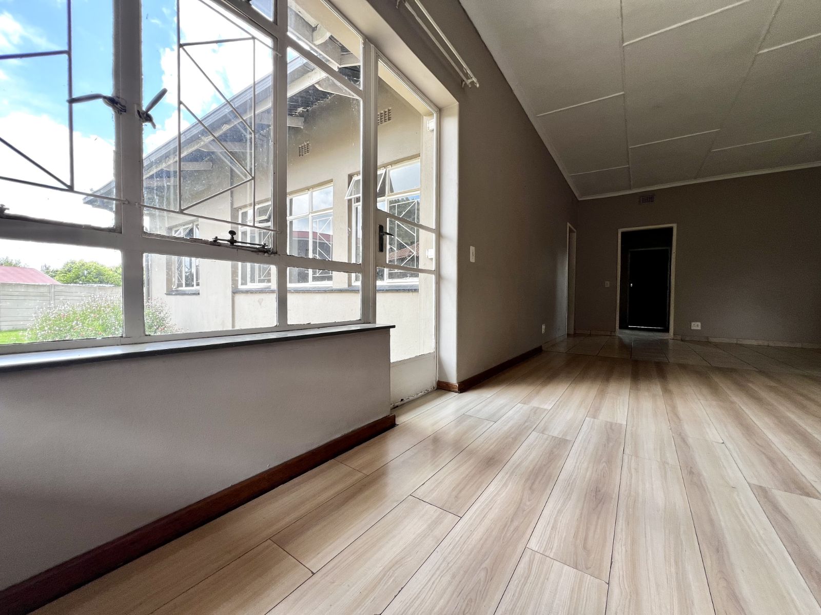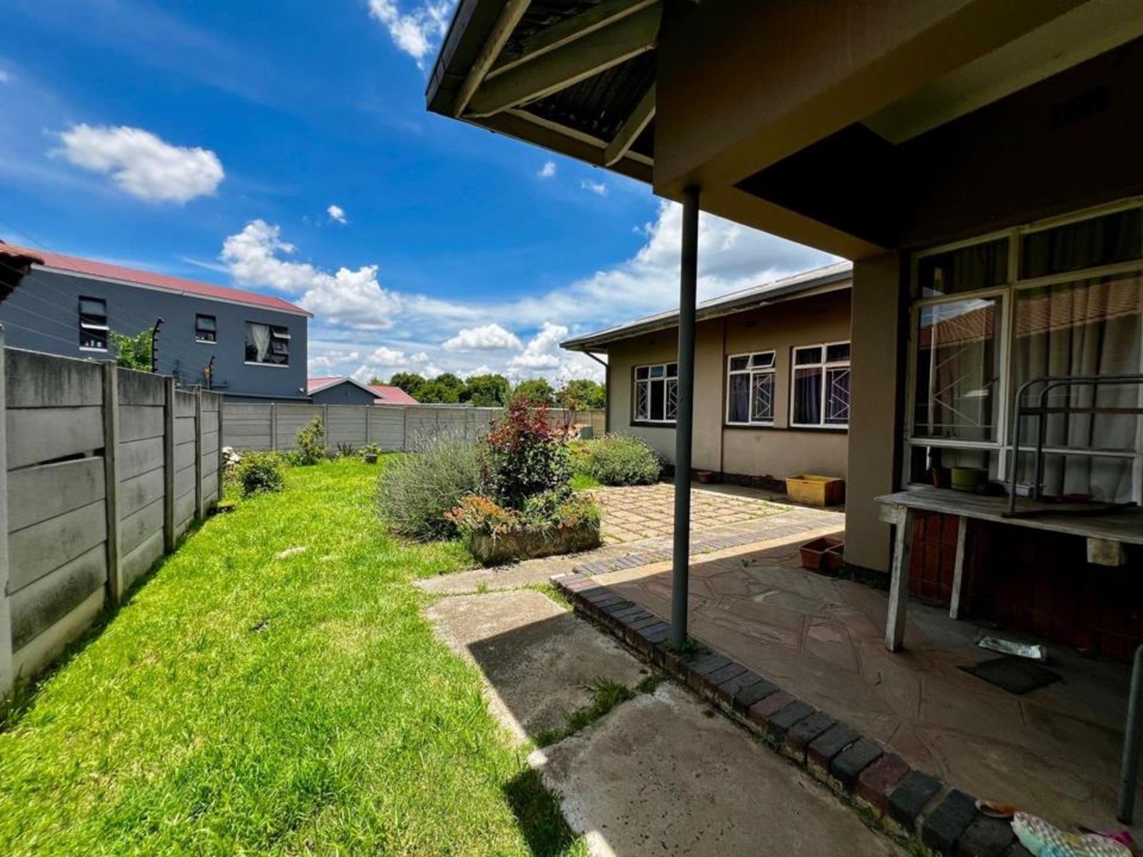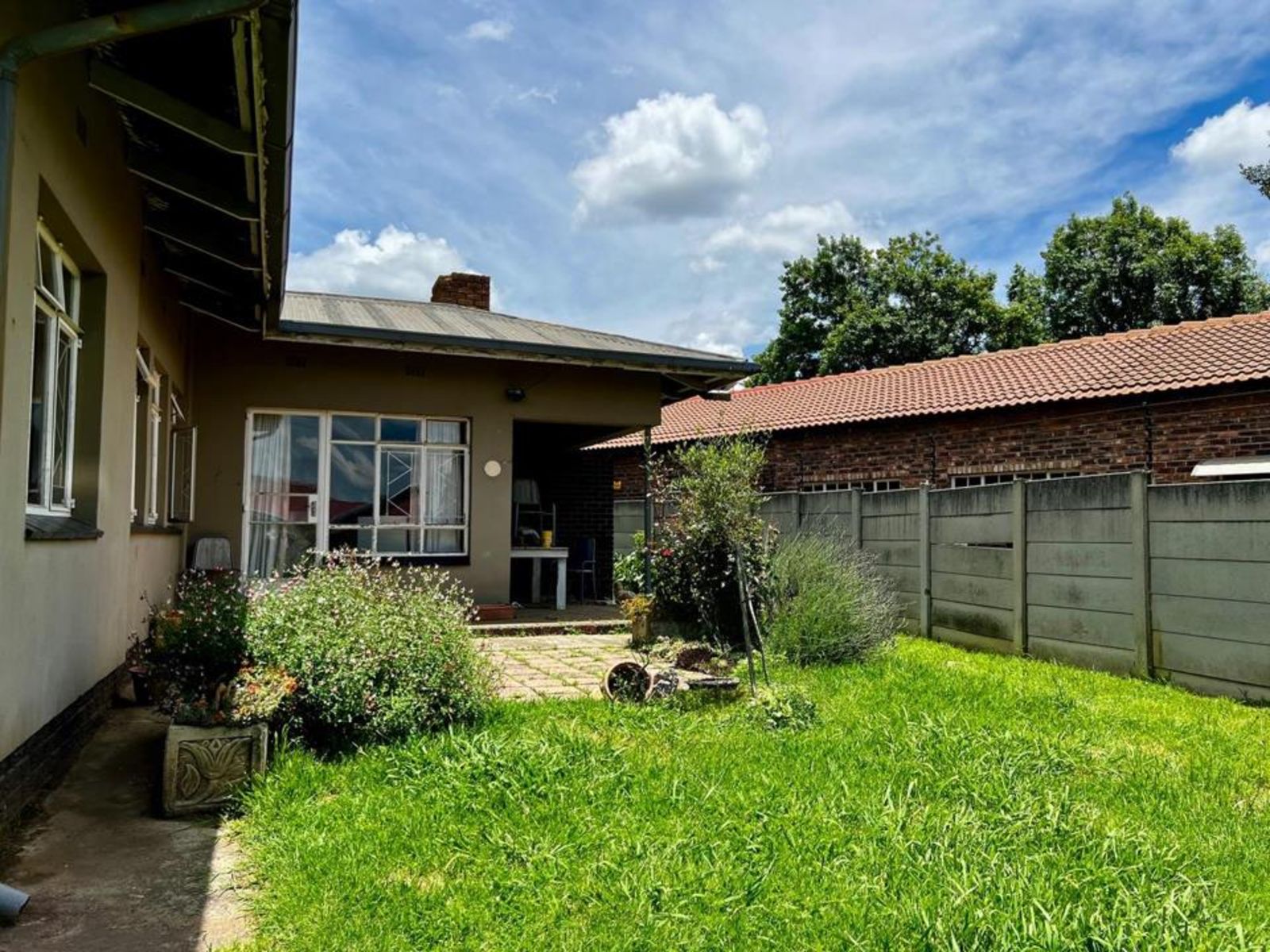 Just steps away from Laerskool JJ van der Merwe the property features a warm, inviting living area with laminated floors, tiles, a fireplace, and glass doors that open to the back garden.