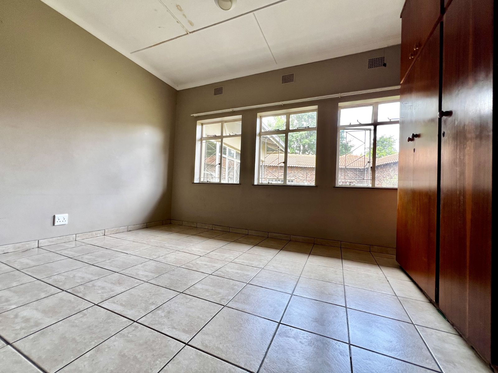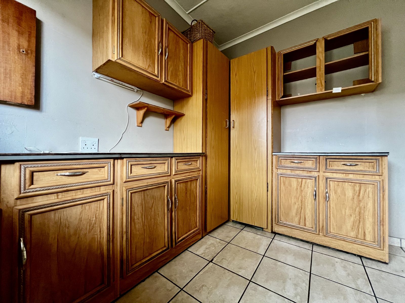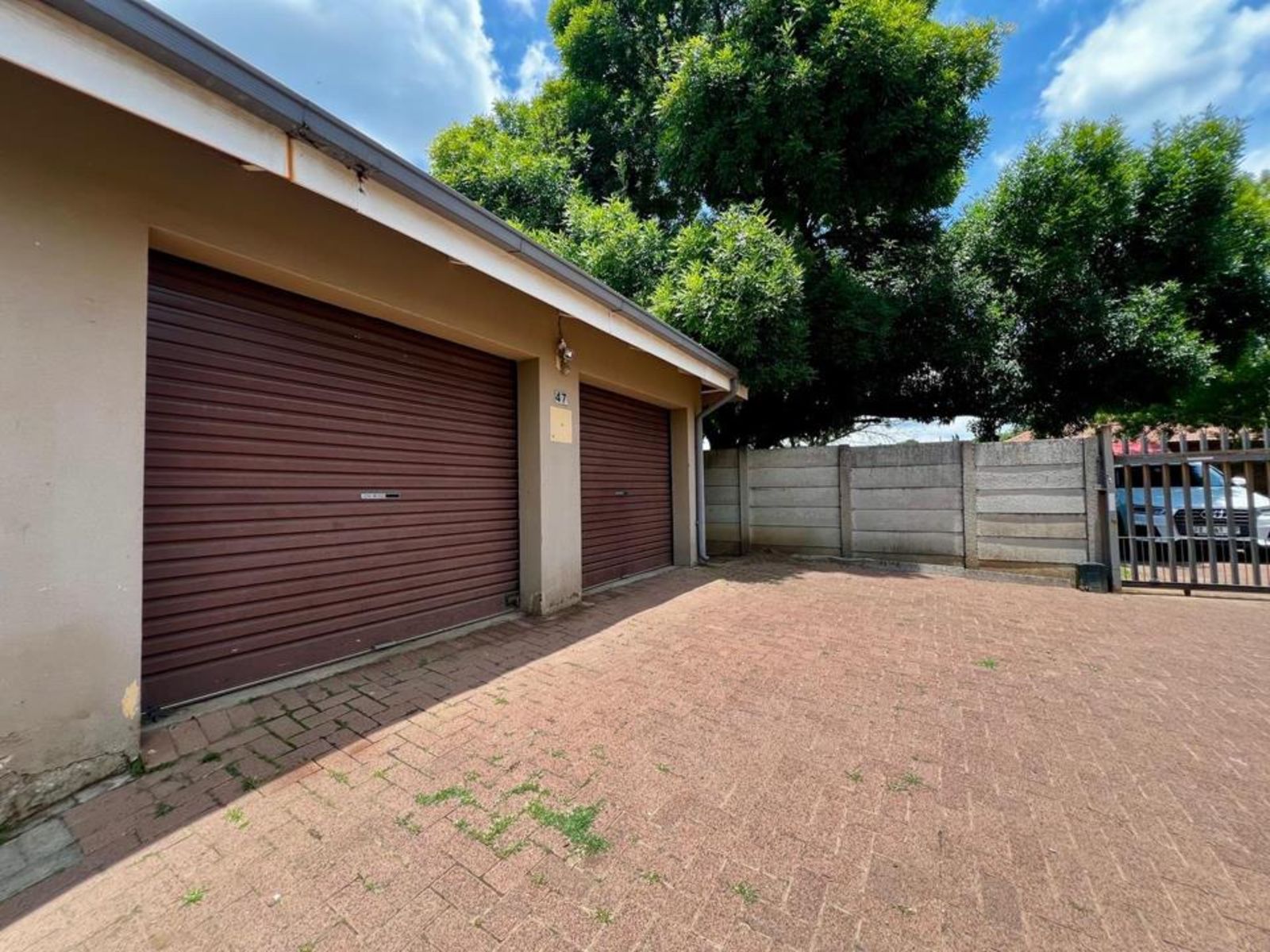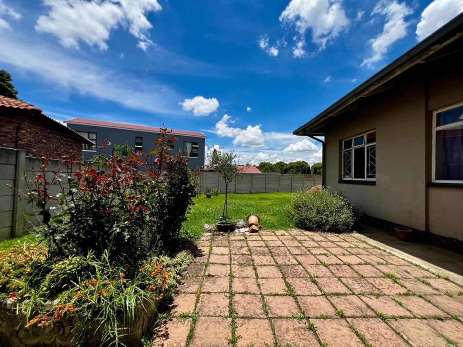 Just steps away from Laerskool JJ van der Merwe the property features a warm, inviting living area with laminated floors, tiles, a fireplace, and glass doors that open to the back garden.