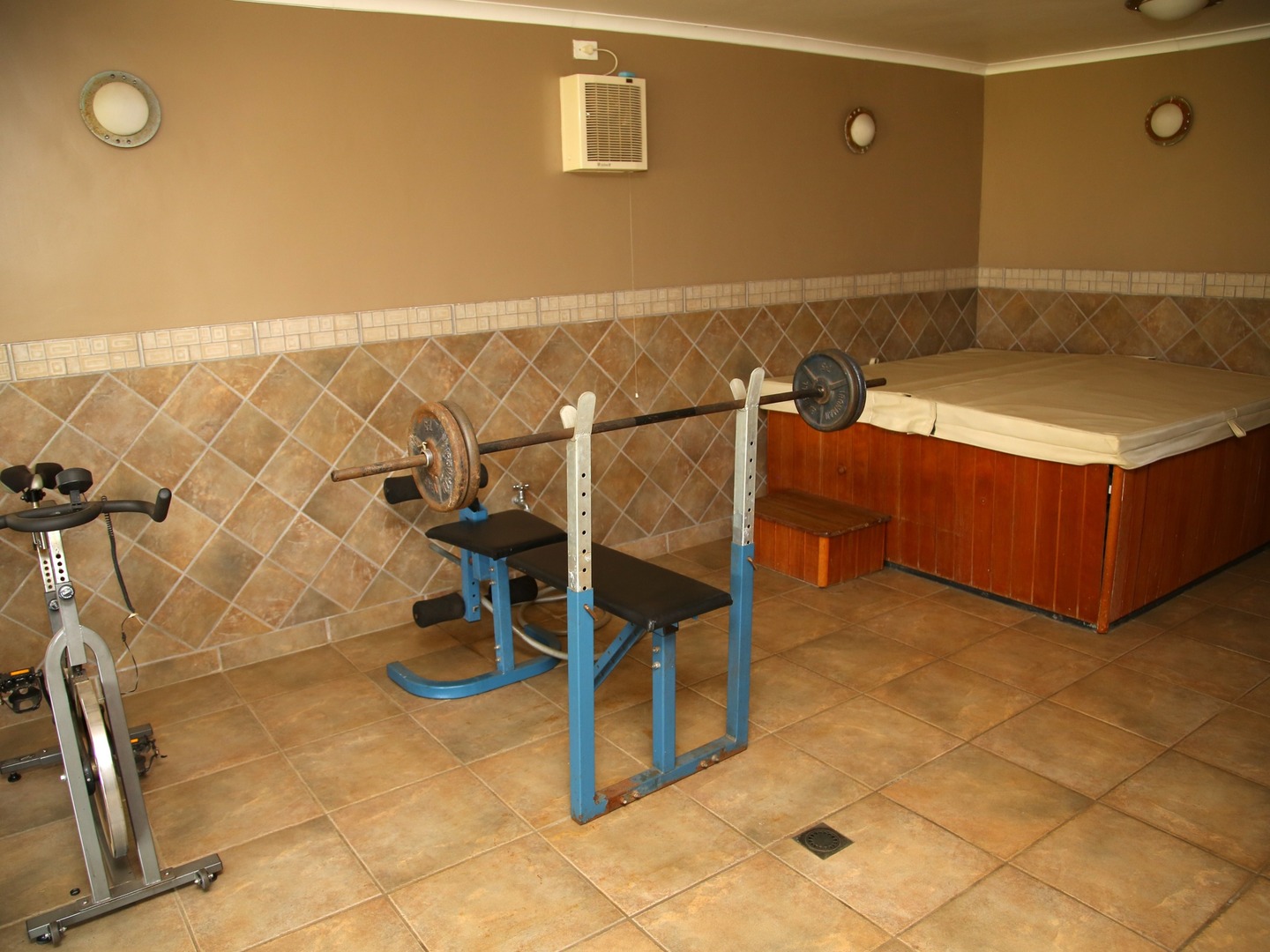 Guest bedroom: bathroom en suite - shower, basin and toilet. This bathroom also services gym/jacuzzi room