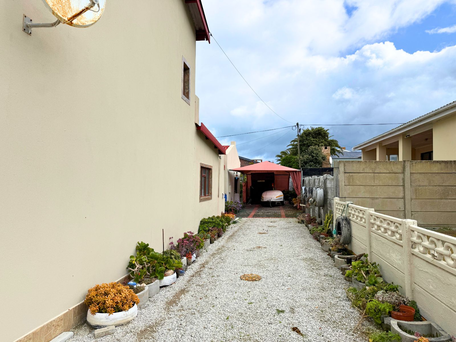 Outdoor features include a single garage attached to the main house, a 26m2 shade-net carport, and two independent driveway entrances. A solar system with 16 roof panels, an 8kW inverter, battery backup, and automatic changeover ensures energy efficiency and reduced running costs.