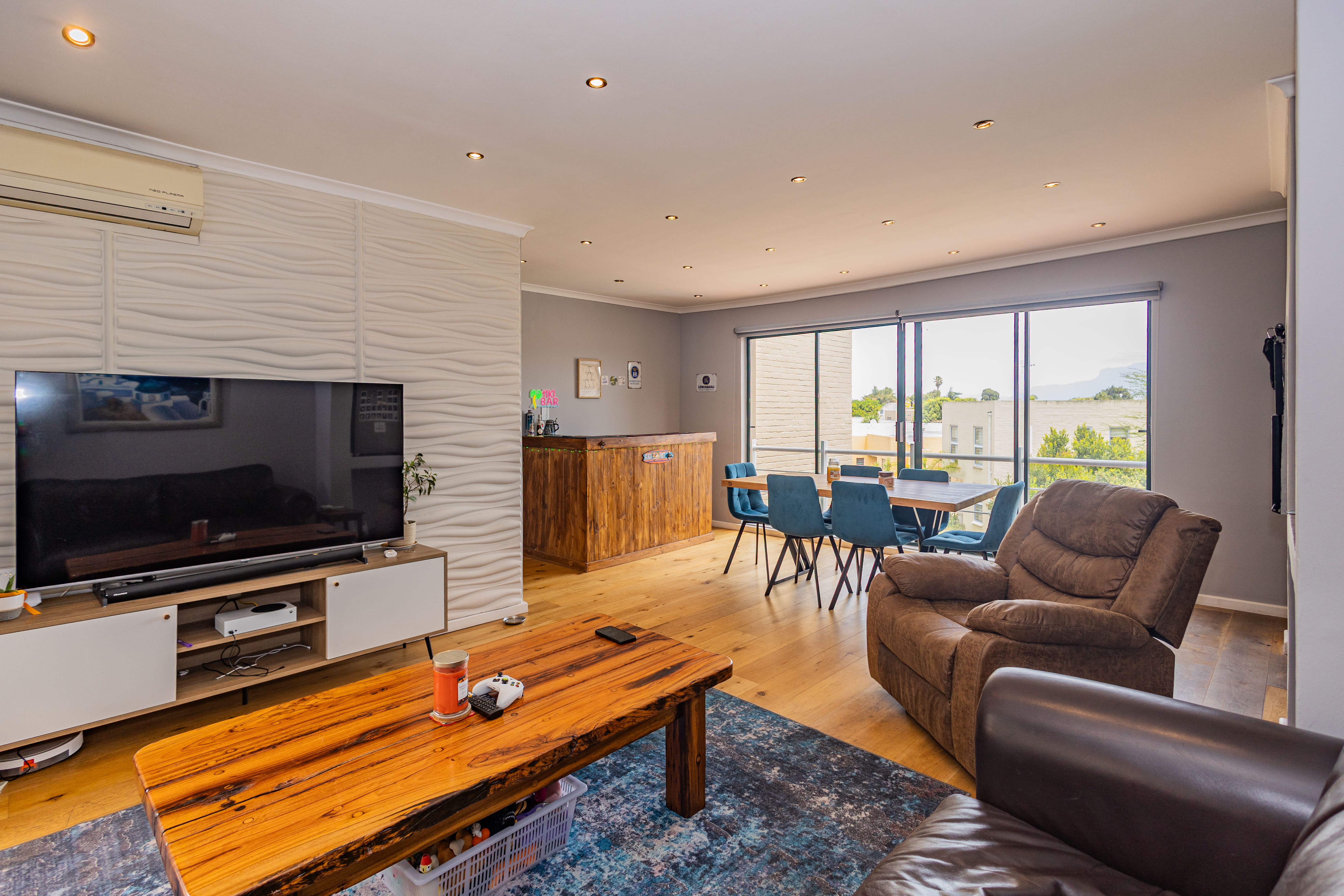 This home truly shines in its entertainment spaces. To the left of the third bedroom, an open-plan second TV lounge features a built-in bar and indoor braai, flowing seamlessly into an outdoor entertainment area with a fireplace and deck, creating the ideal setting for hosting year-round.