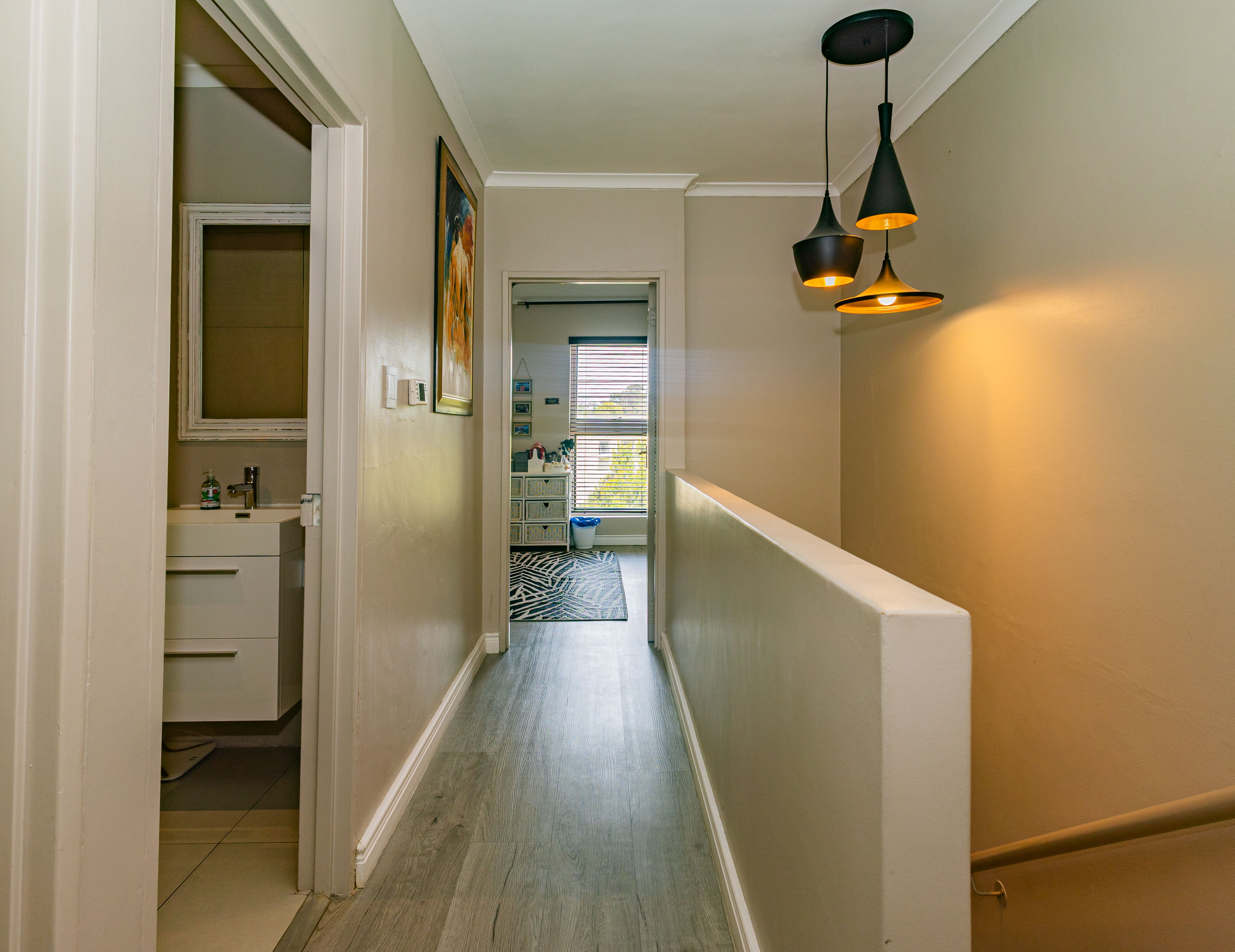 One of the secondary bedrooms is currently styled as a study, but the size easily accommodates a queen-sized bed and includes built in cupboards. Directly across the staircase is the third bedroom, also fitted with built-in cupboards and perfectly sized for a double bed.