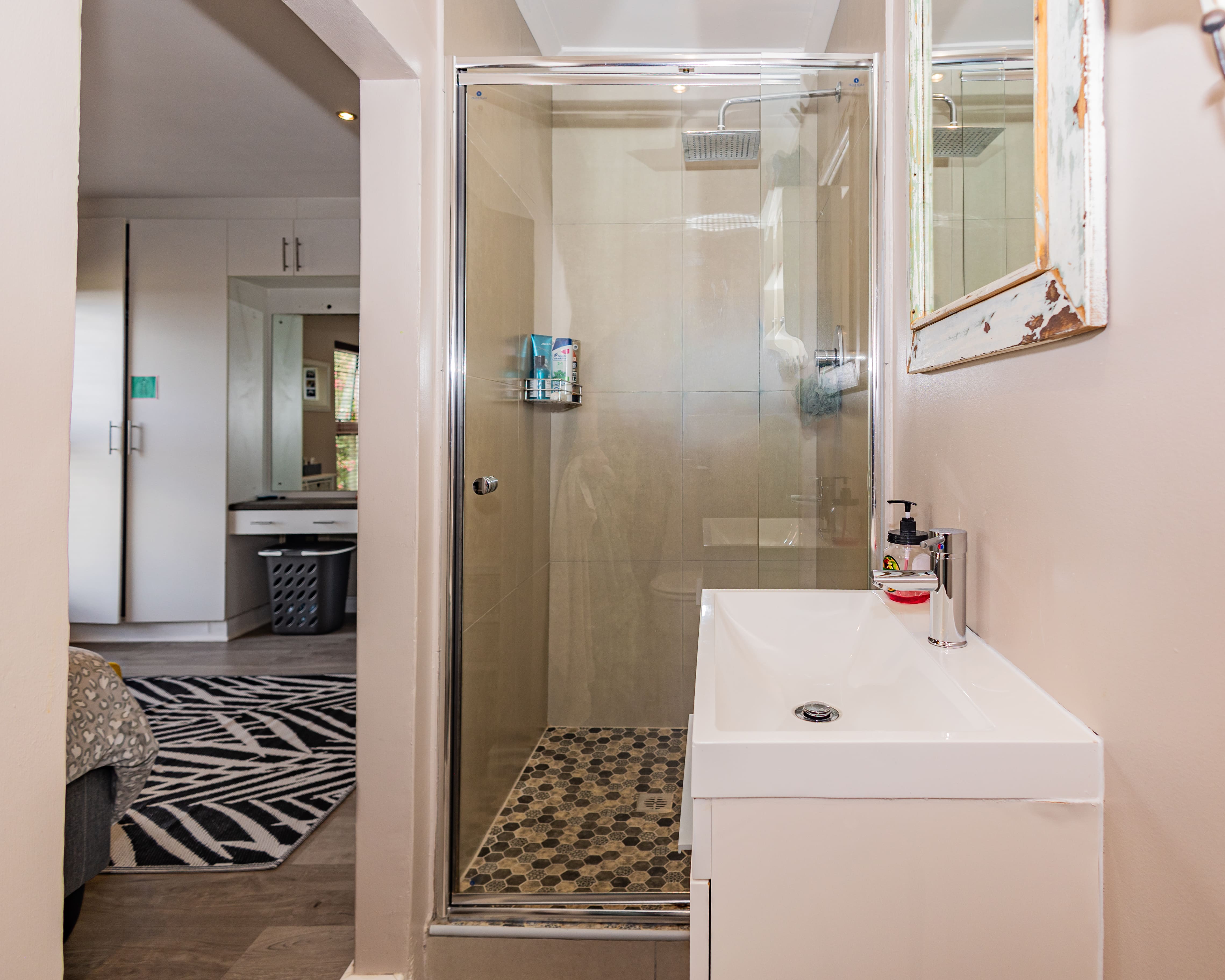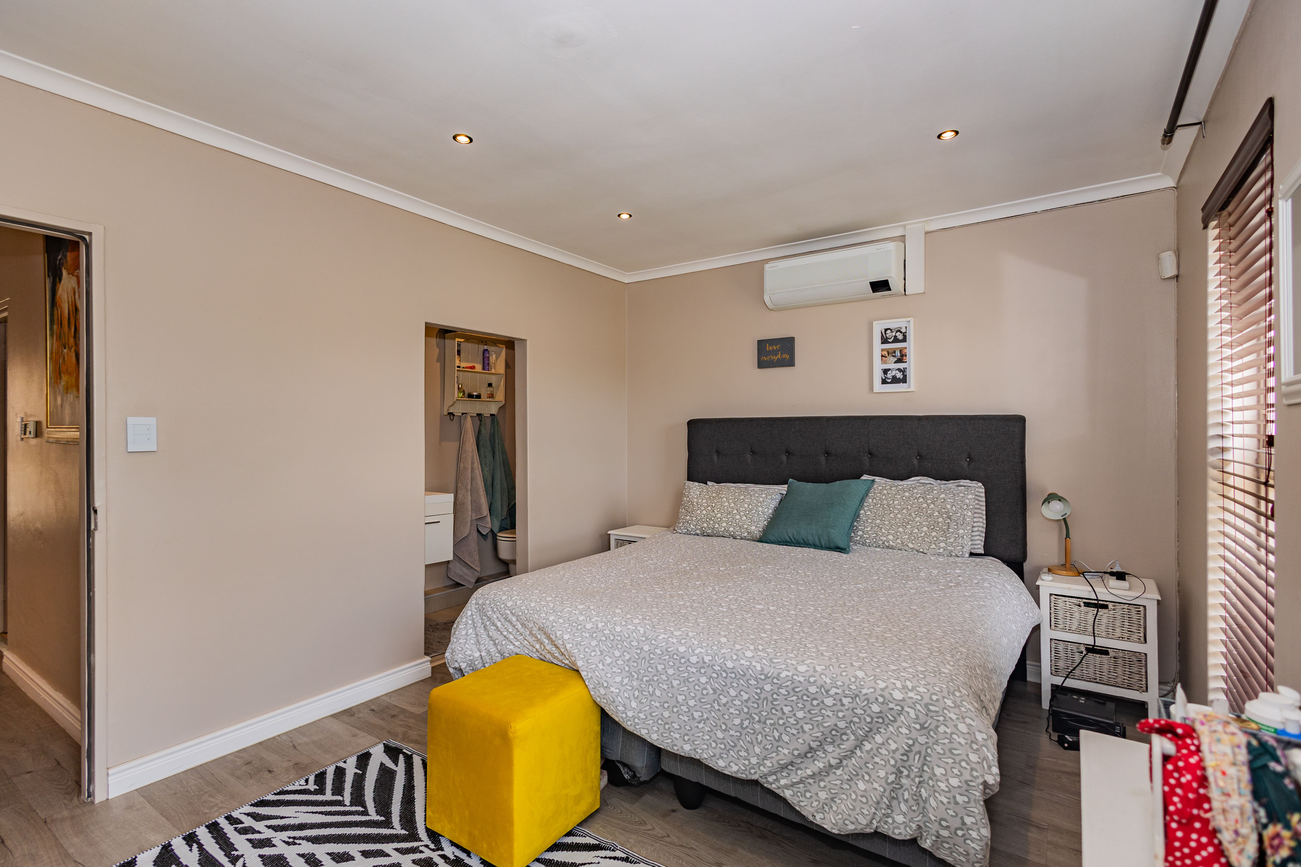 The master suite sits privately to the far right, offering built in cupboards and a sleek en suite bathroom with a shower and basin. Just off the passage is a full modern bathroom serving the additional bedrooms, finished with a basin, toilet, and shower.