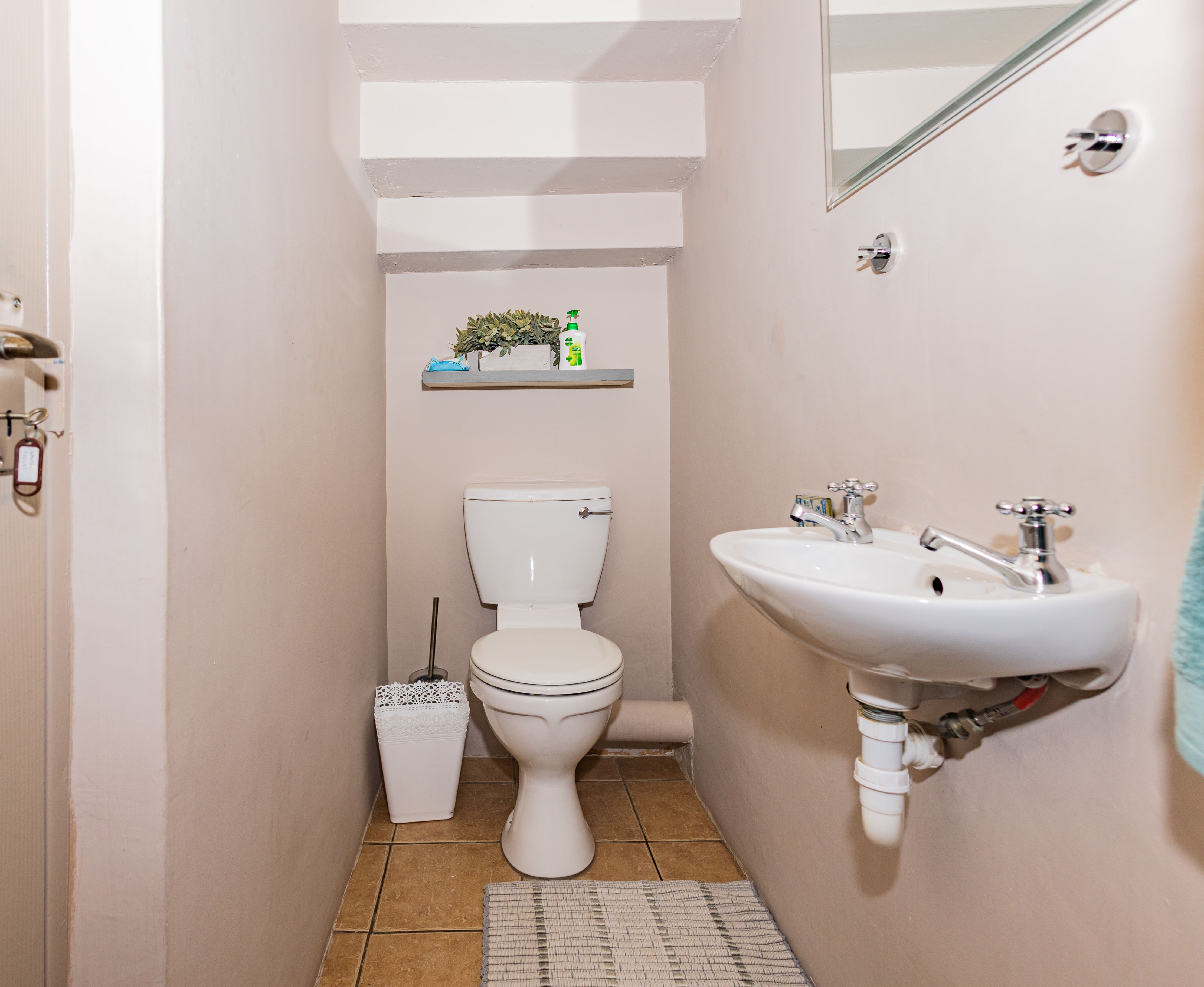 A guest toilet with a basin is conveniently positioned between the TV lounge and kitchen, while a back door provides easy access to the washing line area.