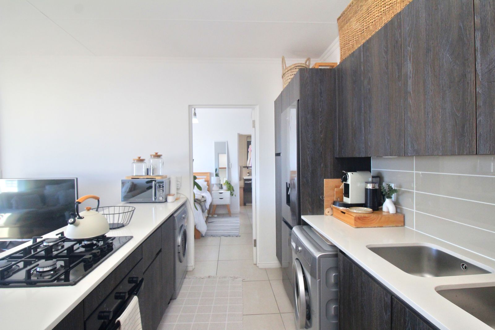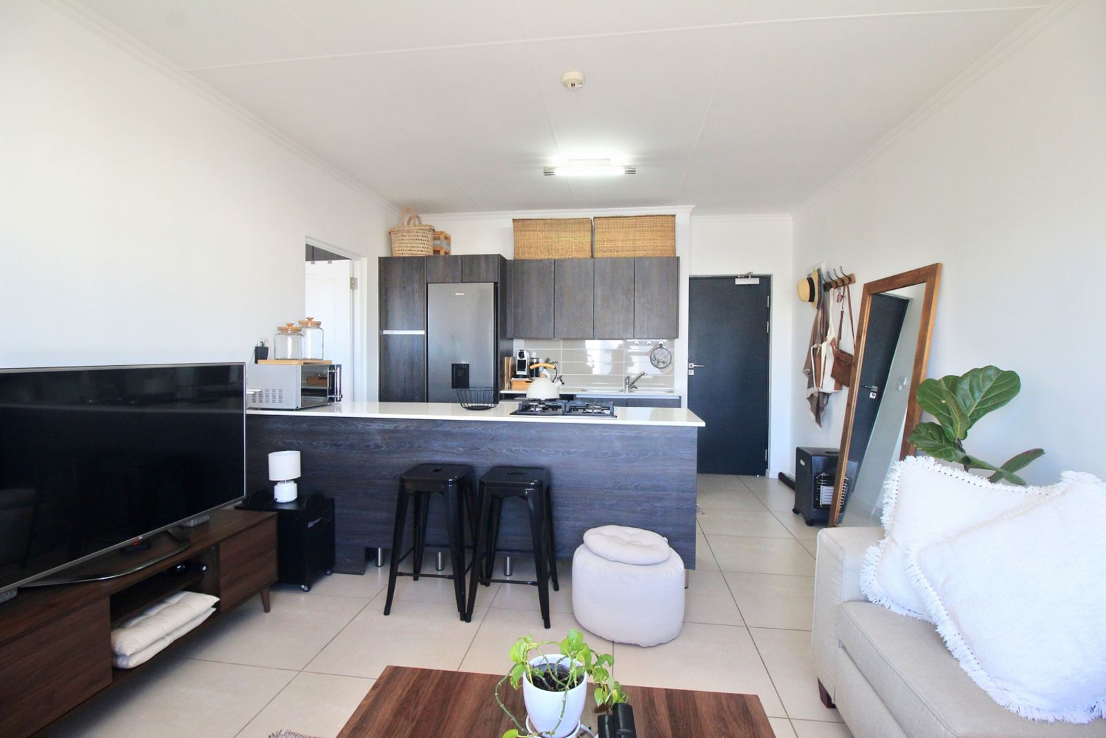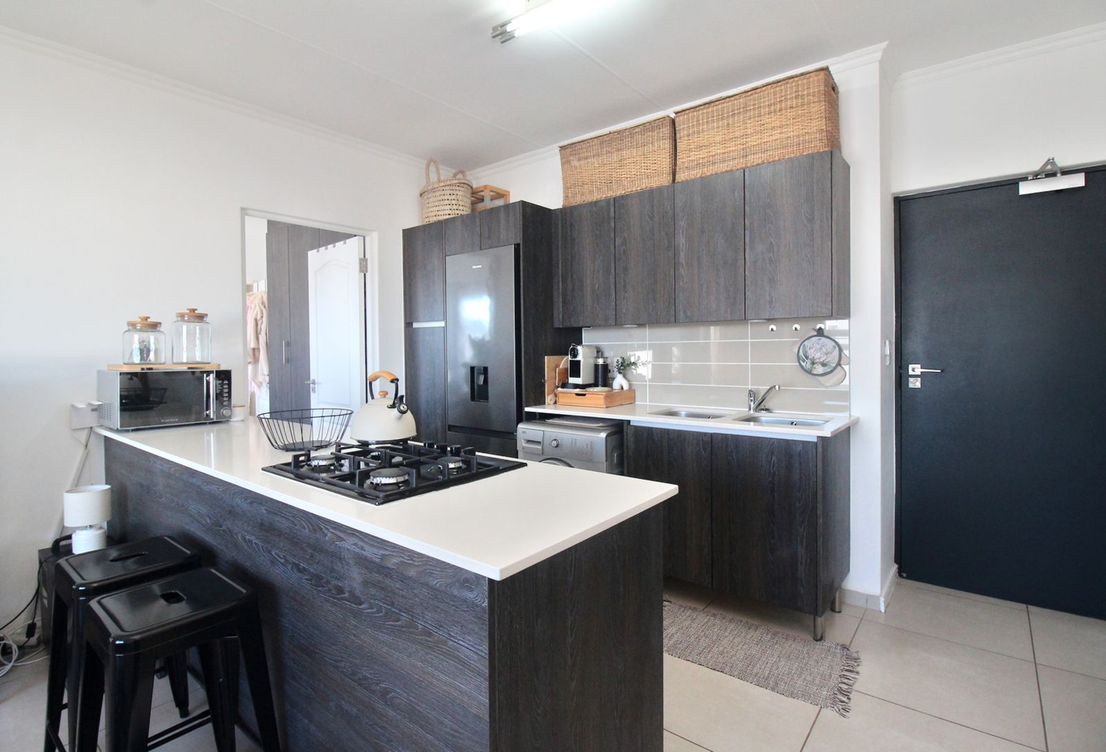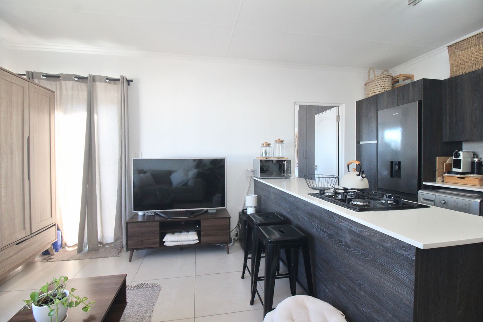 This large, exceptionally neat and beautifully presented 1-bedroom apartment offers comfortable, modern living, with lots of natural light in a secure estate. The bedroom features an en-suite bathroom with a double shower, toilet, and basin, as well as generous cupboard space. The open-plan kitchen and lounge area is well-sized and includes a breakfast nook, gas hob, electric oven, fridge, washing machine, and tumble dryer. Tiled throughout, with lots of natural light, both the lounge and bedroom open with sliding doors to a private balcony — perfect for relaxing or enjoying a braai.