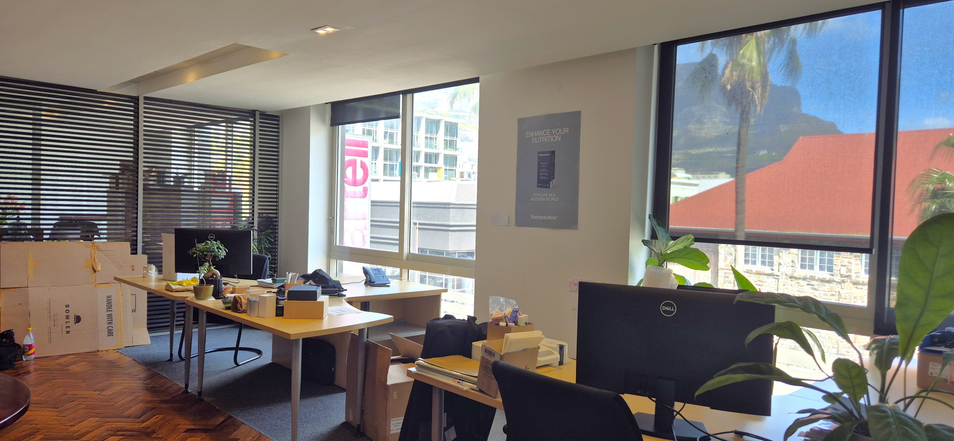 This 210sqm first-floor office at The Hudson offers a fully fitted, plug-and-play workspace ideal for a professional firm or creative business. The layout includes a reception area, three boardrooms, an open-plan section, kitchen, server room, and private balcony with views of Table Mountain. High-quality finishes, excellent natural light, and fibre connectivity make this an efficient and impressive space ready for immediate occupation.