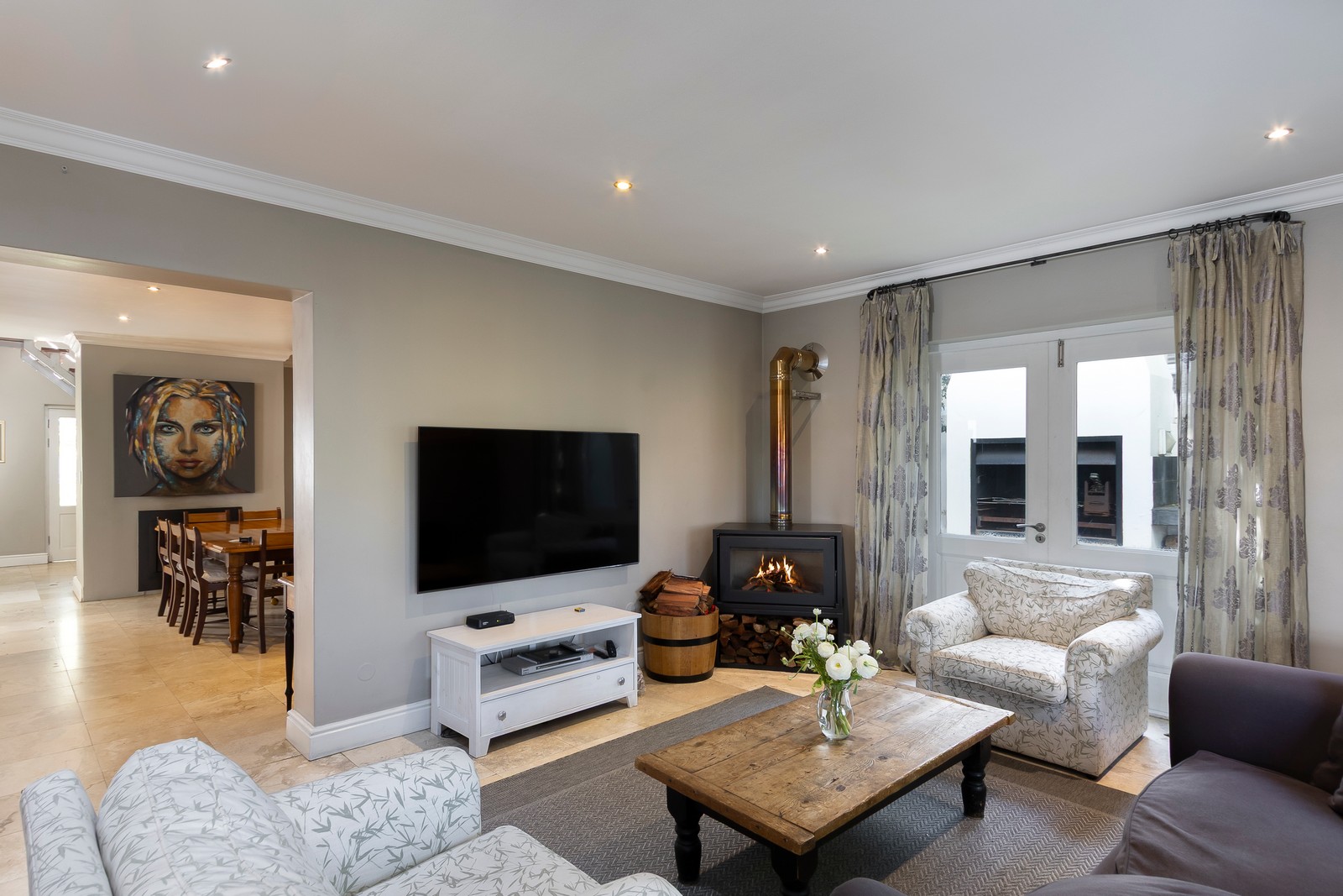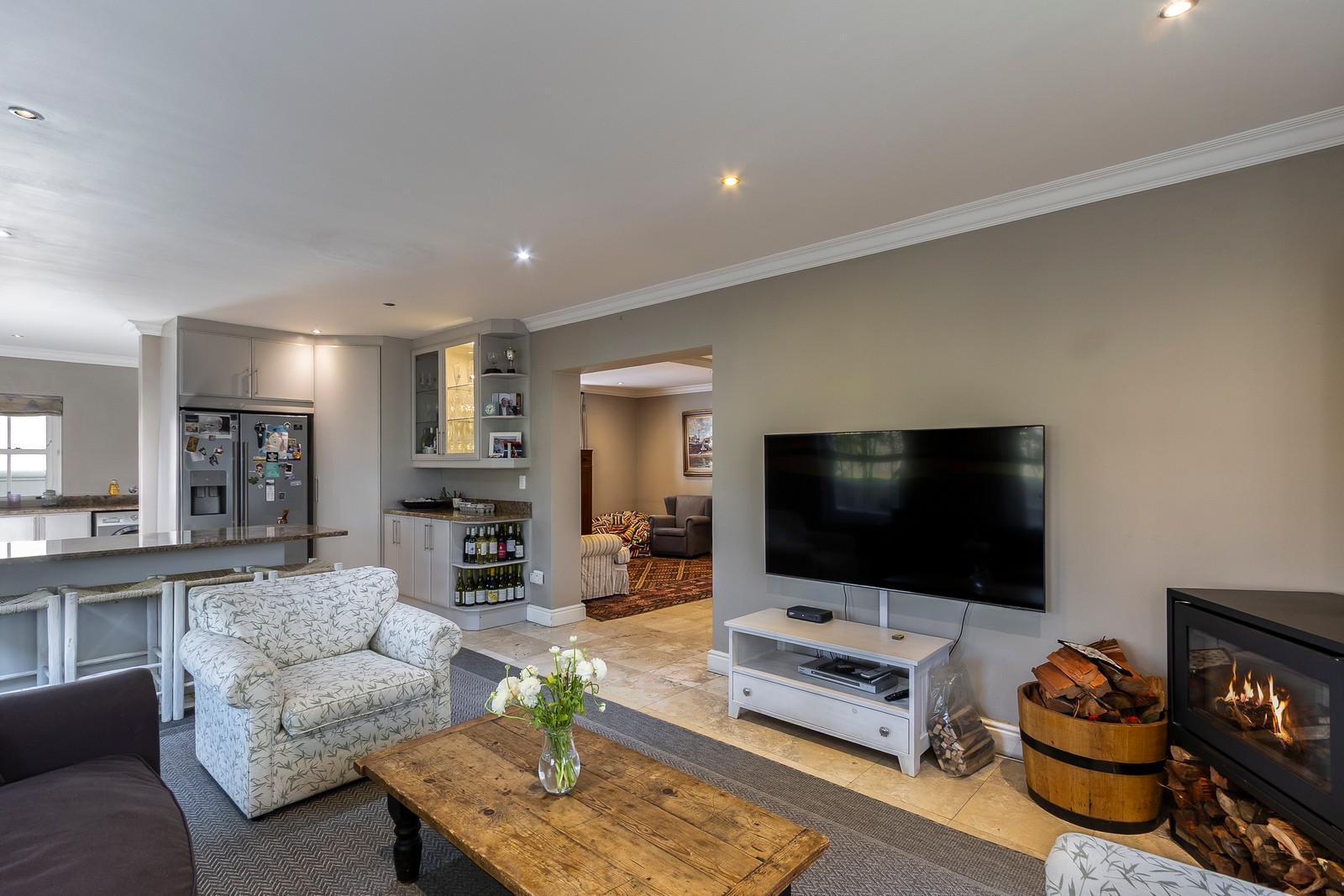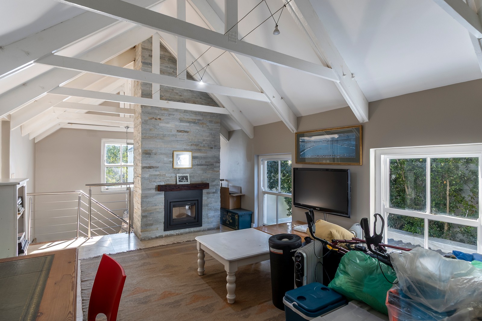 The living areas are generous and offer various options. Currently configured as an open-plan kitchen with informal lounge as well as another lounge / dining room open plan configuration. The home has stunning easterly views towards the mountains. There is also a large office area with wall length bookshelves all warmed up by a modern combustion fireplace.