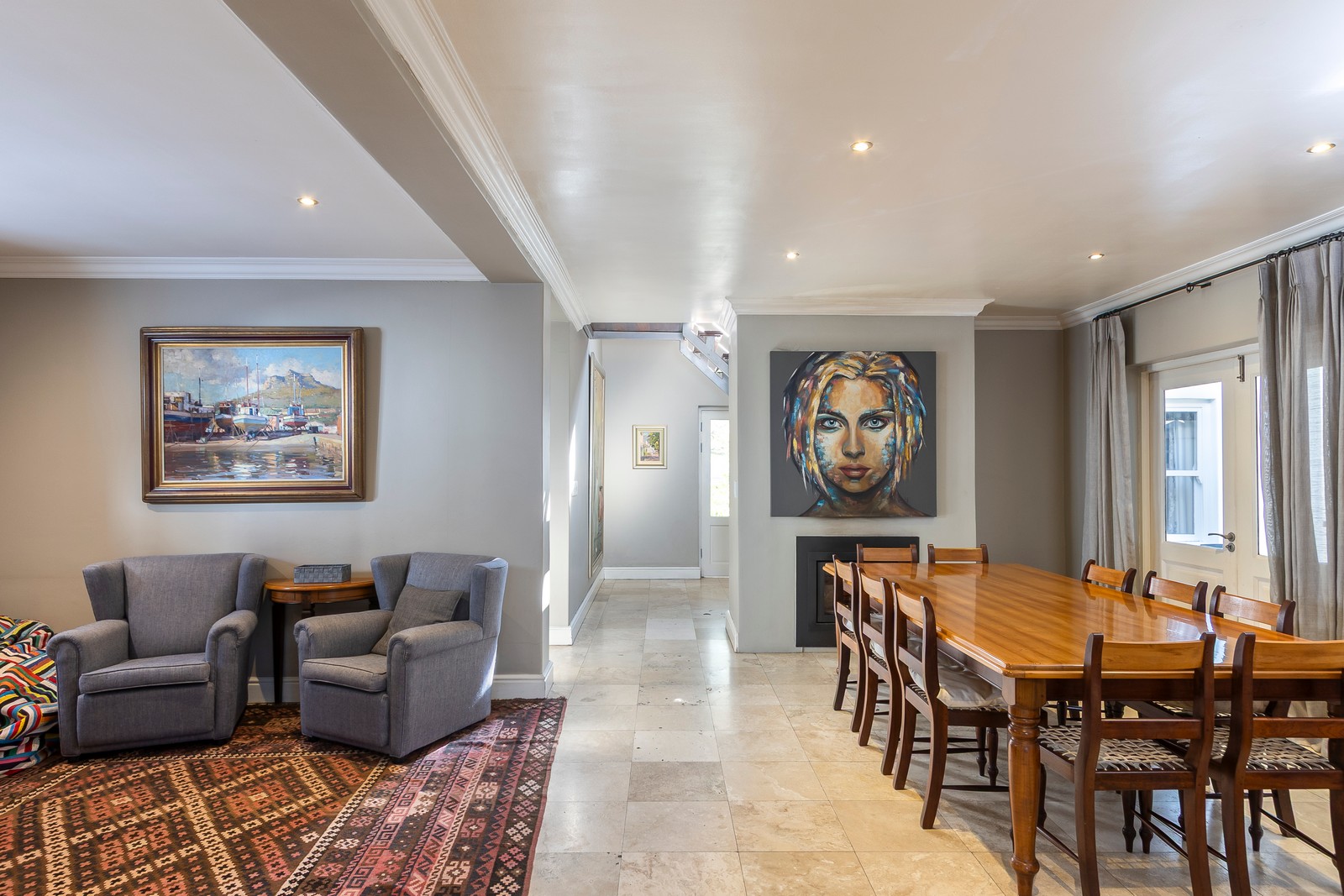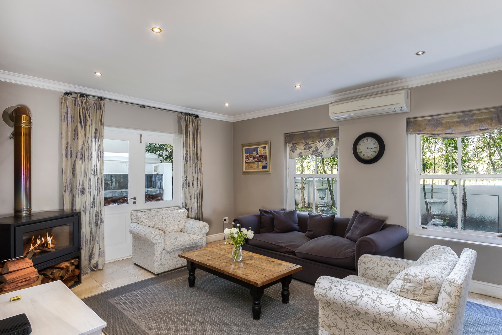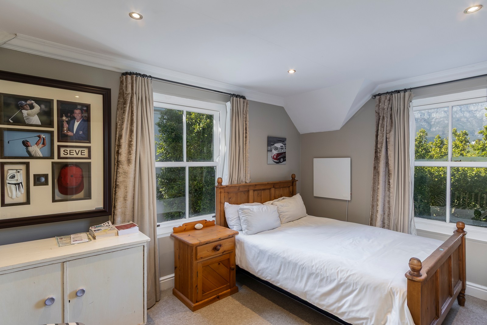 The living areas are generous and offer various options. Currently configured as an open-plan kitchen with informal lounge as well as another lounge / dining room open plan configuration. The home has stunning easterly views towards the mountains. There is also a large office area with wall length bookshelves all warmed up by a modern combustion fireplace.