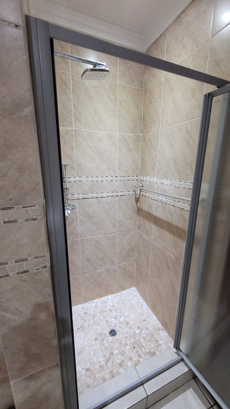 Inside, the home offers a warm and stylish atmosphere. The main bedroom is tiled with built-in cupboards and is equipped with an air-conditioner for year-round comfort. The en-suite bathroom features a shower, basin, toilet, and a luxurious bathtub fitted with relaxing jacuzzi jets. The second and third bedrooms are also tiled, fitted with built-in cupboards and steel window frames, providing comfort and durability. The second bathroom is complete with a bathtub, shower, toilet, and basin.