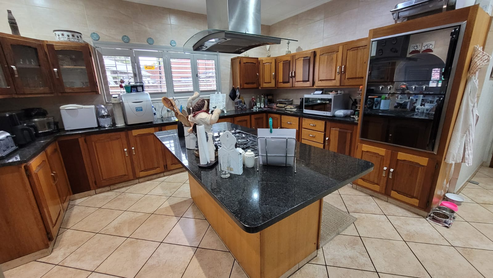 The living room / TV room is spacious and inviting, featuring tiled floors, air-conditioning, and a built-in bar, making it ideal for family gatherings or entertainment. The kitchen is fitted with granite countertops, a center island, a gas hob, eye-level oven, extractor fan, and steel window frames. A separate scullery and laundry area provides convenience and practicality.