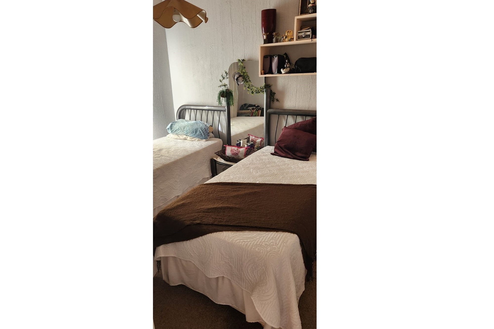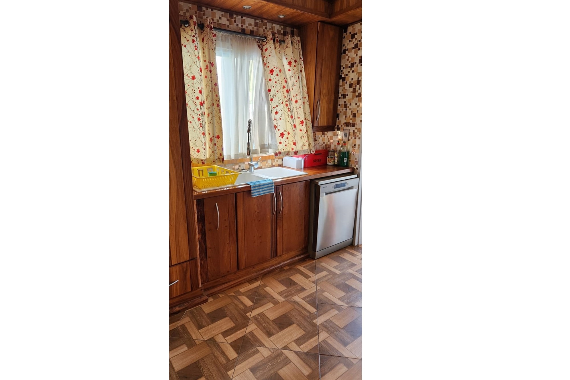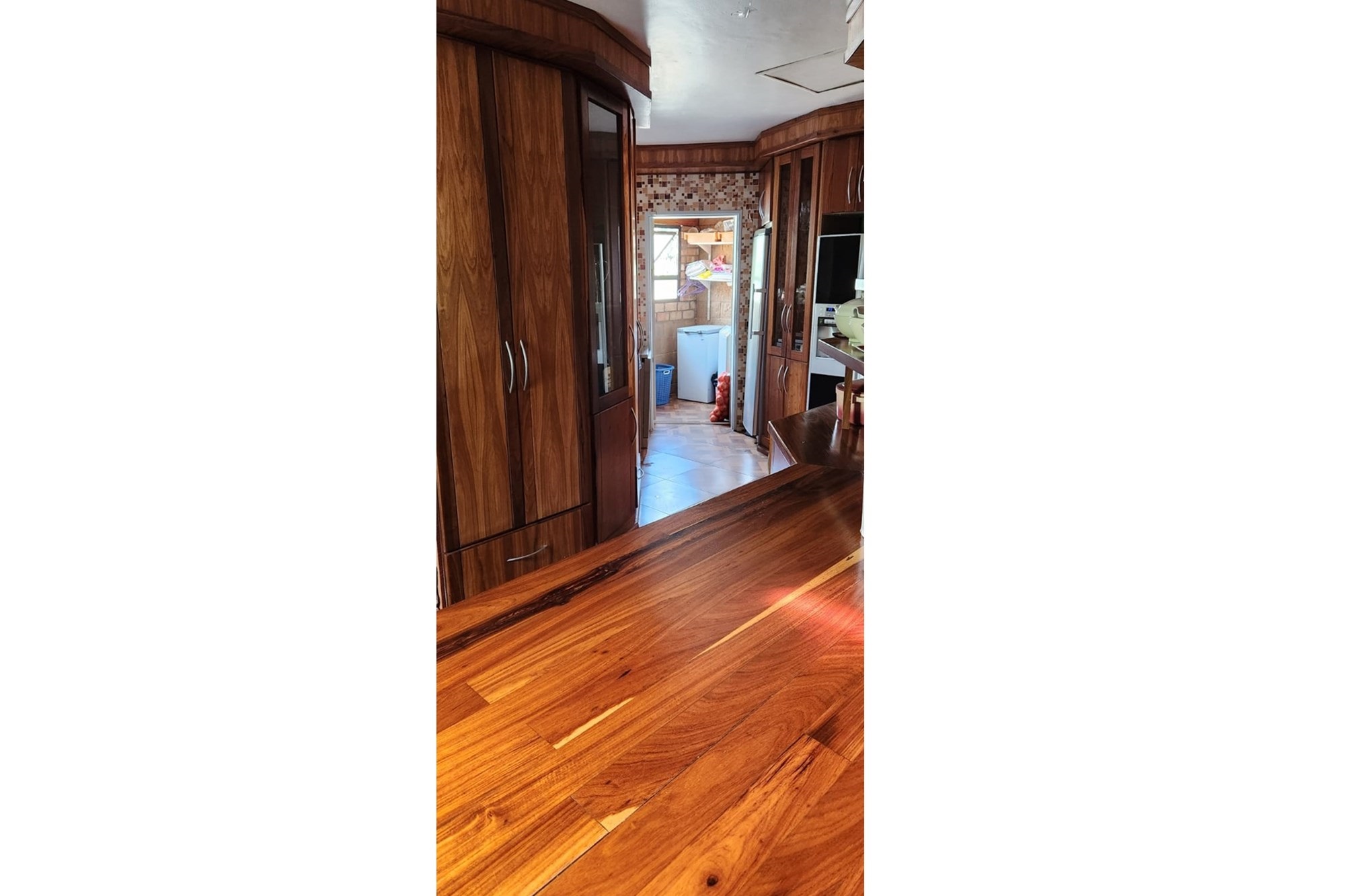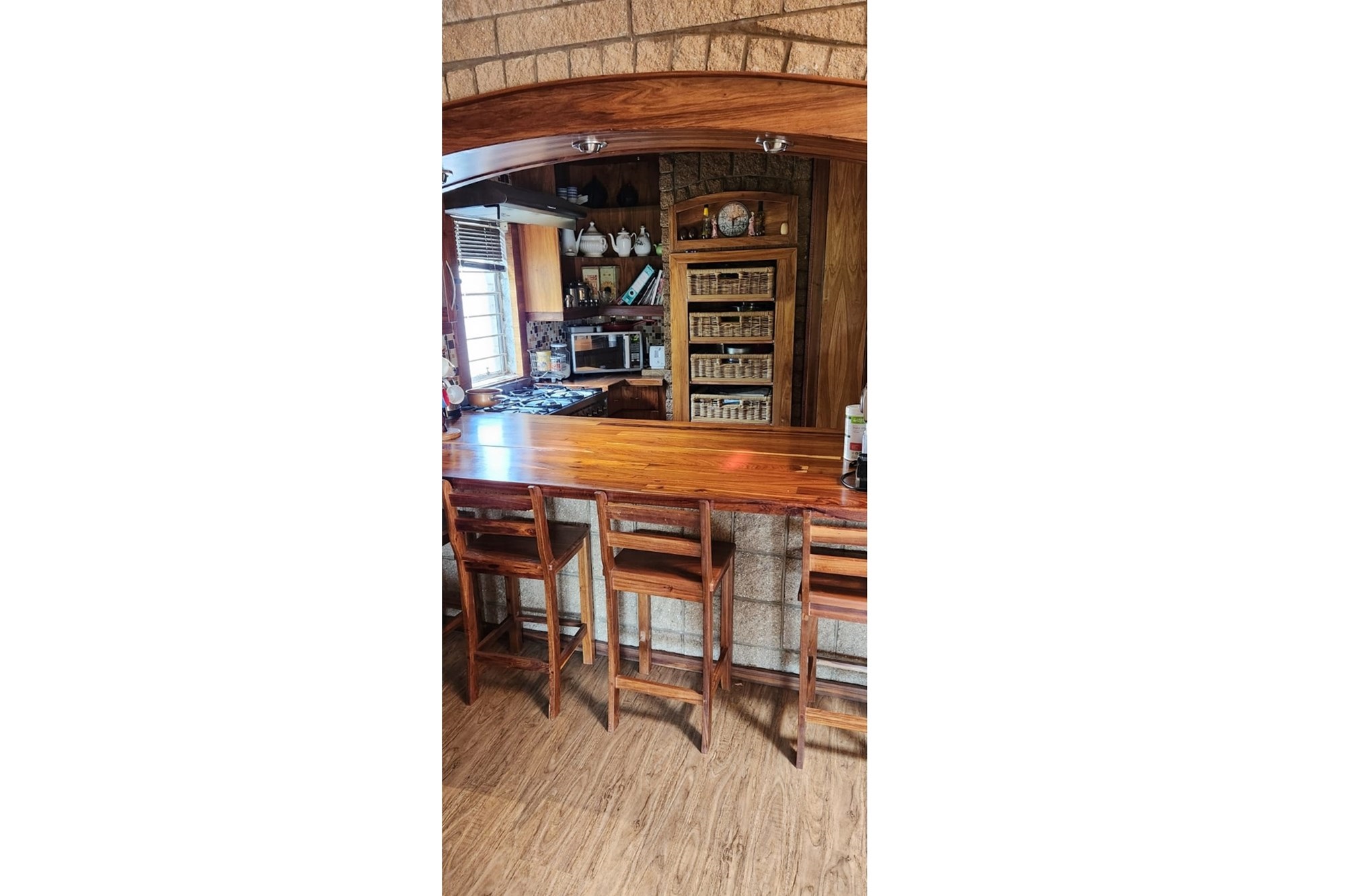 Upstairs Living Space– Bright and open-plan with solid wood kitchen cabinets, breakfast counter, lounge, bar area, and a pantry.