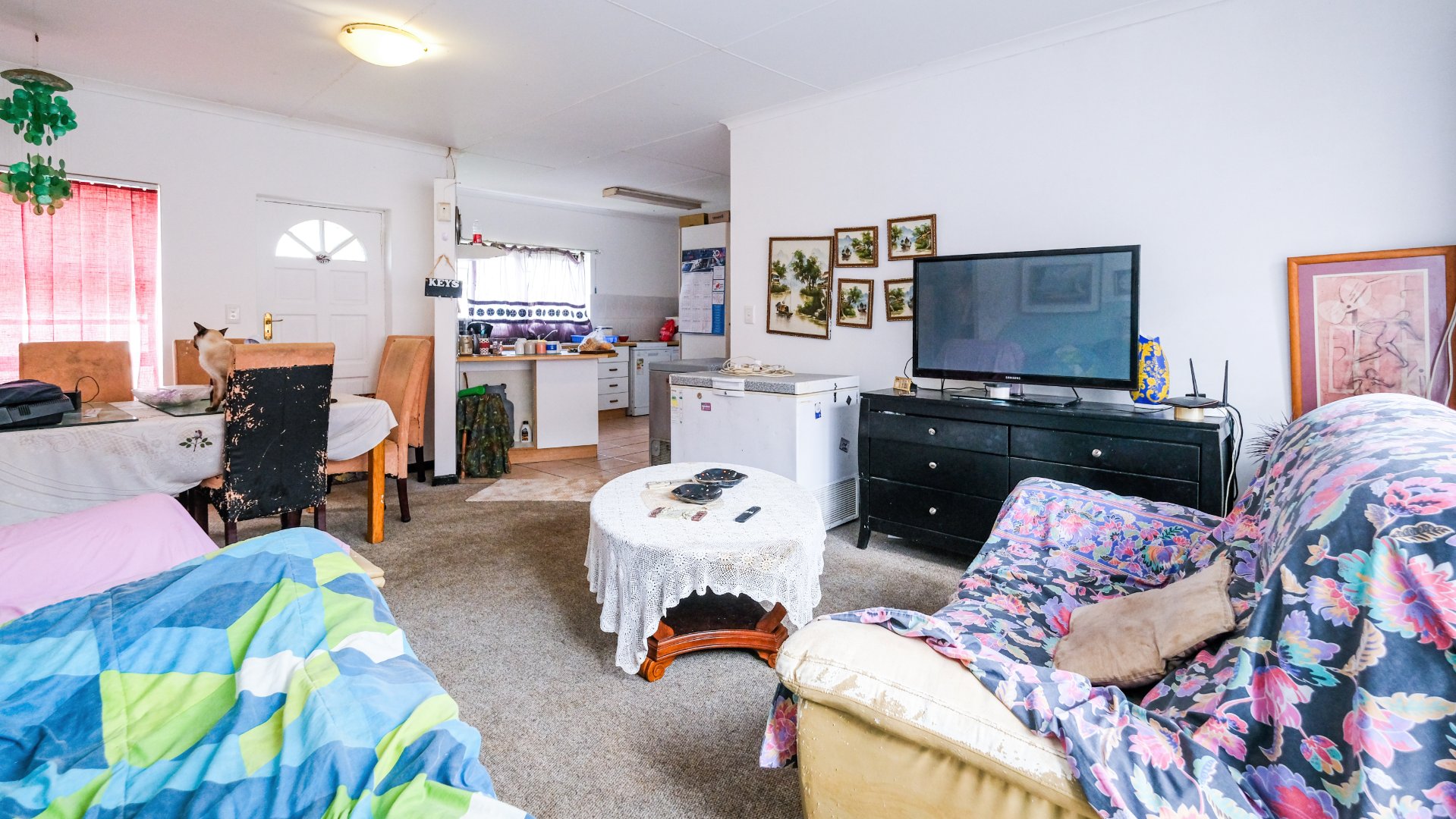 Inside, you'll find two bedrooms, with the flexibility to convert an additional space into a third bedroom or recreational room. A full bathroom serves the home. The open-plan kitchen, dining, and living area feels spacious, leading out through sliding doors to a patio, ideal for enjoying the fresh air. While the inside could use a revamp and the outside some TLC, the low-maintenance exterior makes upkeep easy.