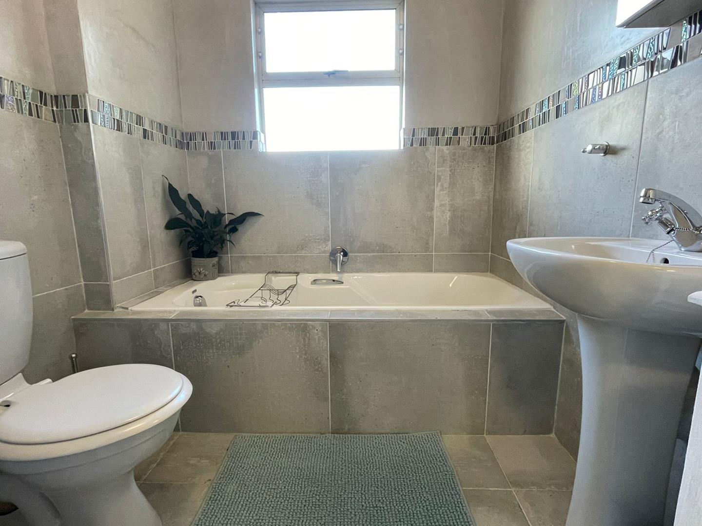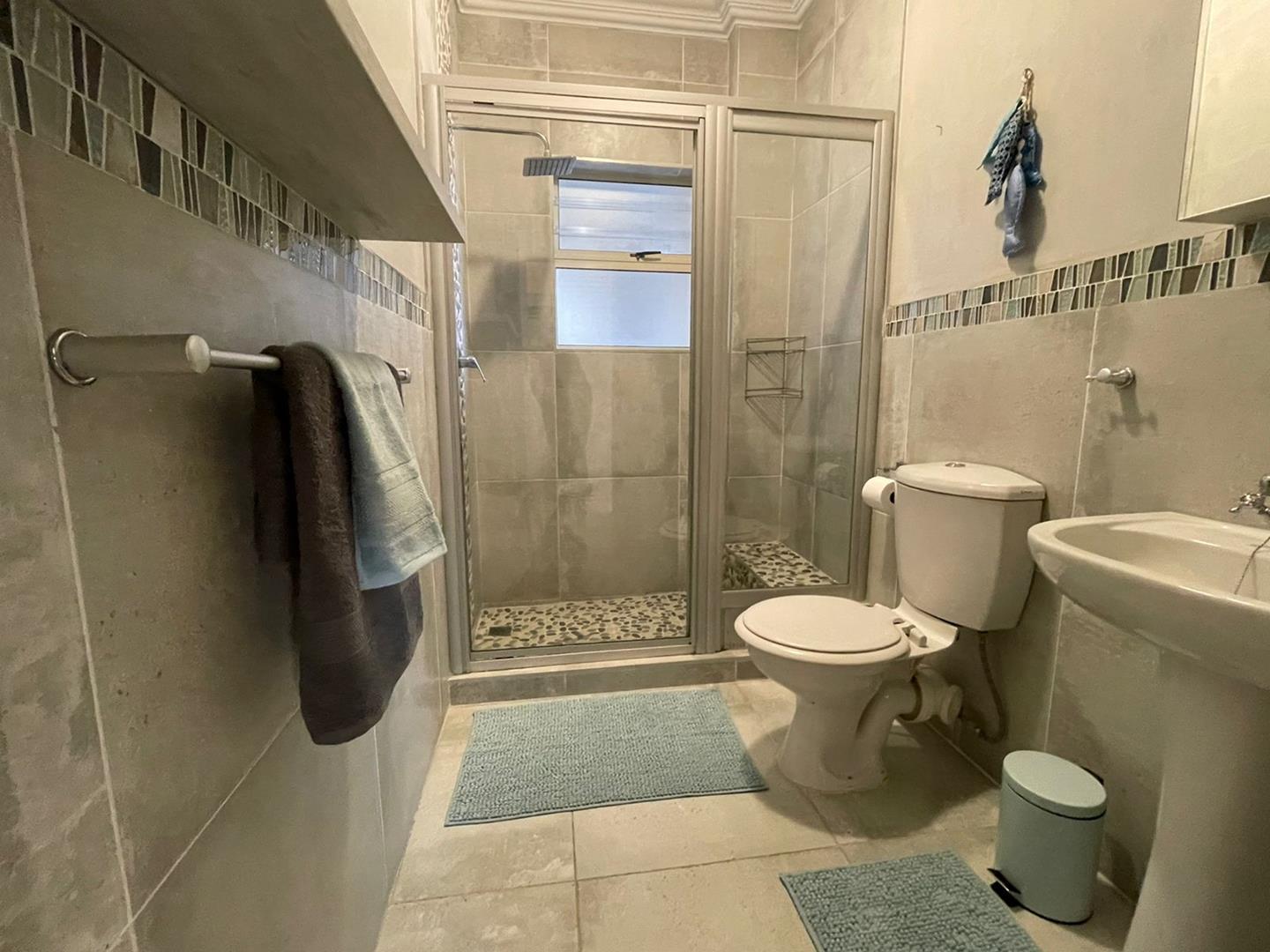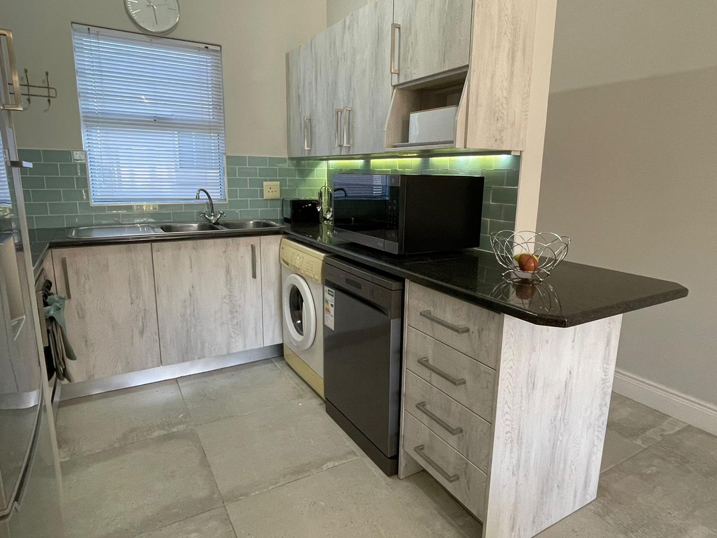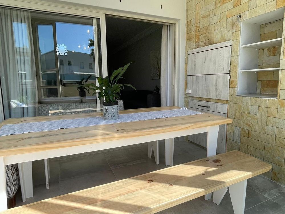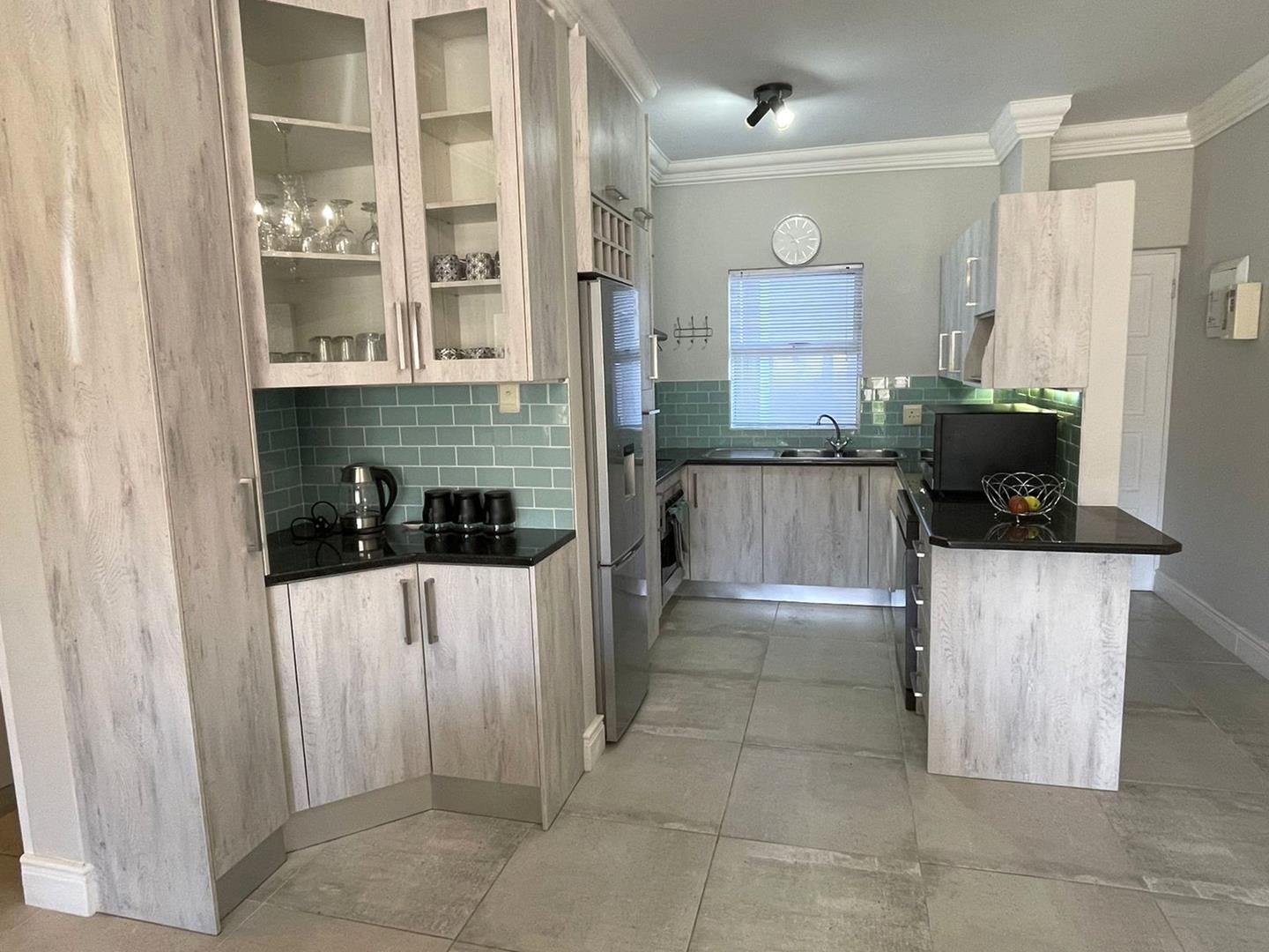 The open-plan kitchen and lounge area create a welcoming space for family gatherings and entertaining guests. Sliding doors lead to an enclosed braai room, which features an indoor braai and a sunny entertainment area—ideal for enjoying South Africa's beautiful weather year-round. Stacked doors open onto a private garden area, offering a serene retreat for relaxation or alfresco dining.