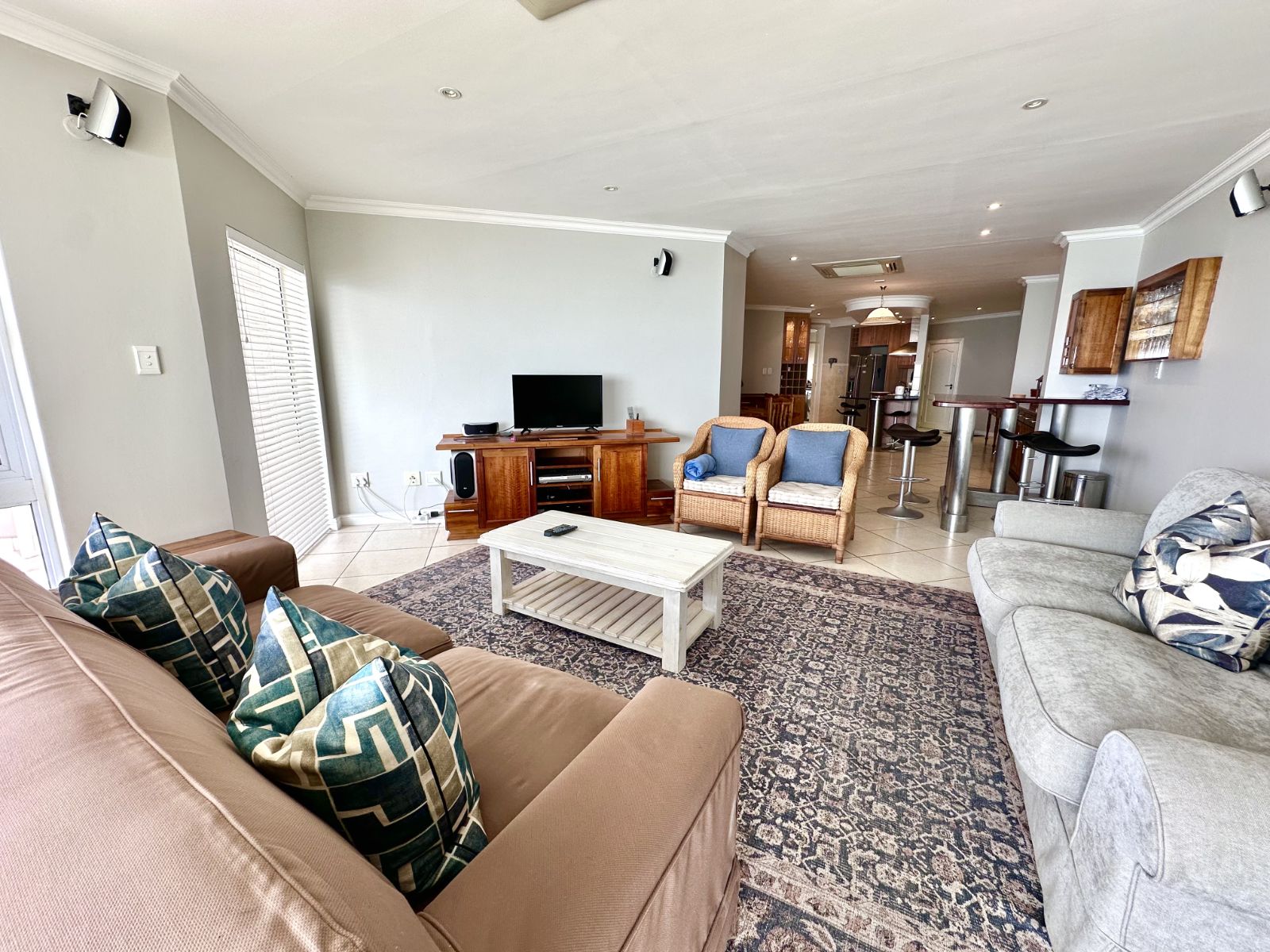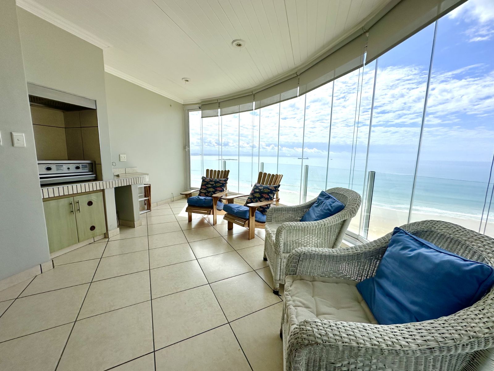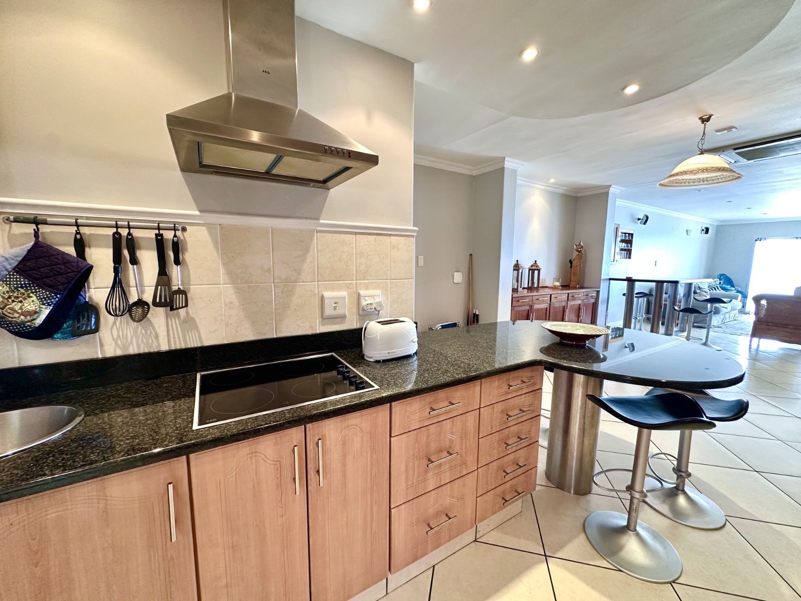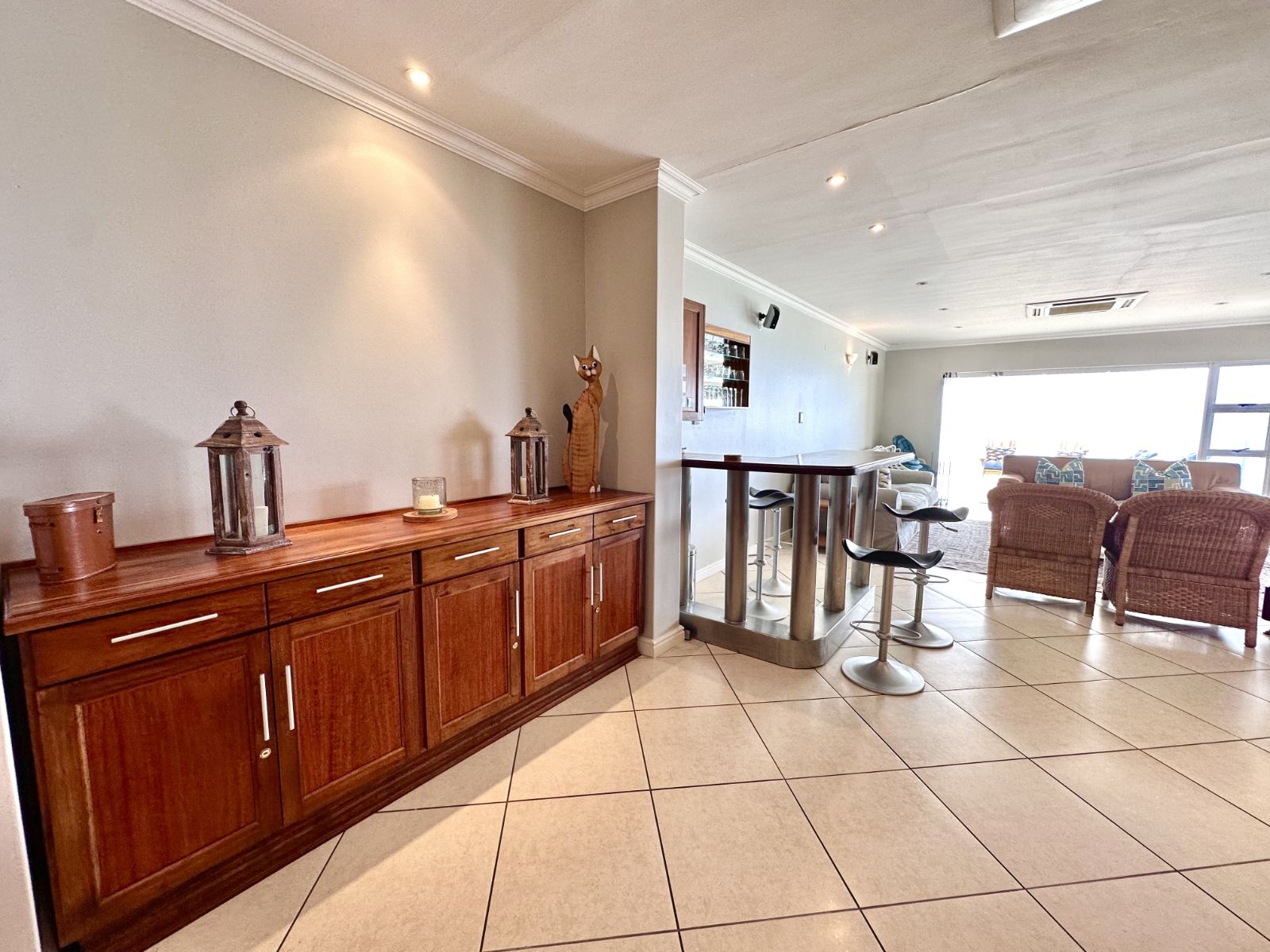 Inside, the apartment features three spacious en suite bedrooms, each providing a private retreat. There is also a guest bathroom for added convenience. The open-plan living area includes a well-appointed kitchen with a scullery, a stylish dining area, and a cozy lounge, ideal for both relaxation and entertaining. A separate bar area adds a touch of luxury, and the patio, with its glass doors and built-in gas braai, is perfect for enjoying the coastal breeze and stunning views while dining outdoors.