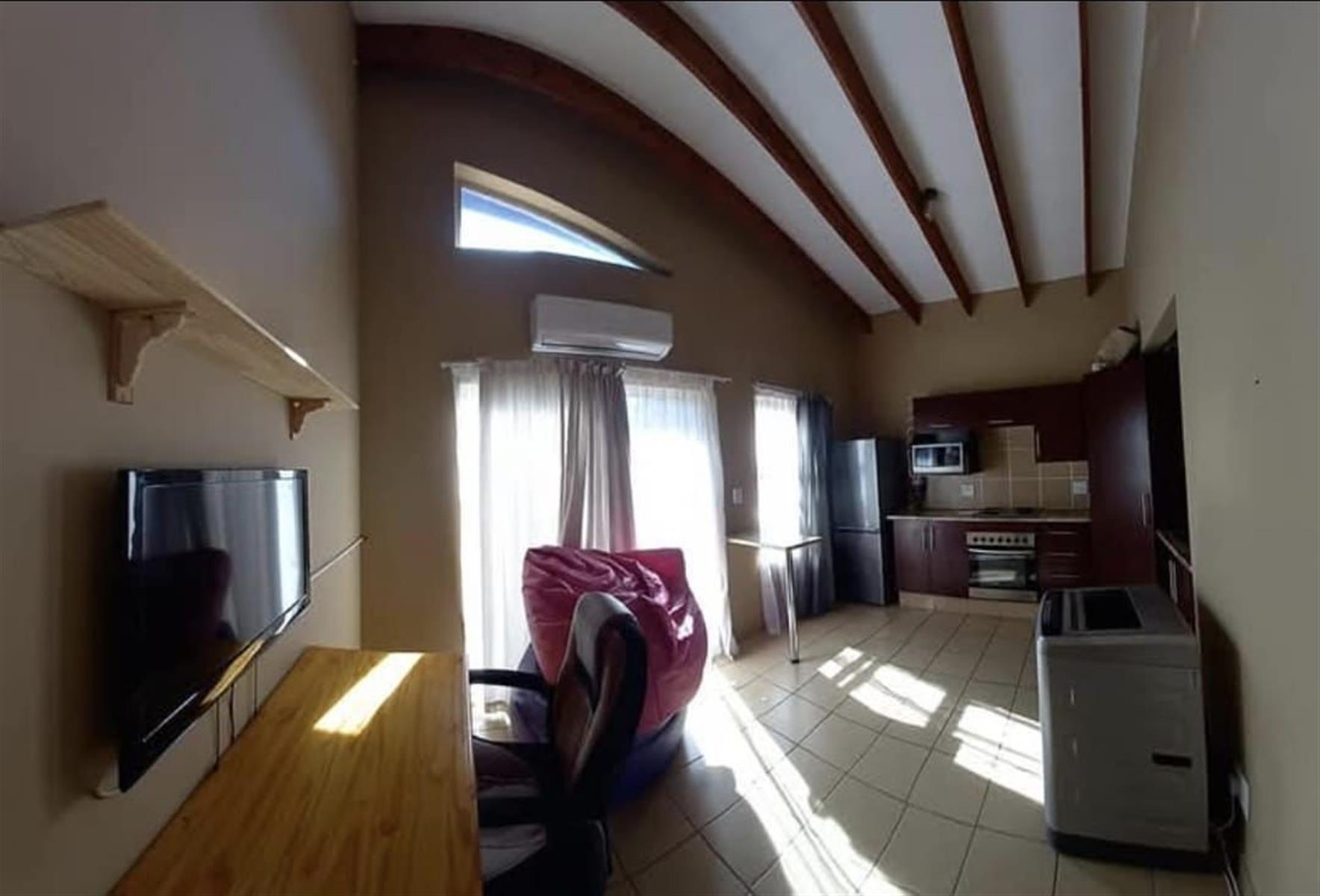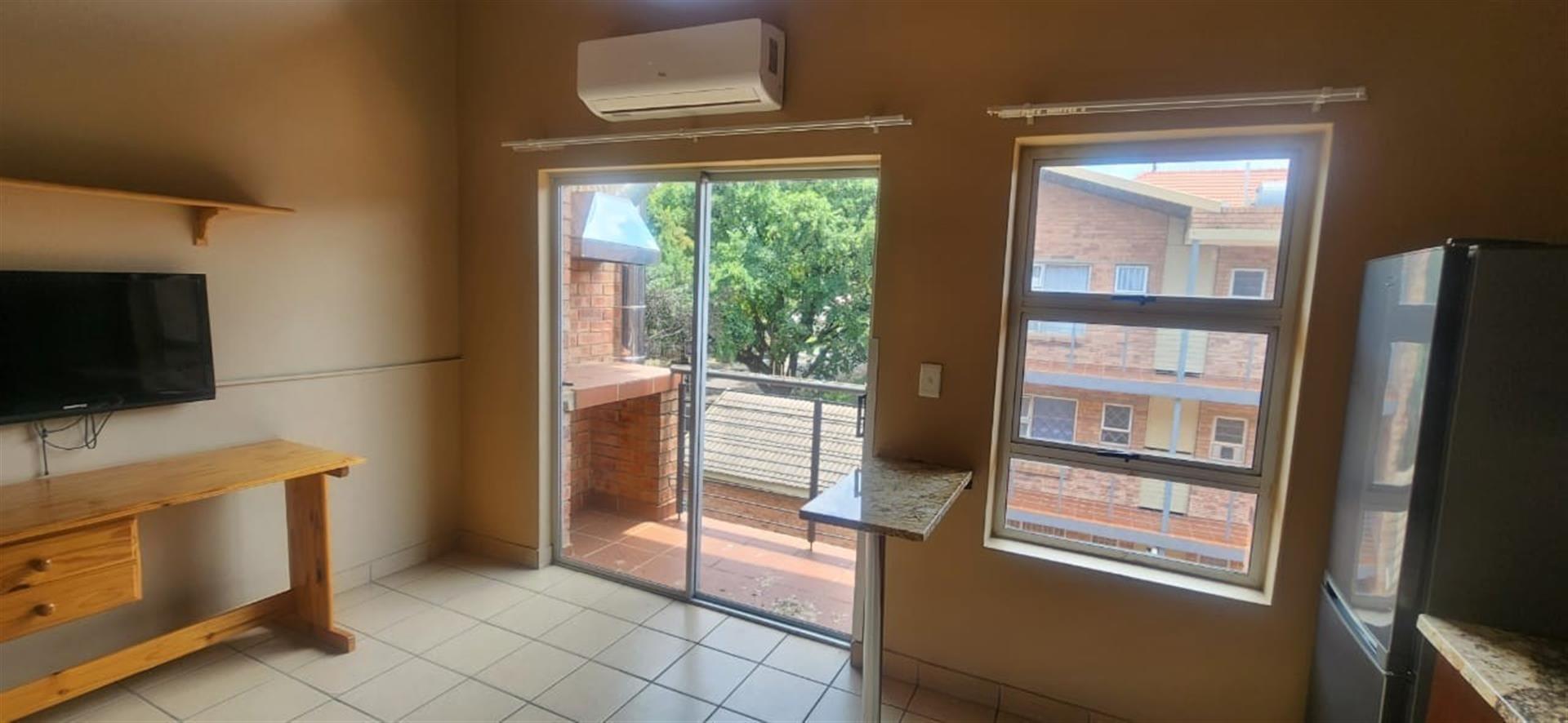 The living area is air-conditioned and provides space for a study desk, and a breakfast nook for easy meals, while the exposed ceiling beams add character and an upmarket feel. Sliding doors lead to a balcony and built-in braai area, enhancing the lifestyle appeal for tenants.