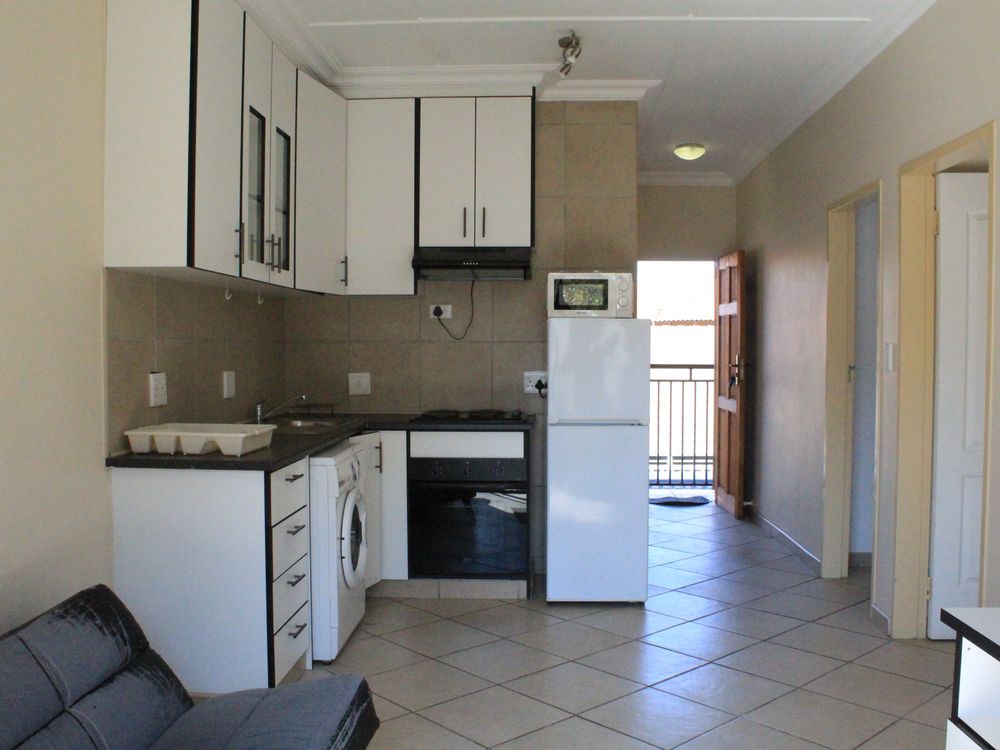 Spacious apartment in a well-kept complex, boasting two bedrooms with built-in cupboards and desks, open plan kitchen and living area, leading to a small balcony.