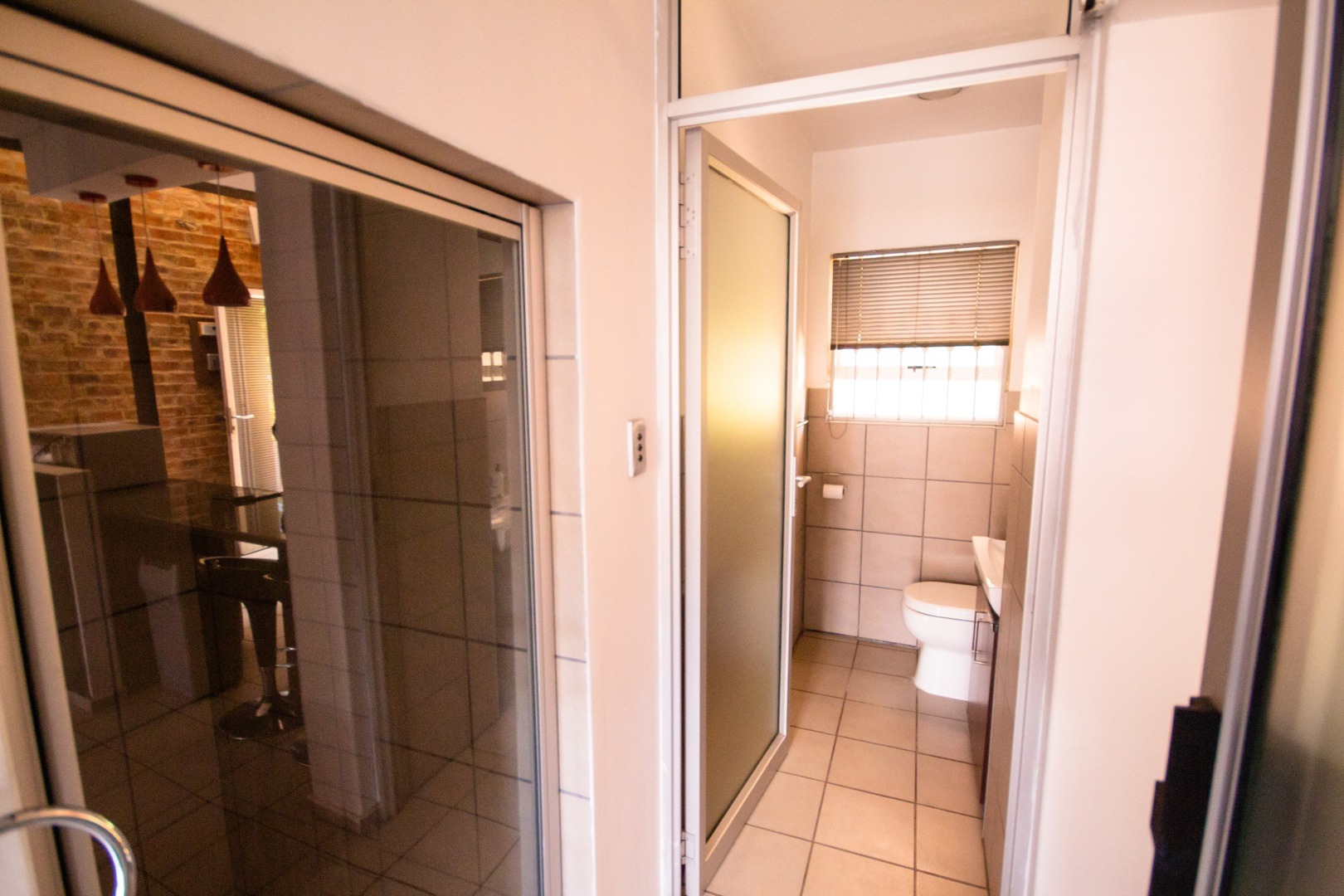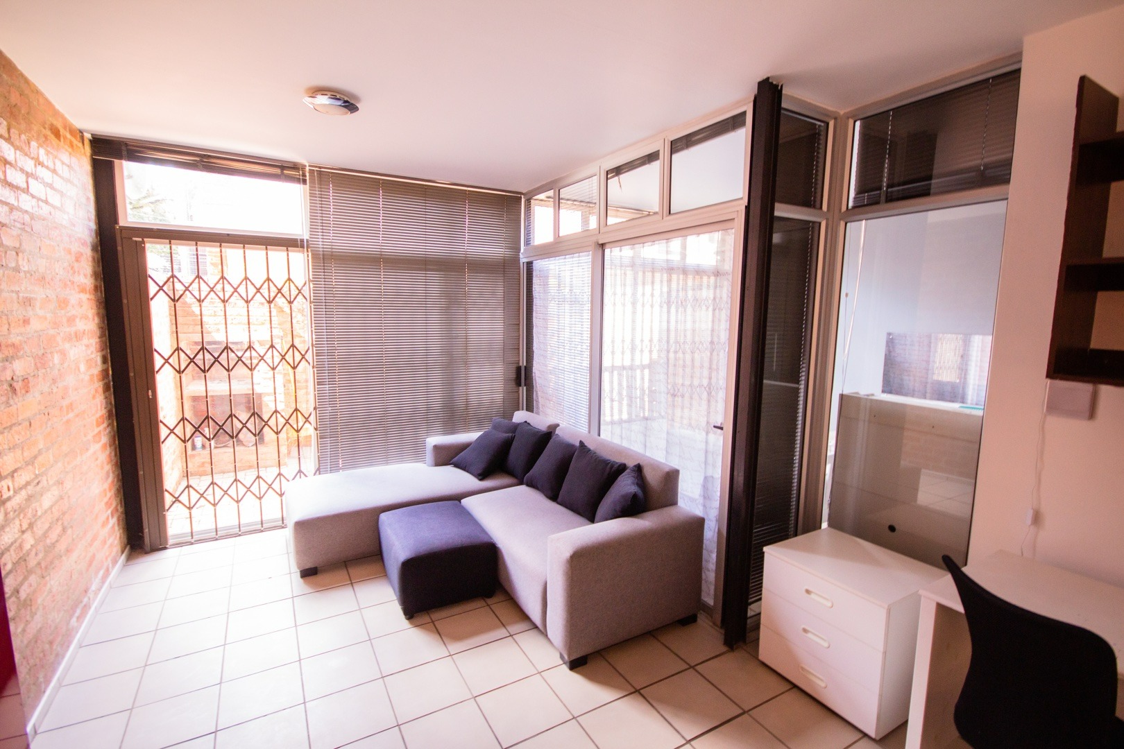 This modern apartment consist of a spacious living room with large couch, book shelves, desk and large cupboard.