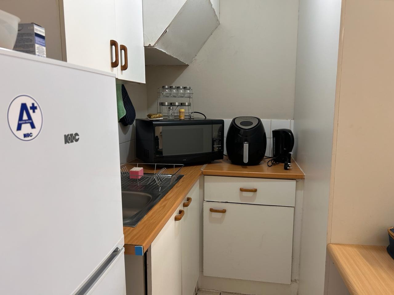 The open-plan layout enhances the sense of space, seamlessly integrating the bedroom and kitchen areas for a functional yet comfortable living experience. The compact kitchen is fitted with essential appliances, combining practicality with contemporary design. Built-in cupboards in the bedroom ensure ample storage and a clutter-free environment.