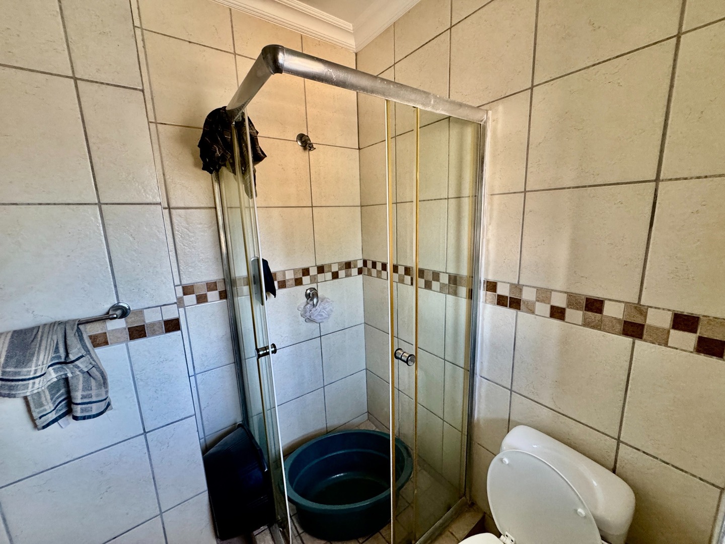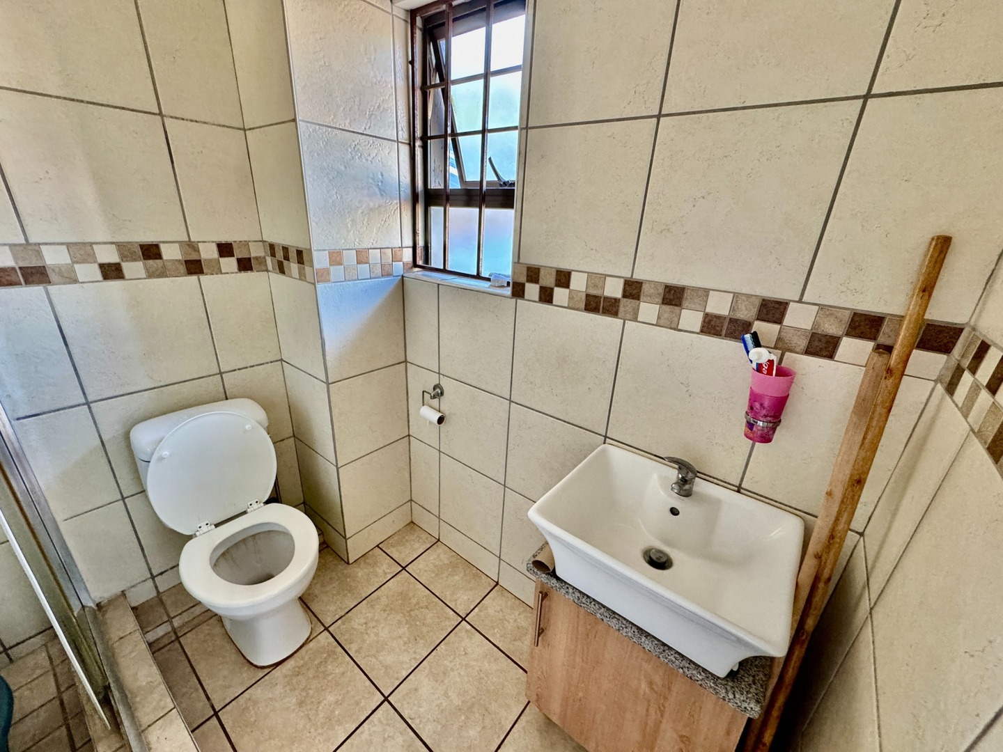 -Neat Bathroom area with a shower, toilet and basin.