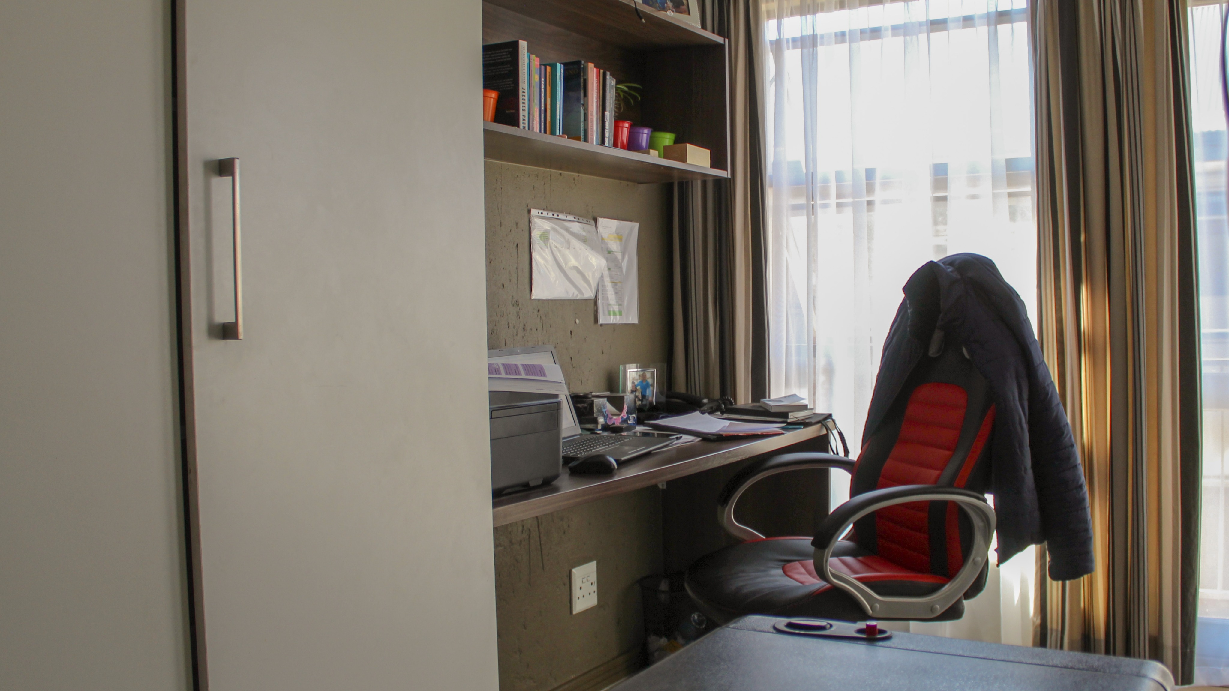 This upmarket apartment features and open plan kitchen with granite tops, hob and under counter oven, flowing into a living area. 2 spacious bedrooms, each fitted with a study area and built-in cupboards as well as a spacious, sharing balcony, The 2 bedrooms shares a full bathroom, with shower, basin, toilet and bath. This property comes with an under roofed parking.