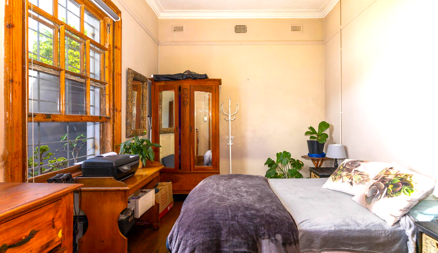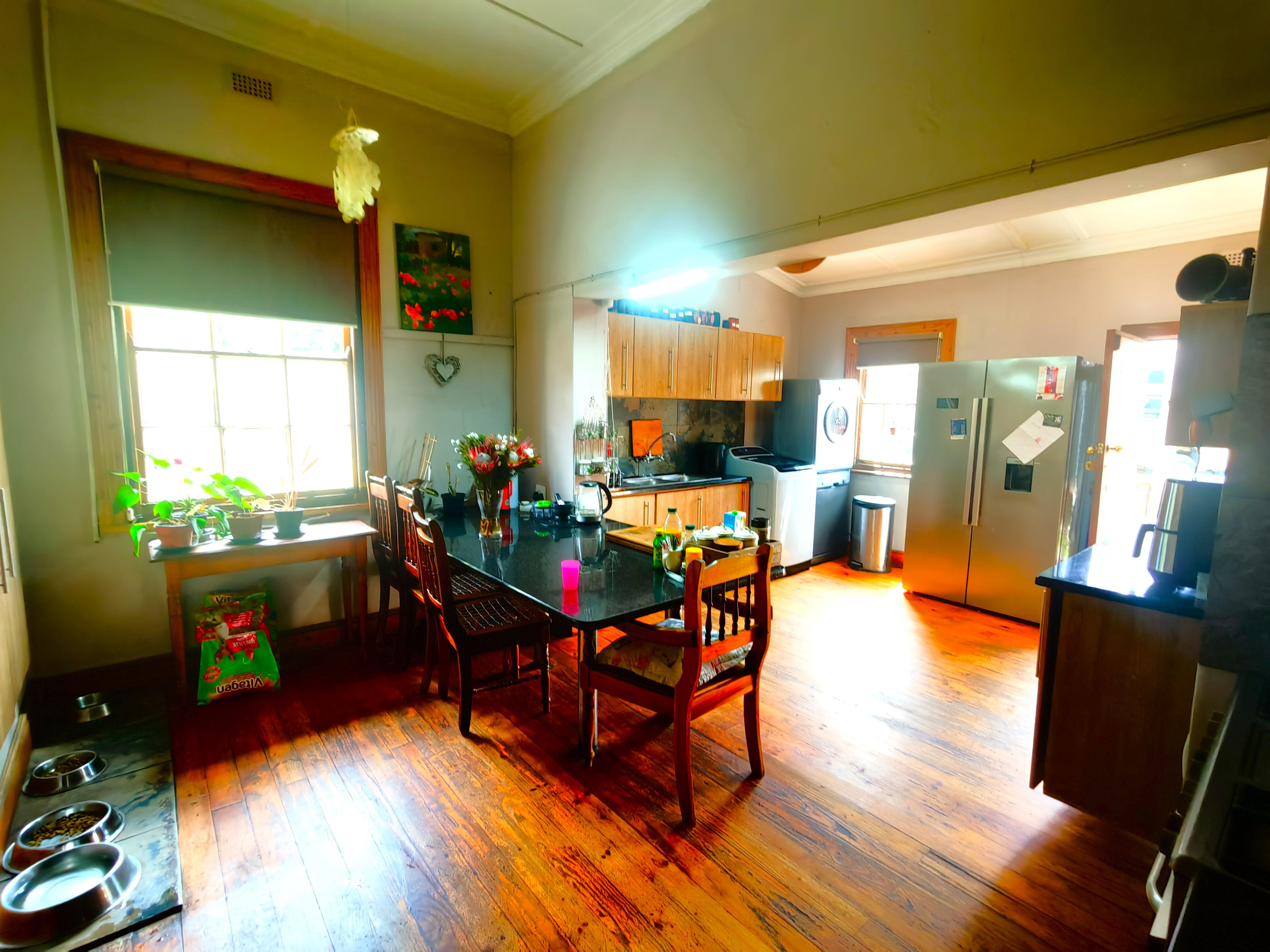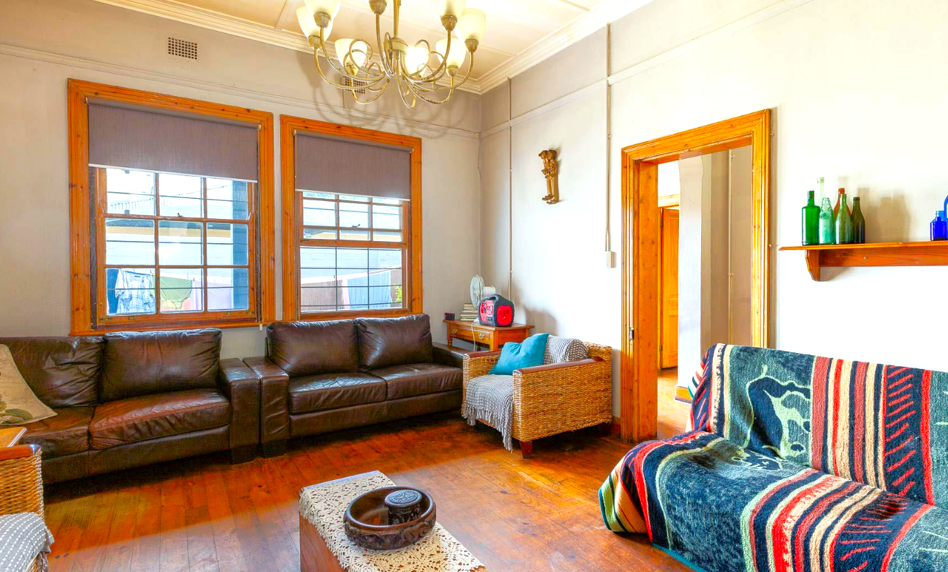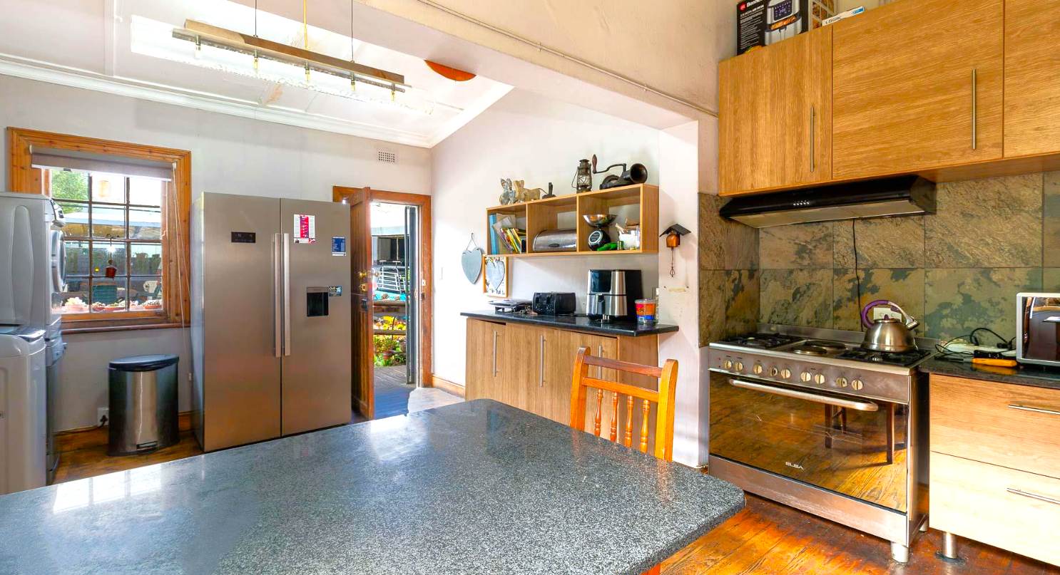 The home features high ceilings, Cape Dutch sash windows, and beautifully preserved wooden floors. The spacious lounge, complete with a fireplace, opens to a large kitchen with a granite breakfast nook, gas hob, and electric oven.