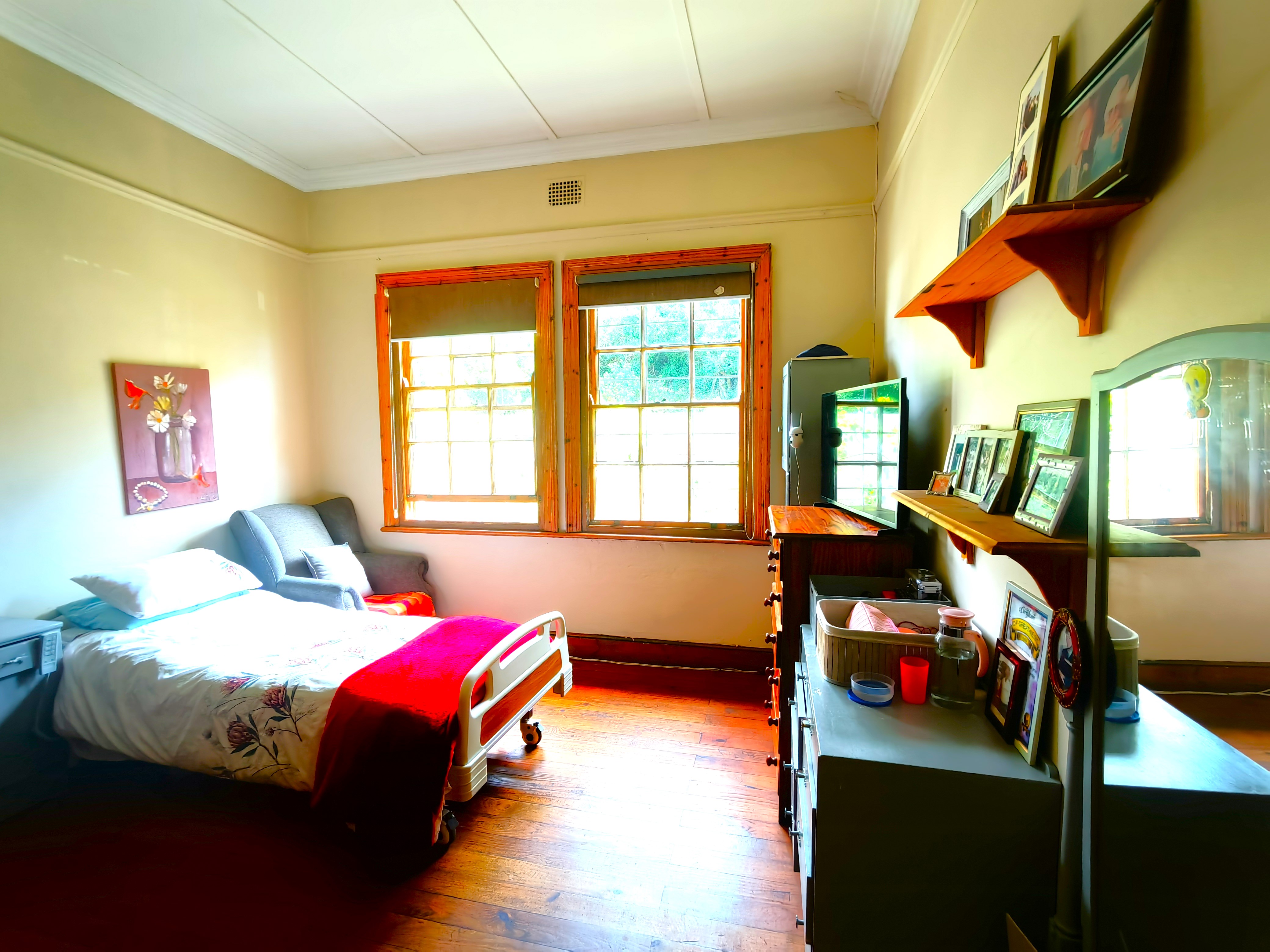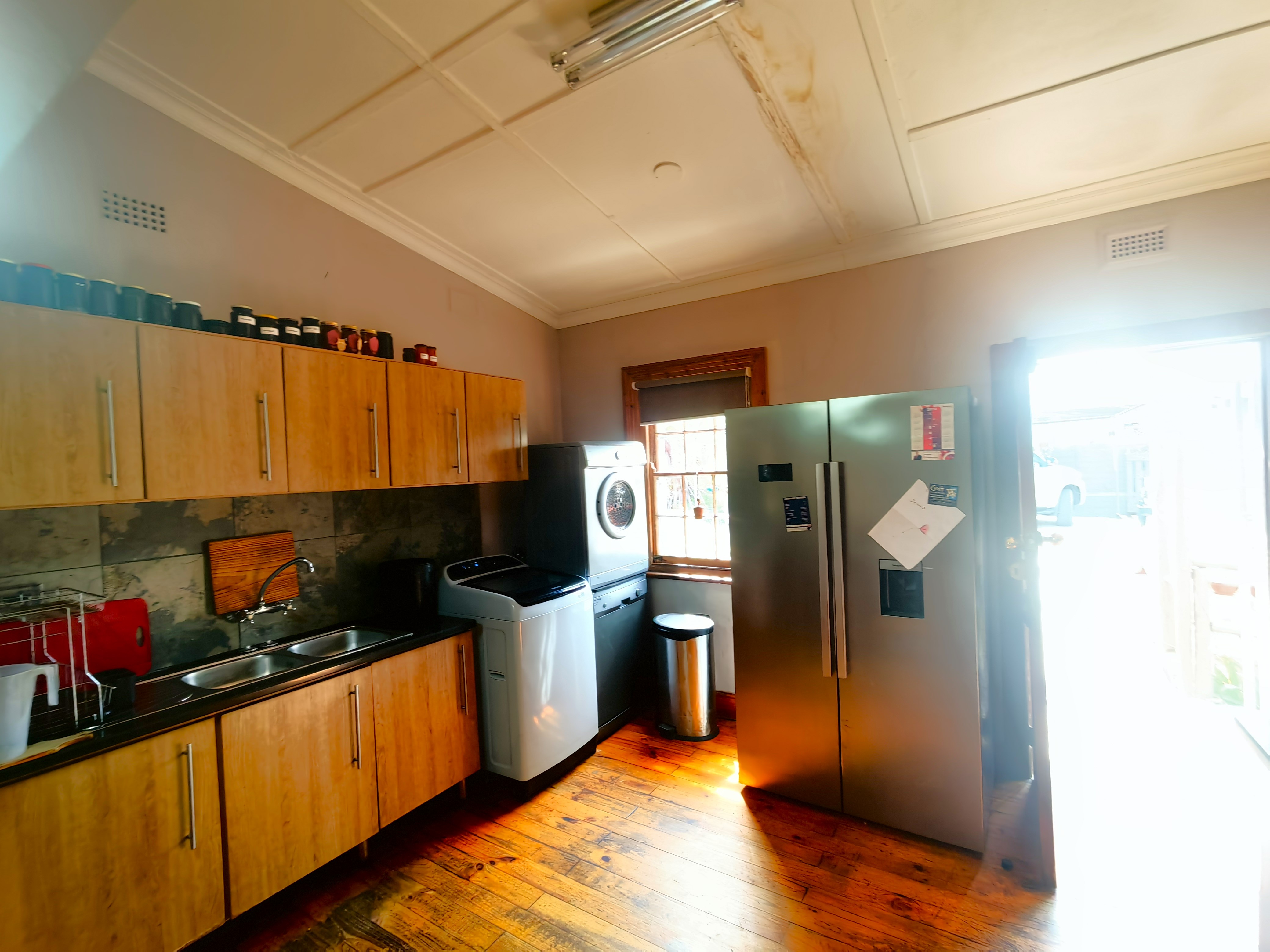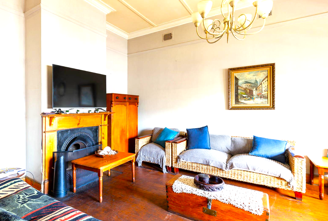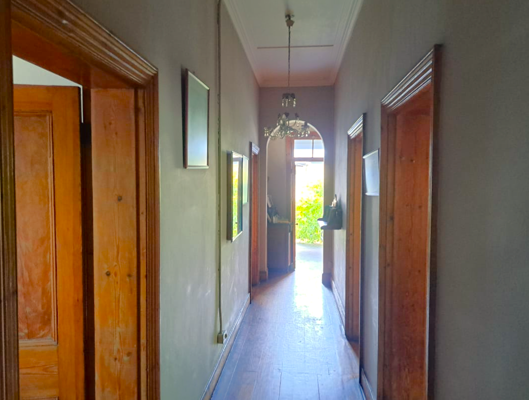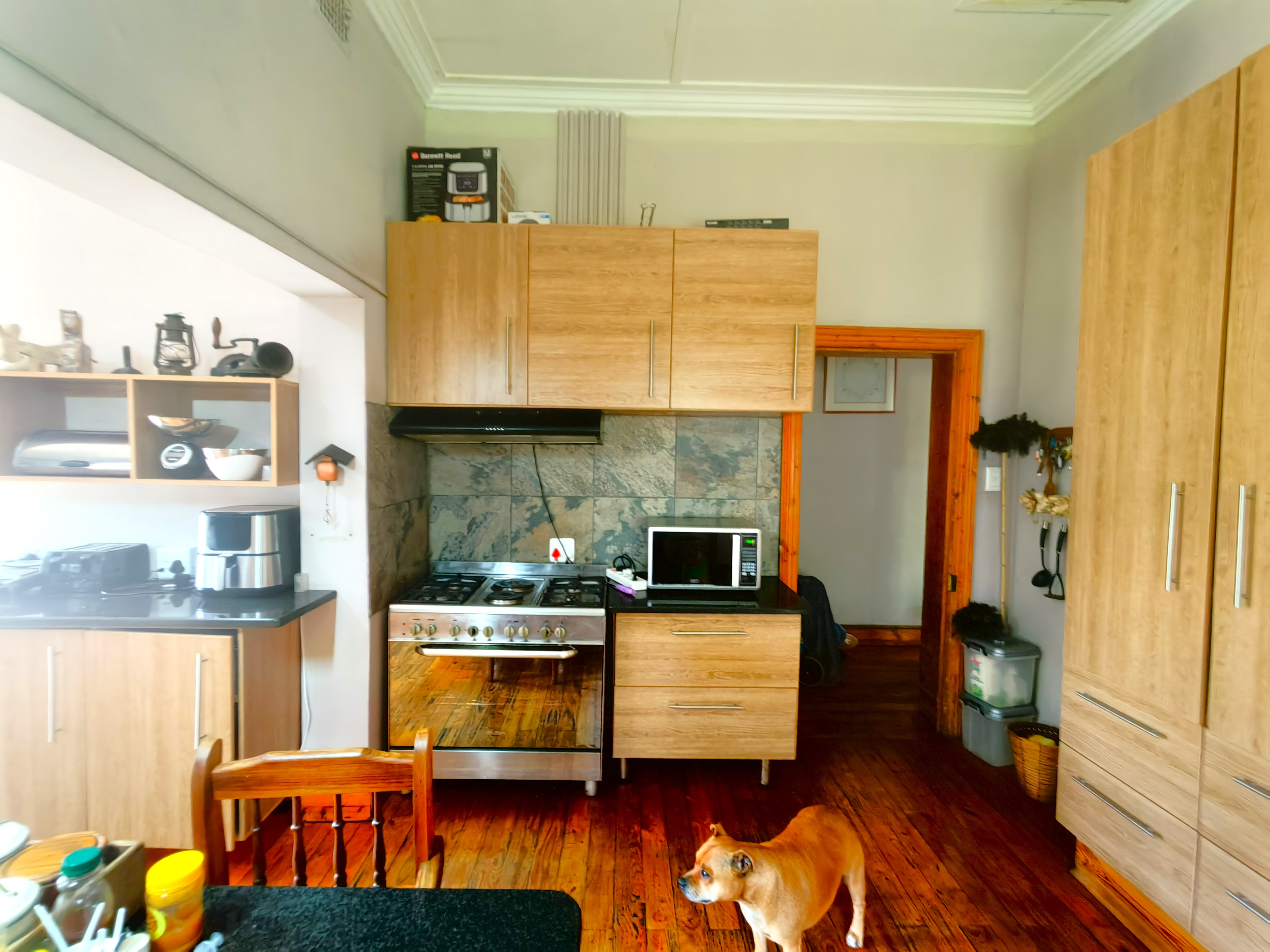 The home features high ceilings, Cape Dutch sash windows, and beautifully preserved wooden floors. The spacious lounge, complete with a fireplace, opens to a large kitchen with a granite breakfast nook, gas hob, and electric oven.