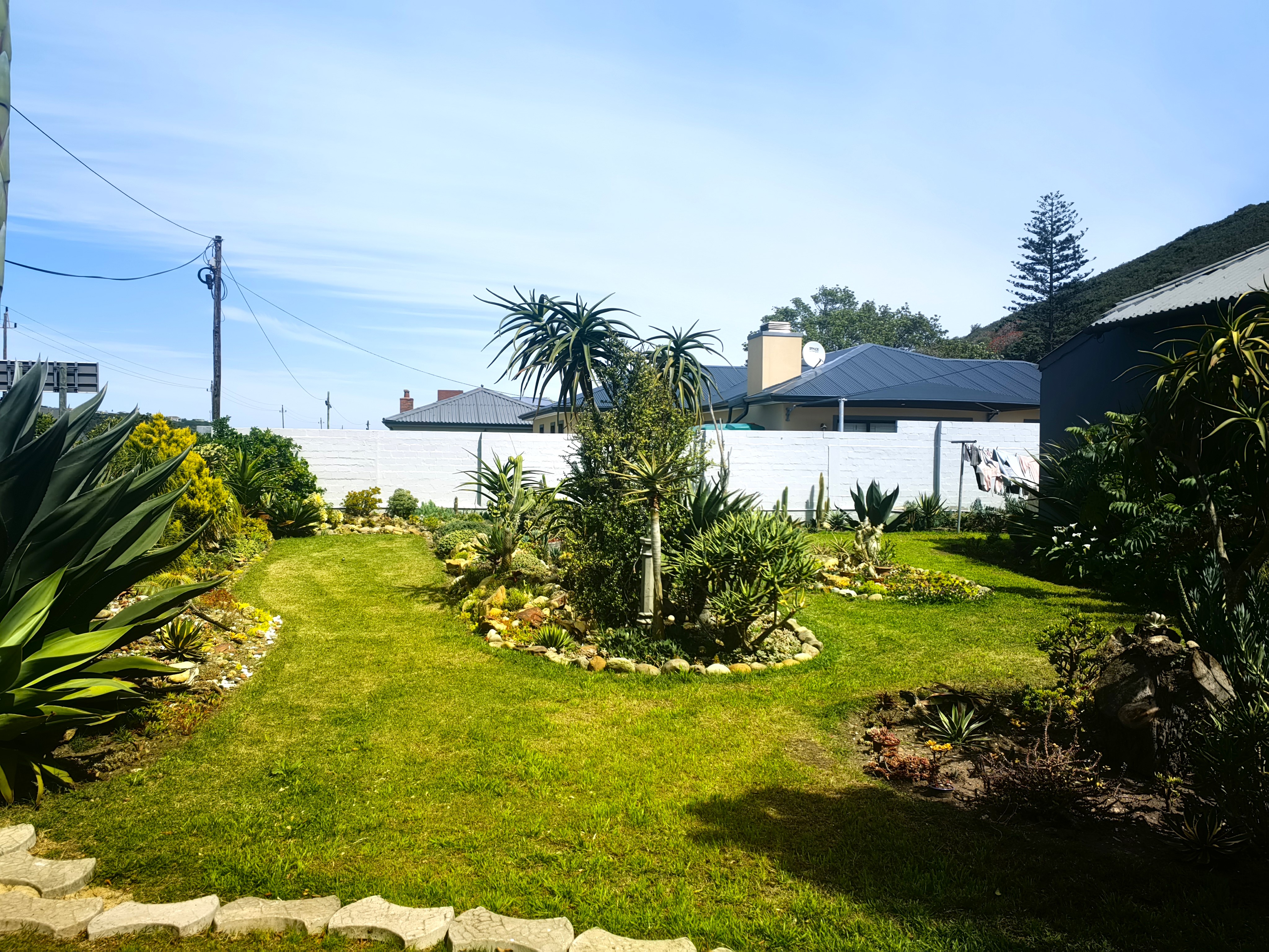 Three bedrooms include vintage wooden wardrobes, and the bathroom boasts a clawfoot tub and stone flooring. Outside, a covered patio leads to a beautifully landscaped garden filled with succulents.