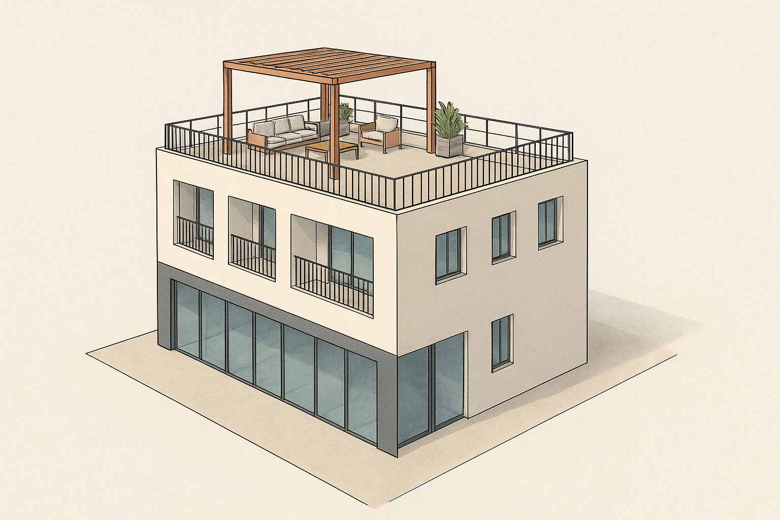 Rooftop terrace: entertainment or shared leisure area, under verandah, building has a total height restriction of 12m.