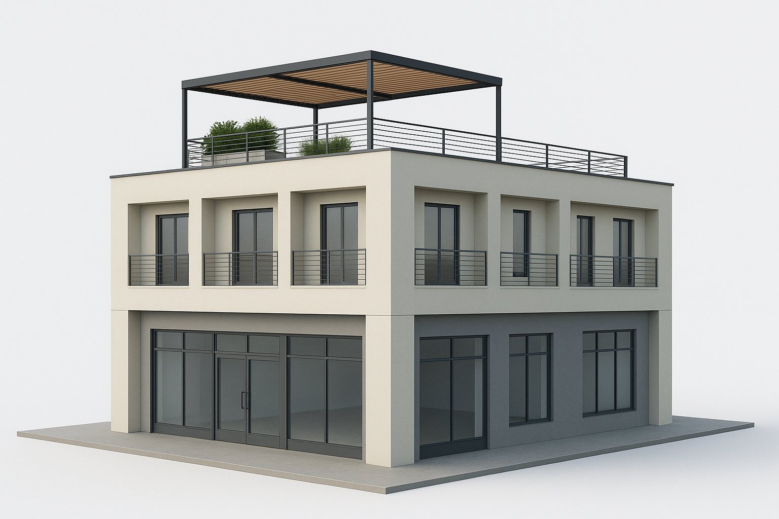 Ground floor (±500 m2 building): boutique retail, gallery, café, or destination restaurant space, 4m height, parking space for 20+ vehicles and on-ramp(400m2 parking area)