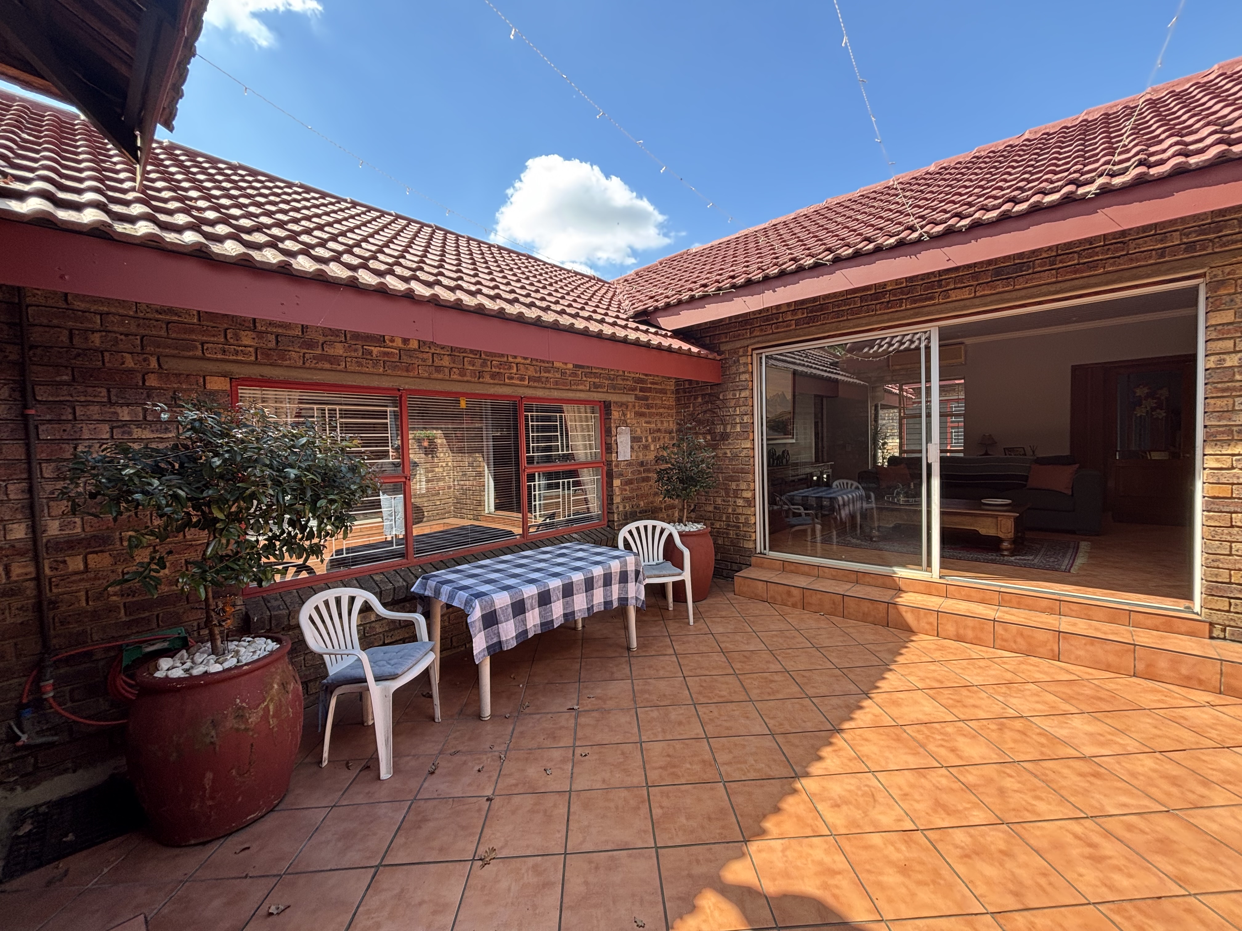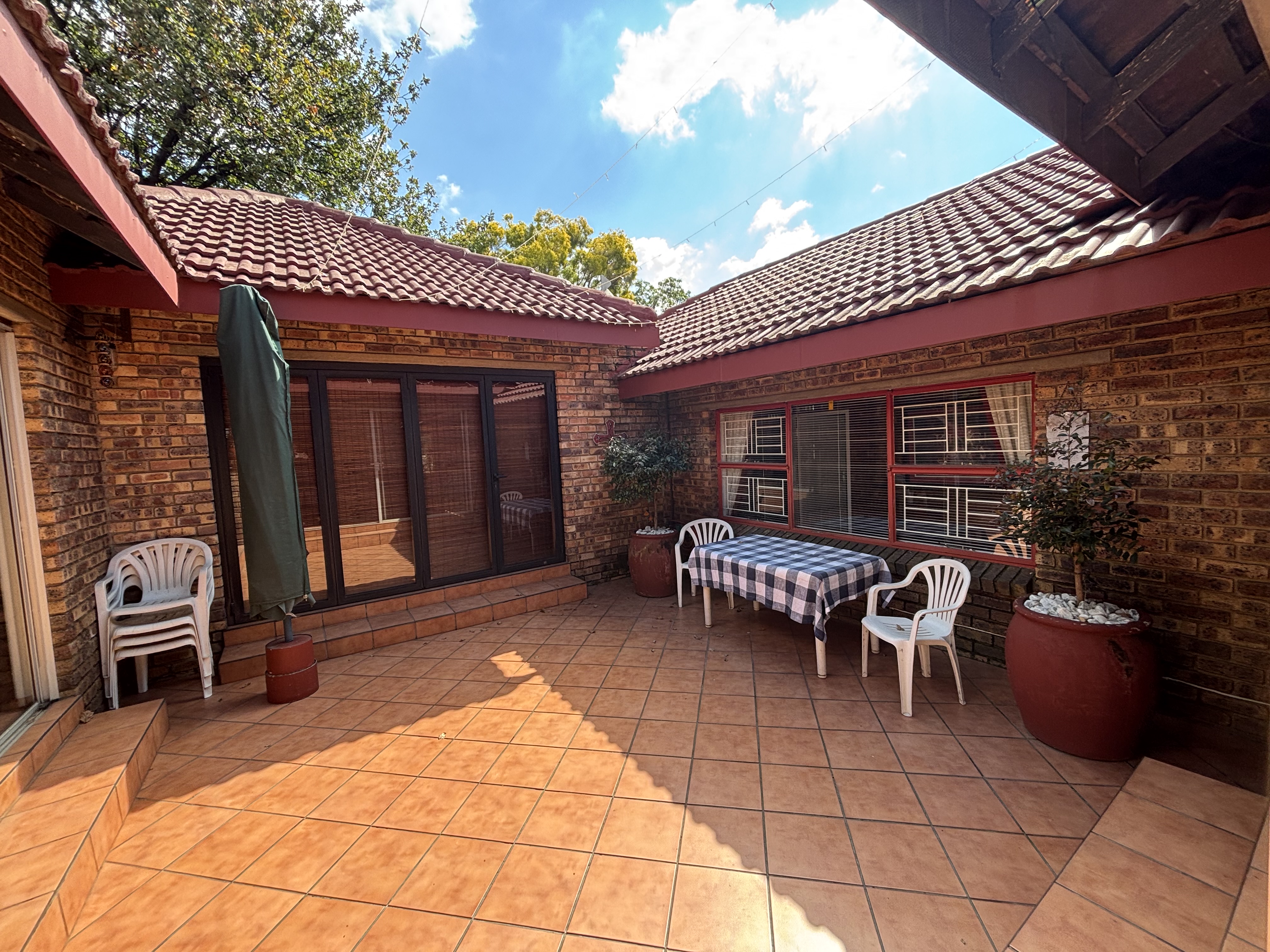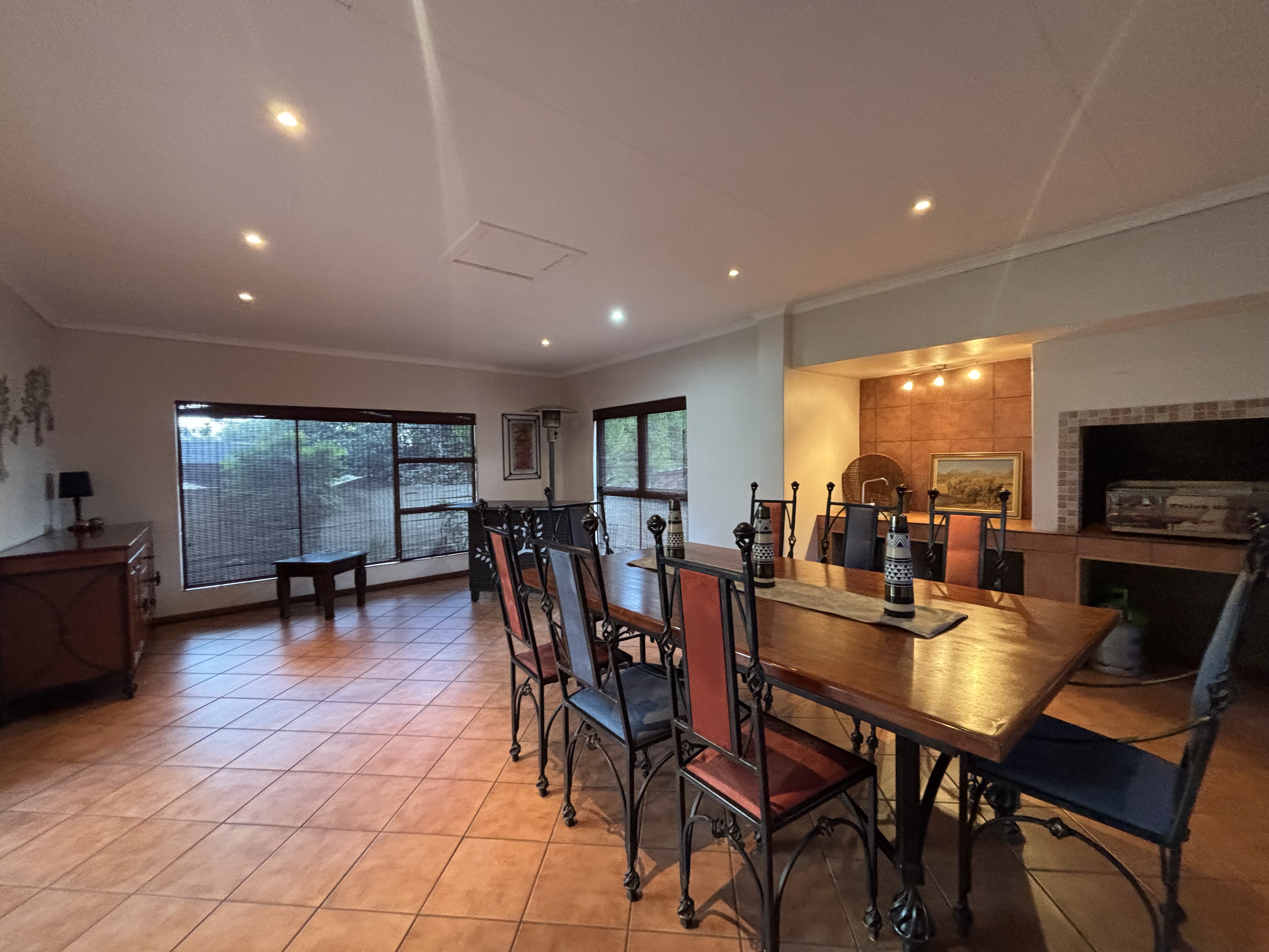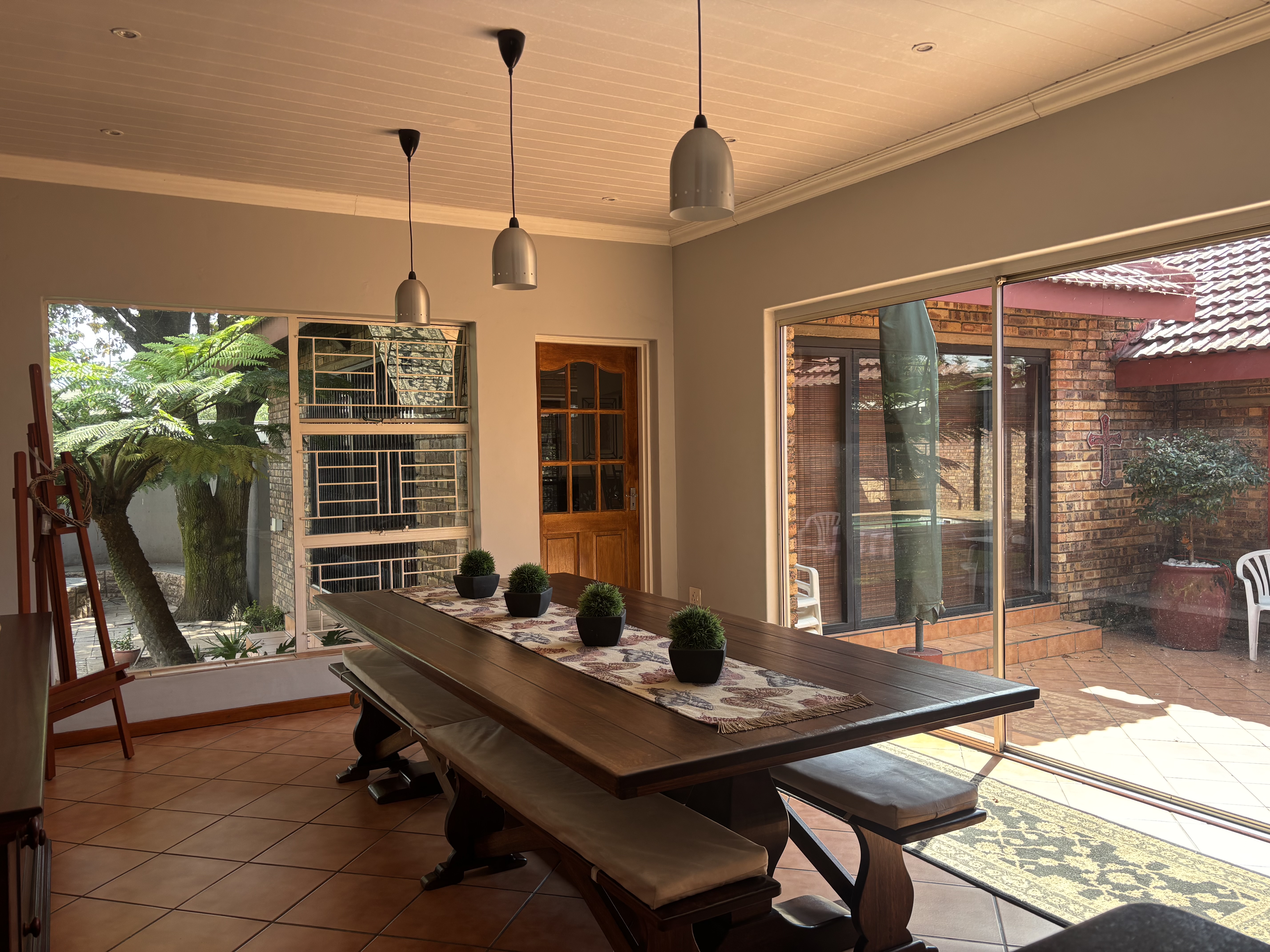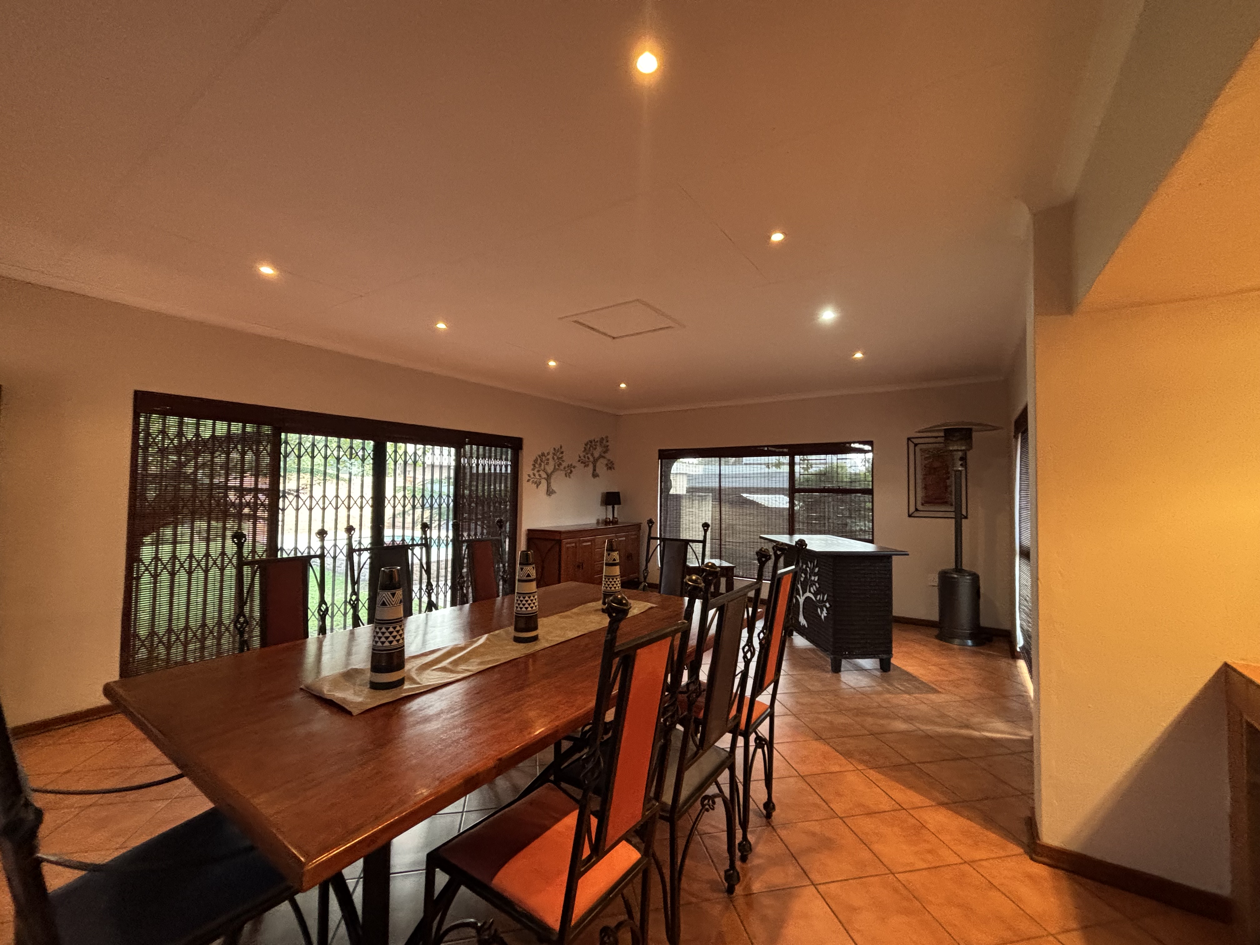 A private patio is centrally positioned, accessible via sliding doors from both the living and dining areas. The enclosed entertainment space, complete with a built-in braai, is perfect for hosting gatherings during the winter months. This area seamlessly extends to the back garden, which features a lovely pool and boma area. The property also includes a double garage and carports for added convenience.