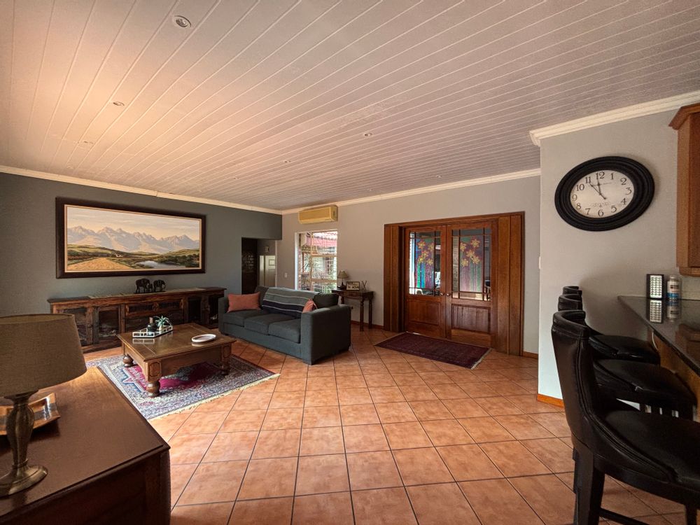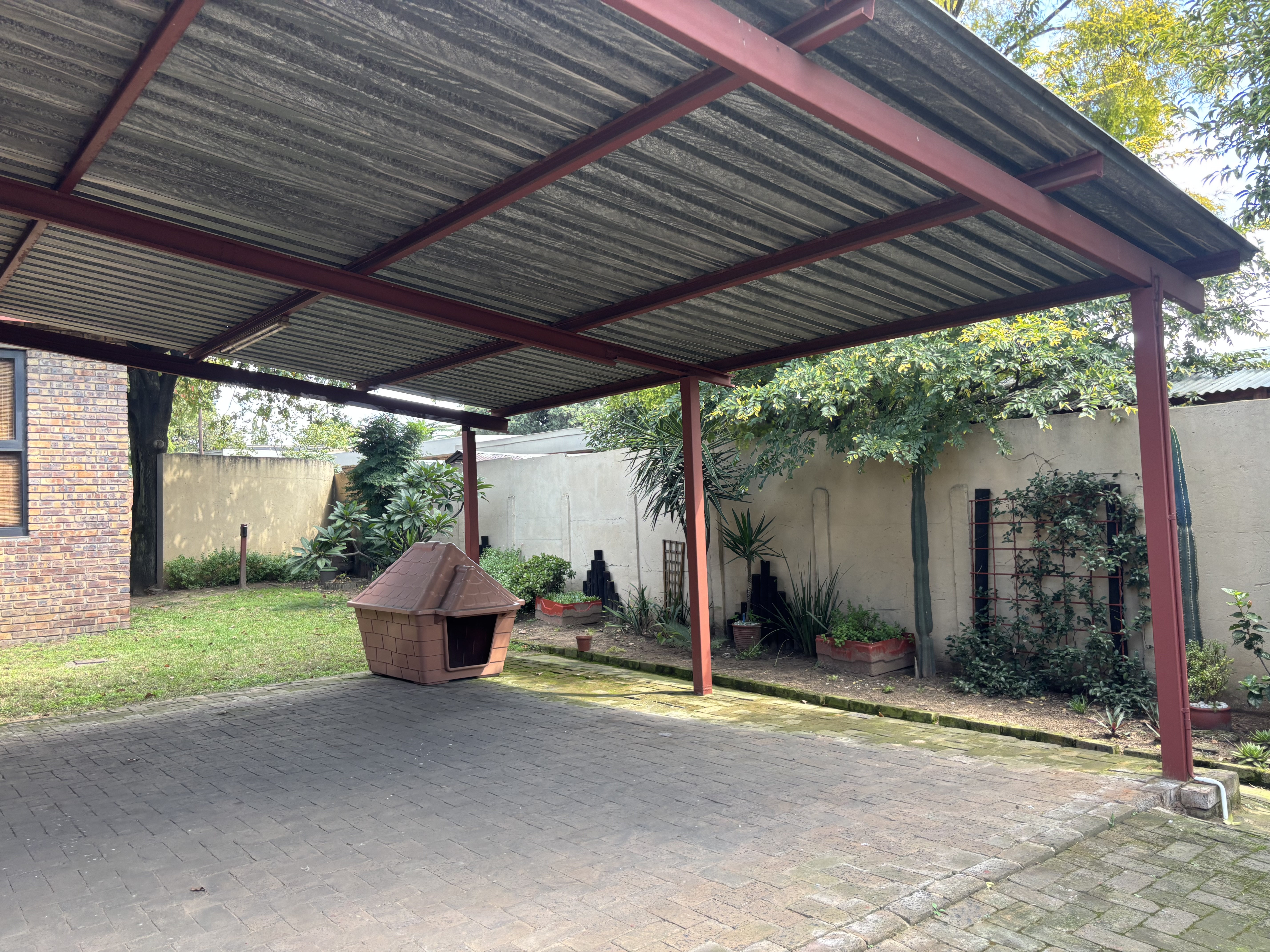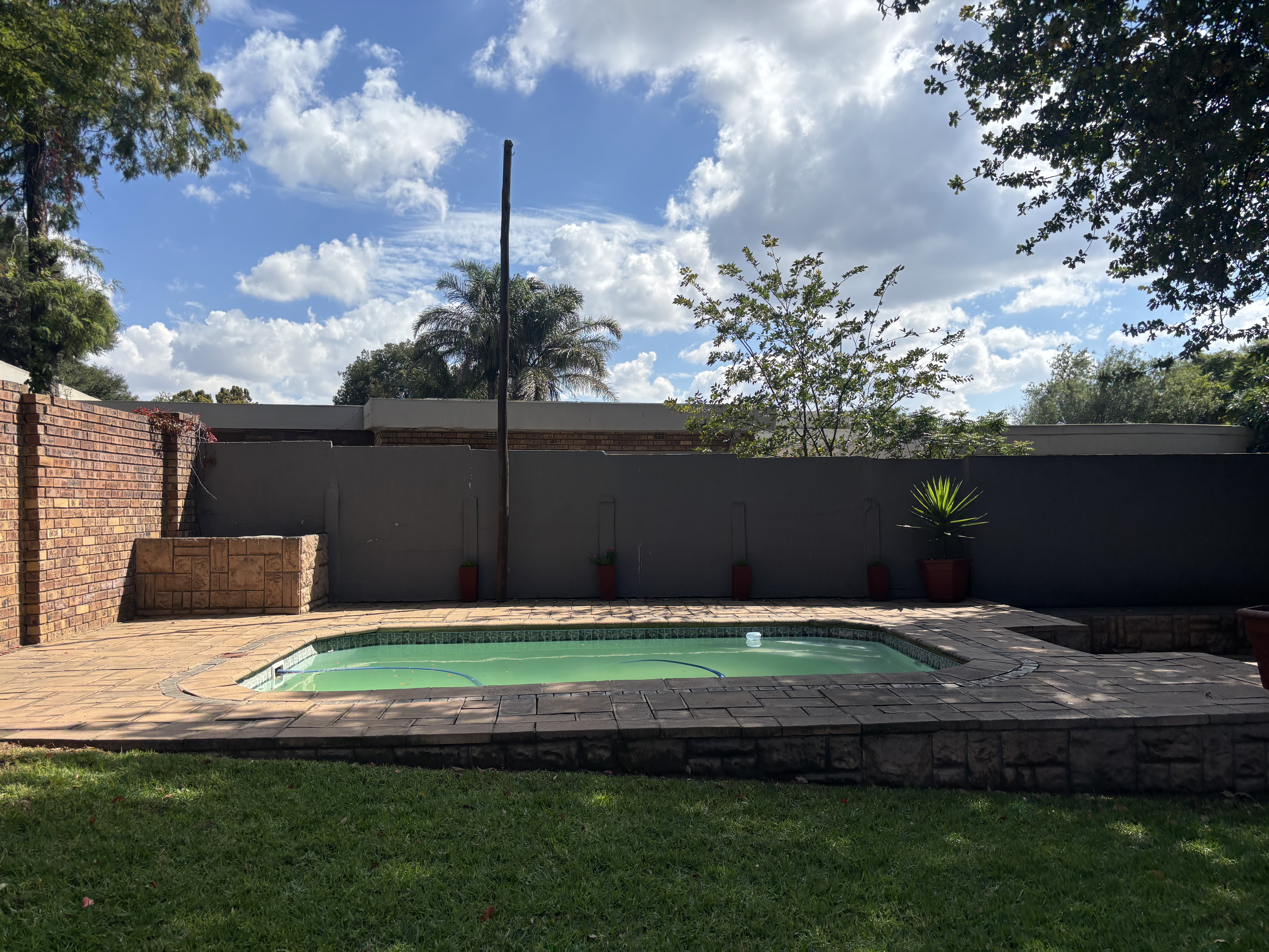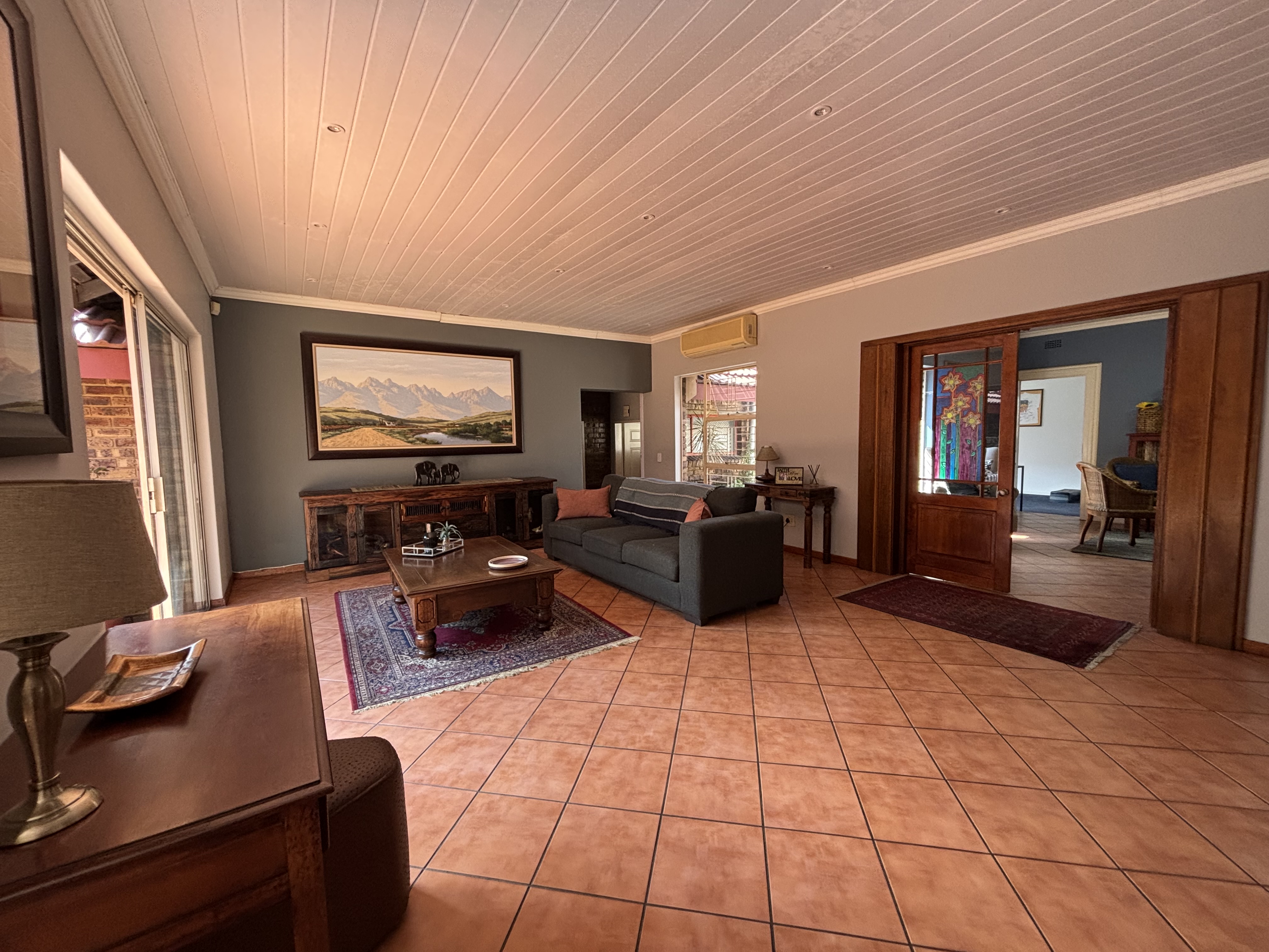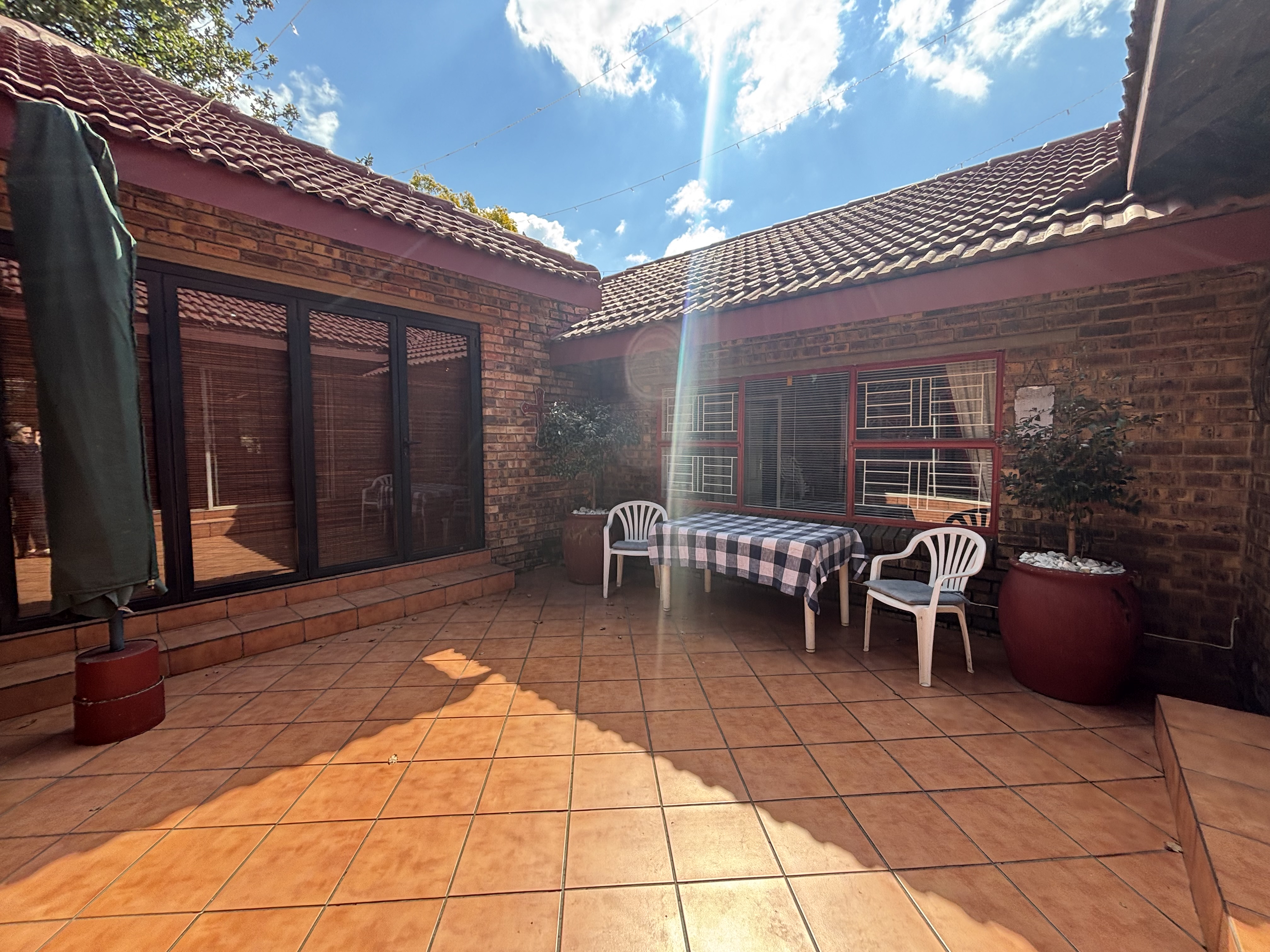 A private patio is centrally positioned, accessible via sliding doors from both the living and dining areas. The enclosed entertainment space, complete with a built-in braai, is perfect for hosting gatherings during the winter months. This area seamlessly extends to the back garden, which features a lovely pool and boma area. The property also includes a double garage and carports for added convenience.